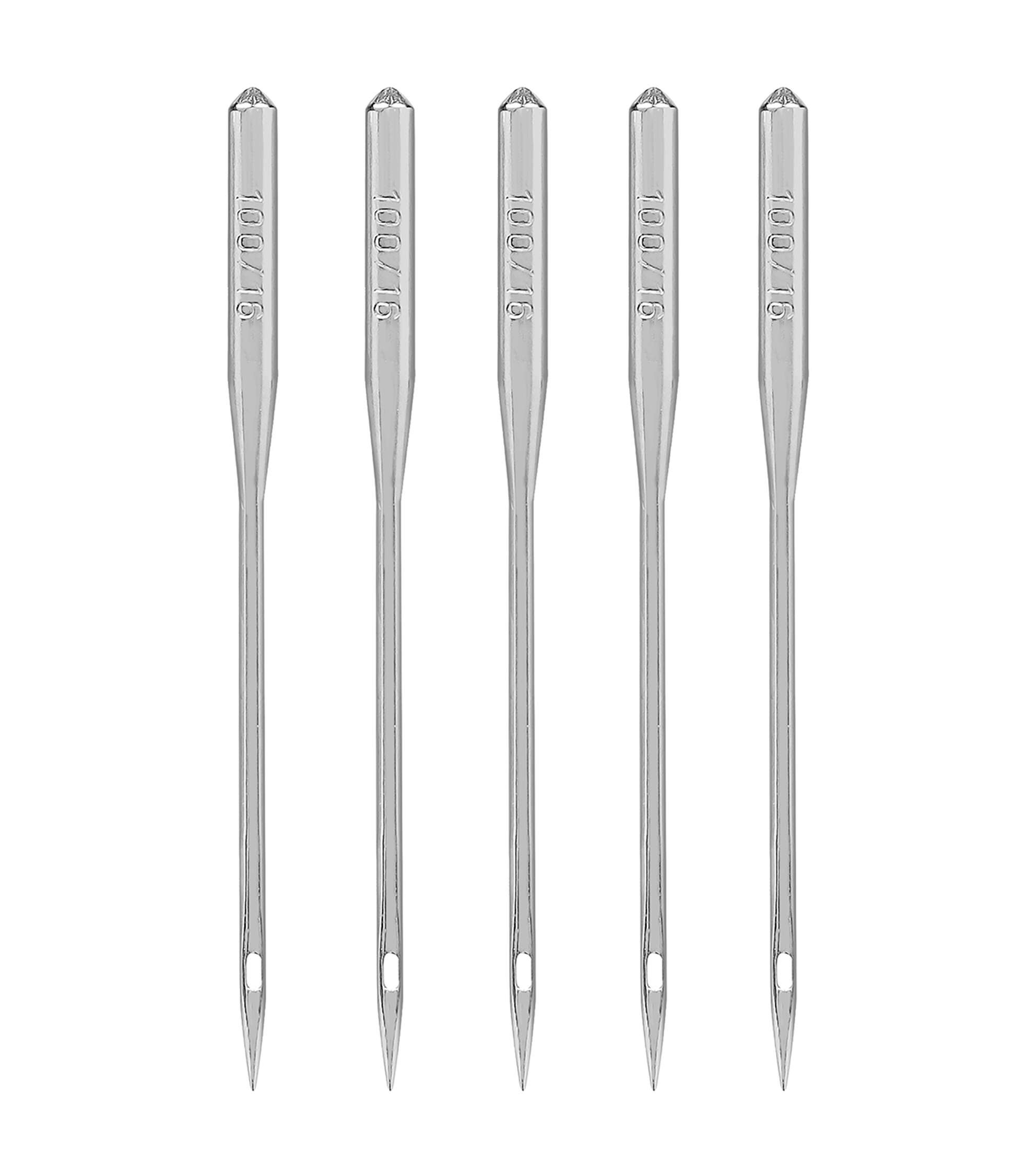 - Top Notch Universal Machine Needles in Size 100/16 are a set of 5 sewing machine needles for use with heavyweight fabric. Coated with durable nickel-plated steel, these heavy duty machine needles are universal, meaning they are compatible with most household domestic sewing machine. Size 100/16 needles are ideal for heavyweight fabrics like denim, leather, upholstery, and other heavyweight fabrics . Crafted from durable, nickel-plated steel, these strong sewing machine needles are built to last. For safety, keep these and all needles away from children. The set comes in a transparent compact case that shows the sizes marked on its cover so you can keep your needles neat and organized. This versatile machine needle set is the perfect starter set for your sewing machine supplies kit.