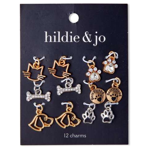Show your love for your pet with the hildie & jo Pet Charms. It includes 12 charms sporting a silver or gold tone. Two of the pairs are paw shaped and two resemble cat and dog faces. Disc charms flaunting the words ‘Best Friend’ and bone-shaped charms complete this pack.