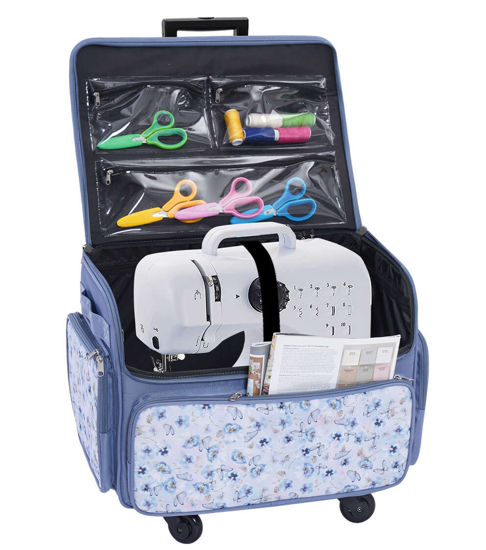 This stylish tote features a beautiful printed fabric design that is sure to turn heads. The four wheels make it easy to transport your supplies from one location to another, while the durable 100% polyester construction ensures that your tote will last for years to come.