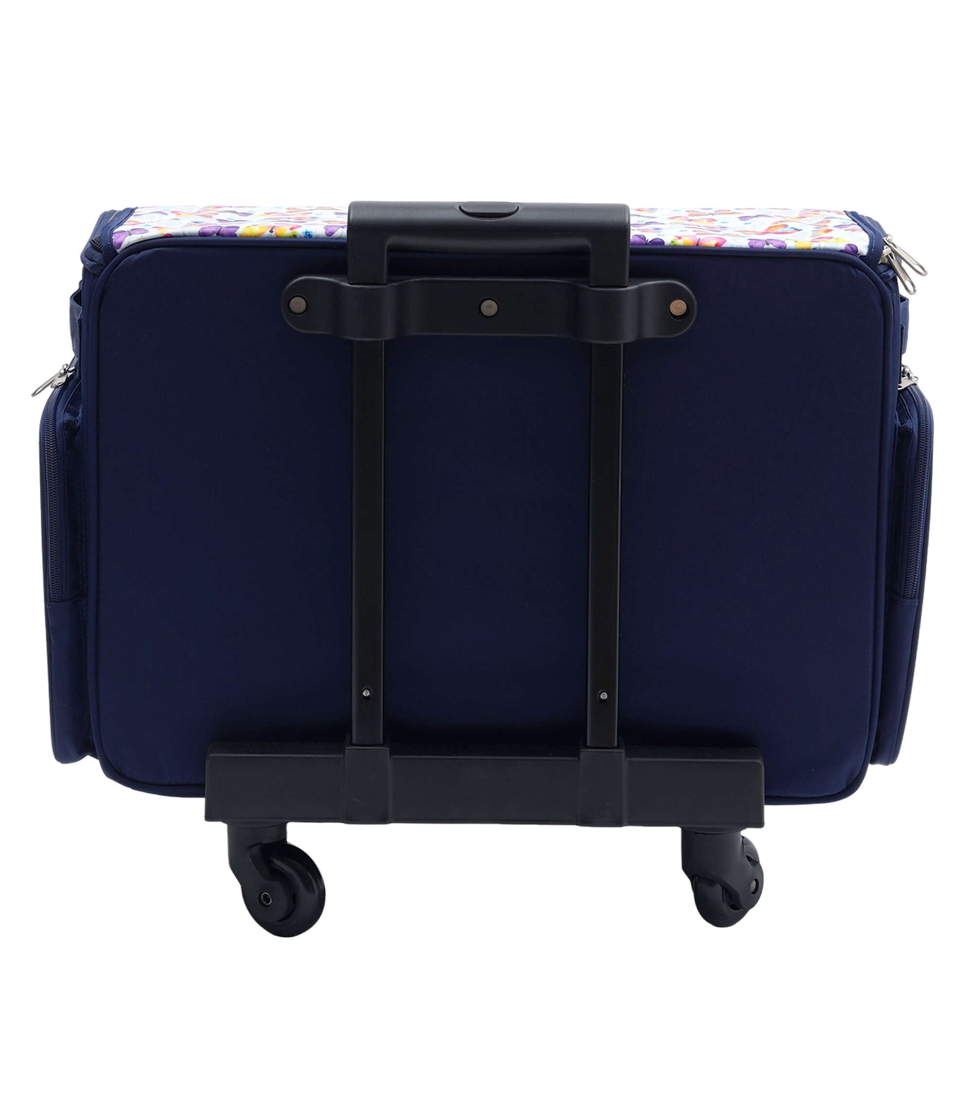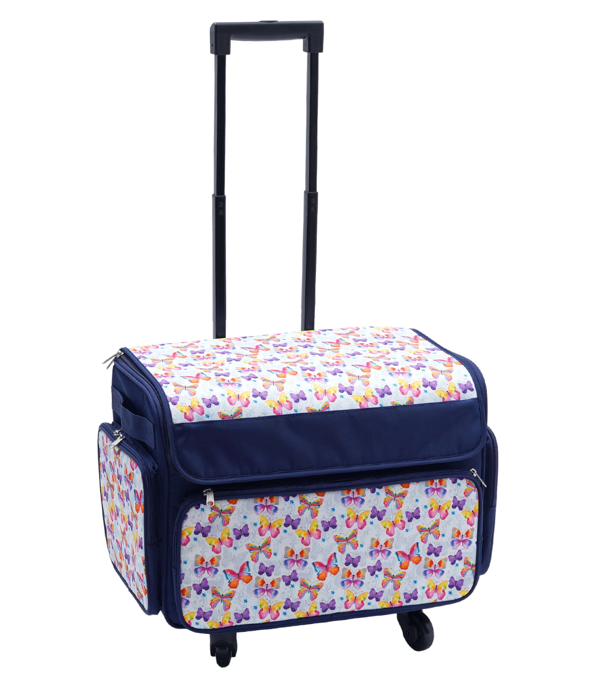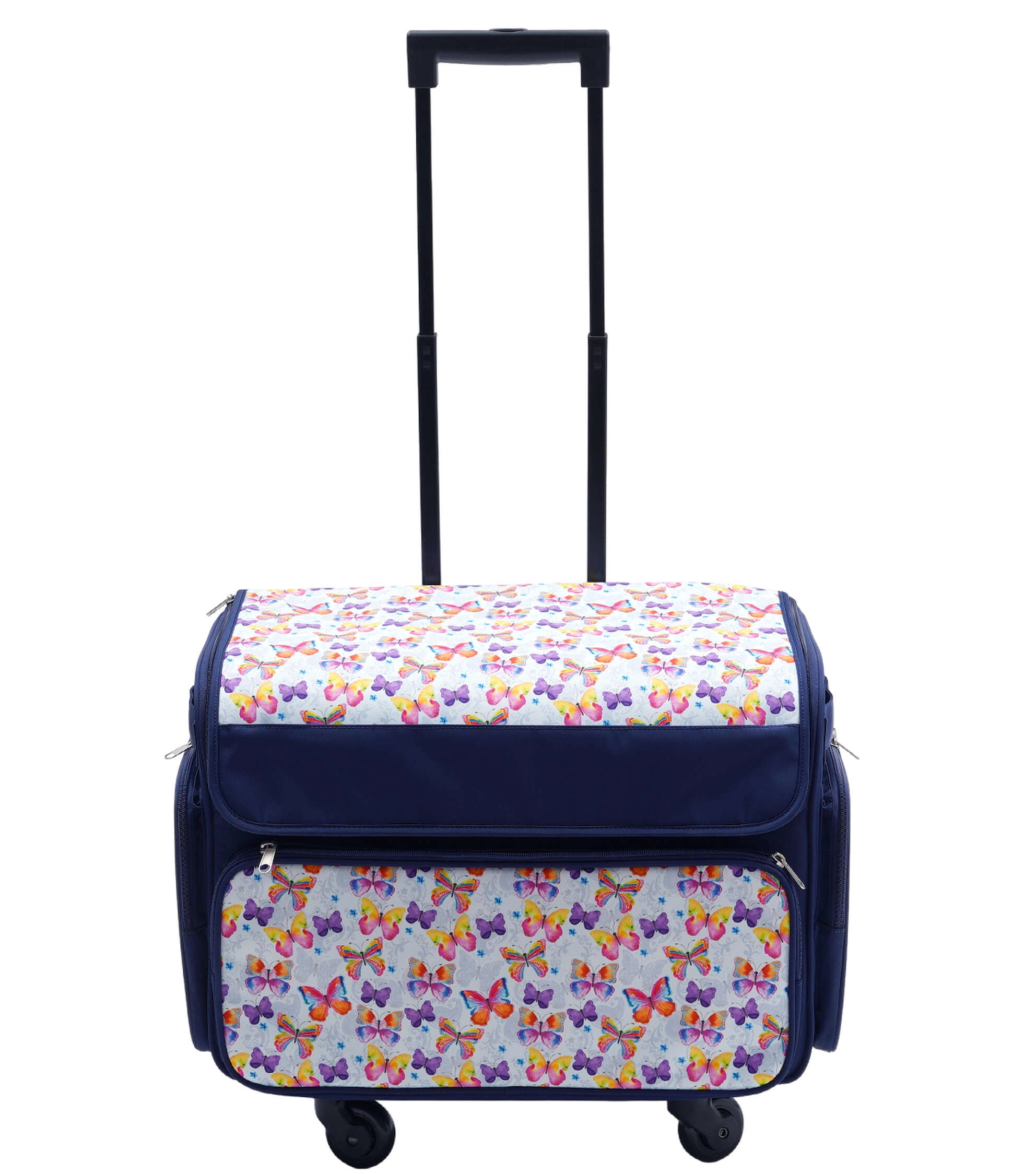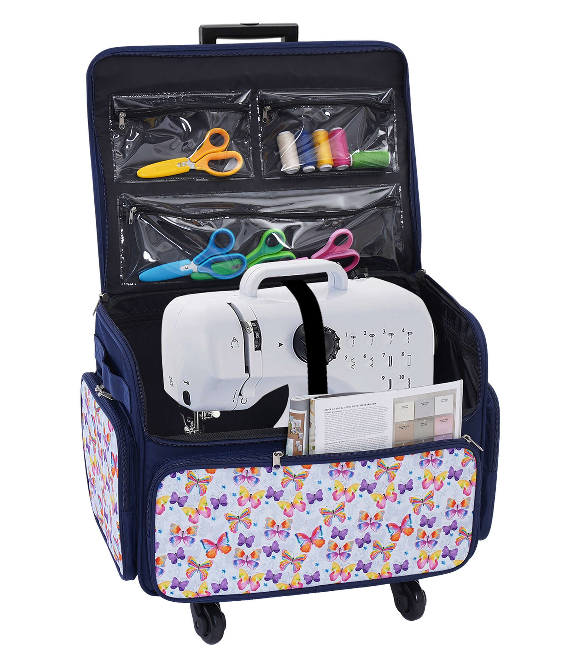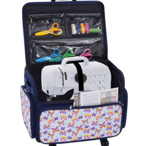 Organize your sewing essentials in this beautiful Purple Butterflies Rolling Sewing Storage Tote by Top Notch. Made with 100% polyester, this tote is durable and long lasting. The printed fabric adds a touch of elegance to your sewing room. Measuring 13″ x 18″ x 21″, this tote is spacious enough to store your sewing machine, fabrics, and other sewing accessories. The four wheels make it easy to move around and the sturdy handle ensures easy carrying.