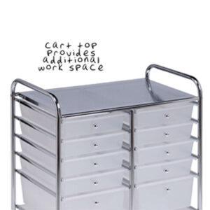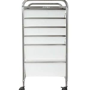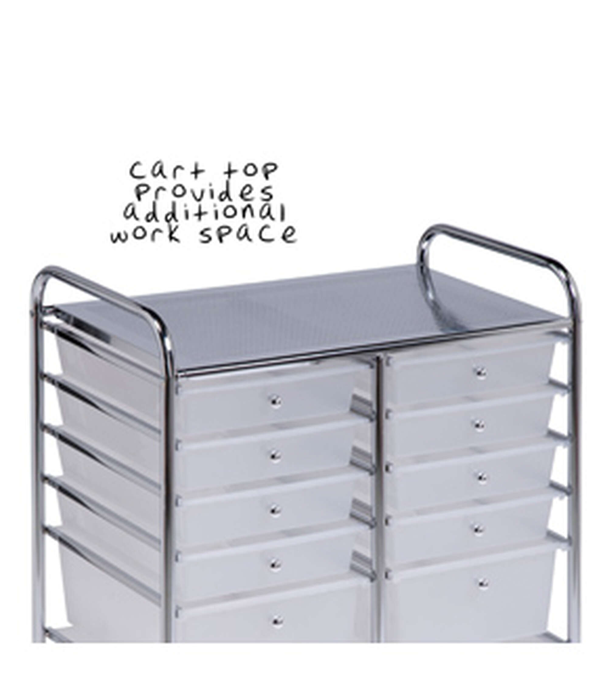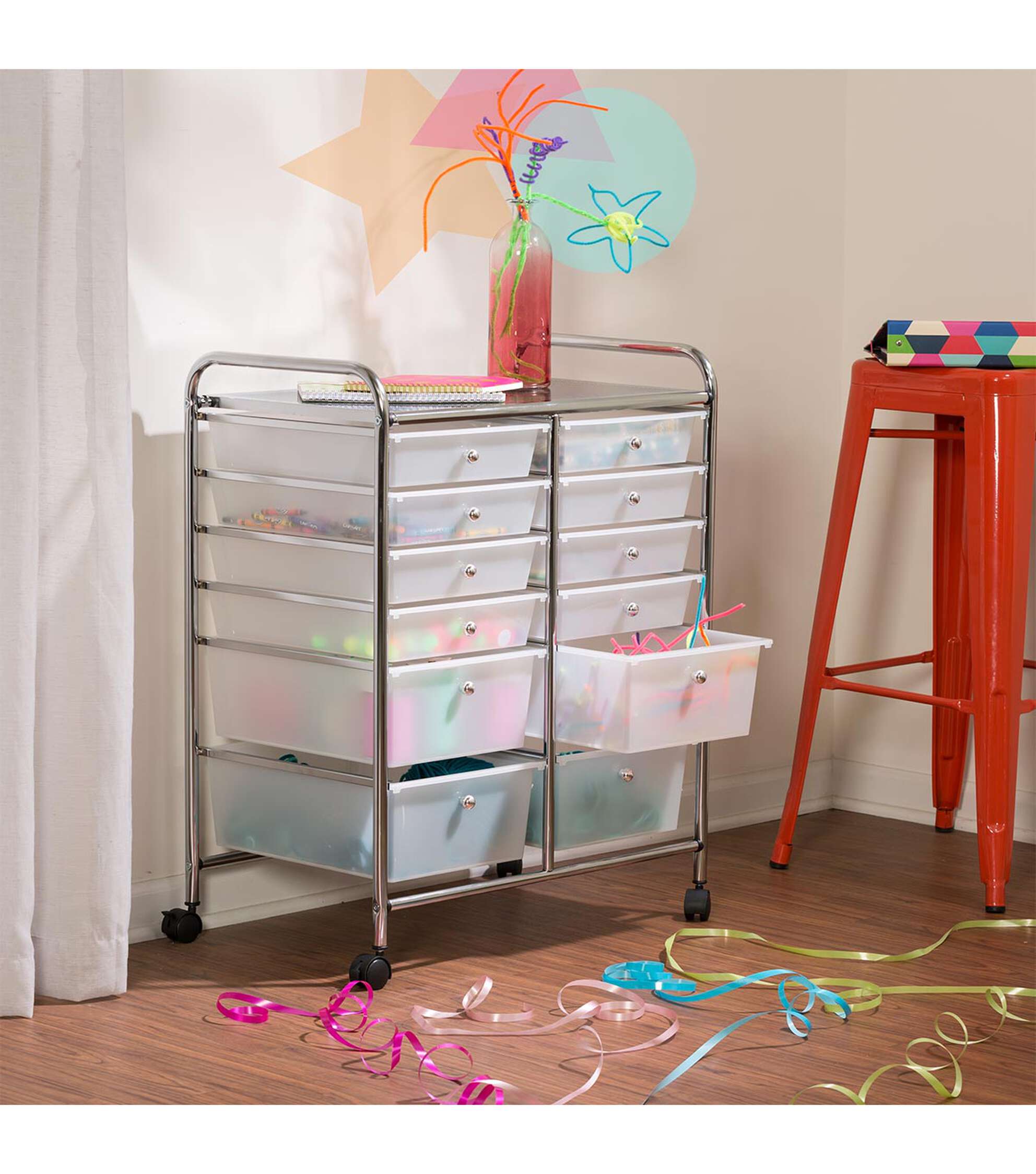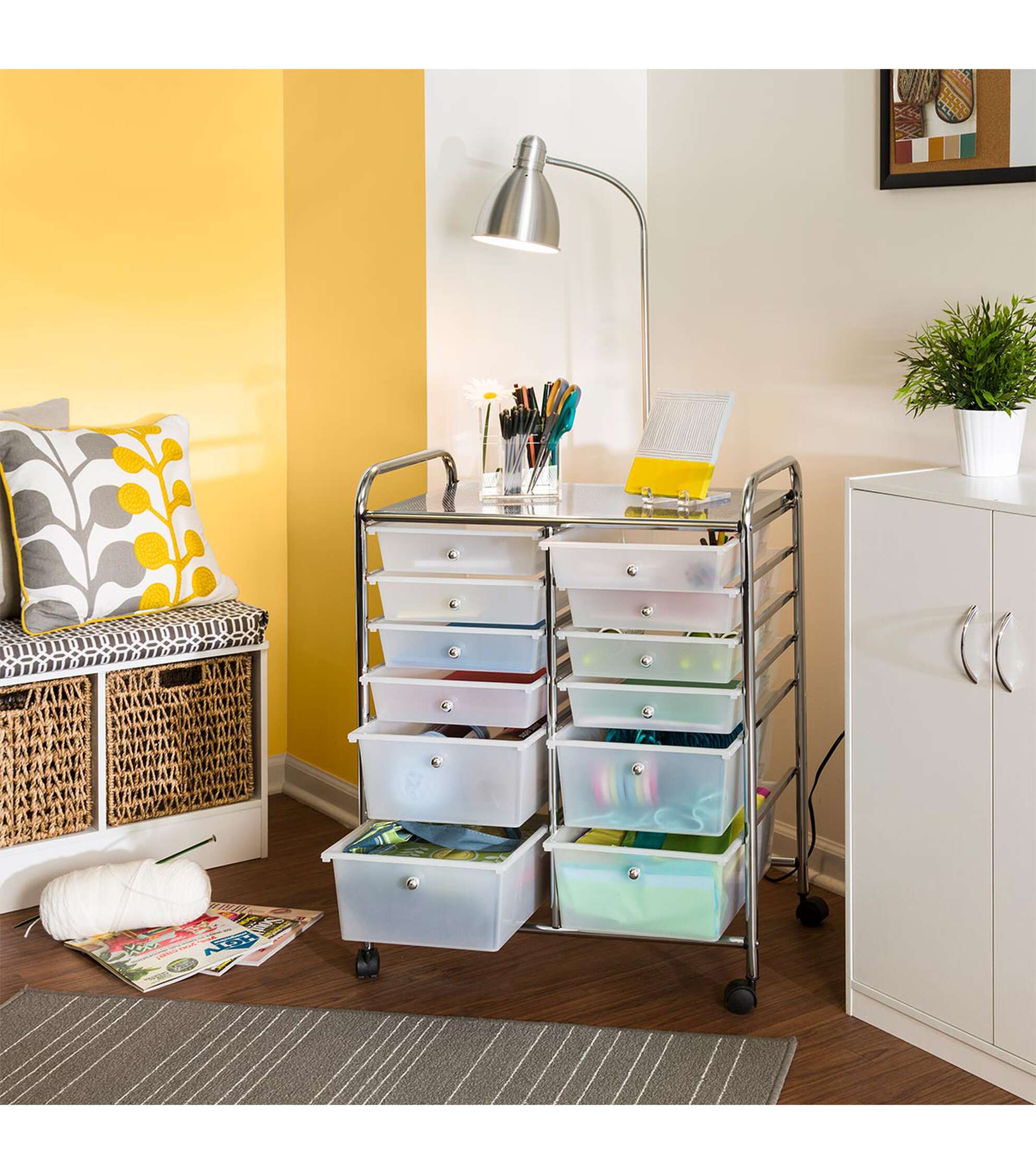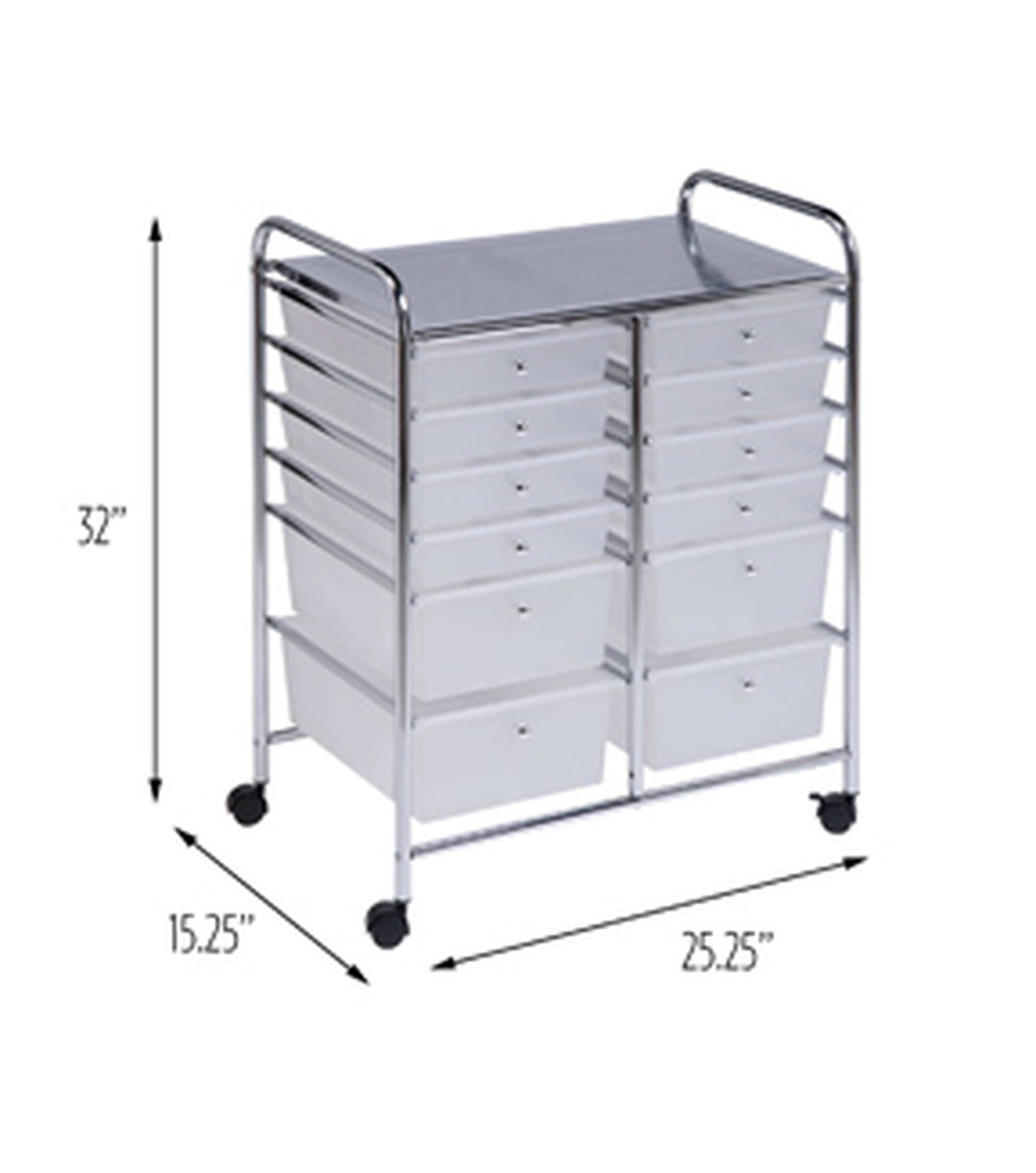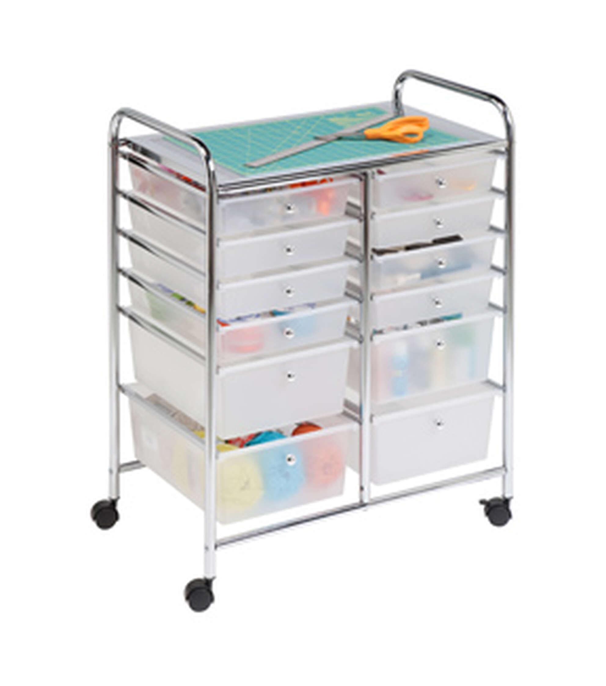 While we dream of the perfect home office (ample space, perfect lighting, immaculate shelving), we accept current circumstances where “home office” is a transitory term. Sometimes, it’s our kitchen table, others the guest bedroom, and once, in a moment of desperation brought on by a weak” signal, the stairwell. And for a home office that transitions across spaces, there is no better companion for the journey than this metal rolling storage cart. Its Locking wheels and ample tabletop surface make it the perfect pop-up work station. The two columns of varied sized drawers divvy up supplies equitably, so that multiplication tables don’t get mixed up with monthly business reports. One day, we might have a dream home office. Until then, it’s hard not to enjoy the command-center feeling brought on each time this 12-drawer rolling metal storage cart voyages through our home’s hallways. Create a work or study station wherever and whenever you need it.Doubles as a craft cart for arts & crafts storage.Assign drawers to specific supplies or people as your home office needs evolve.Polished chrome frame with semi-transparent drawers of two sizes.Locking wheels secure the cart to work on its ample tabletop surface. DIY assembly with tools and instructions included.