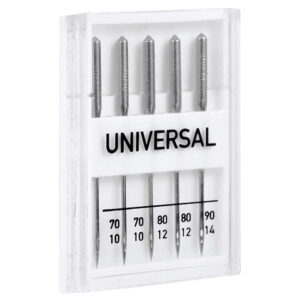- Top Notch Universal Machine Needles in Assorted Sizes are a set of 5 sewing machine needles for use with most woven and knit fabrics. Coated with durable nickel-plated steel, these all-purpose machine needles are universal, meaning they are compatible with most household domestic sewing machine. Select the needle size based on the type and weight of your fabric. The set includes two size 70/10 needles designed for use with very sheer or lightweight fabrics, two 80/12 needles for lightweight fabrics, and one 90/14 needle for use with medium weight fabrics. Crafted from durable, nickel-plated steel, these strong sewing machine needles are built to last. For safety, keep these and all needles away from children. The set comes in a transparent compact case that shows the sizes marked on its cover so you can keep your needles neat and organized. This versatile machine needle set is the perfect starter set for your sewing machine supplies kit.