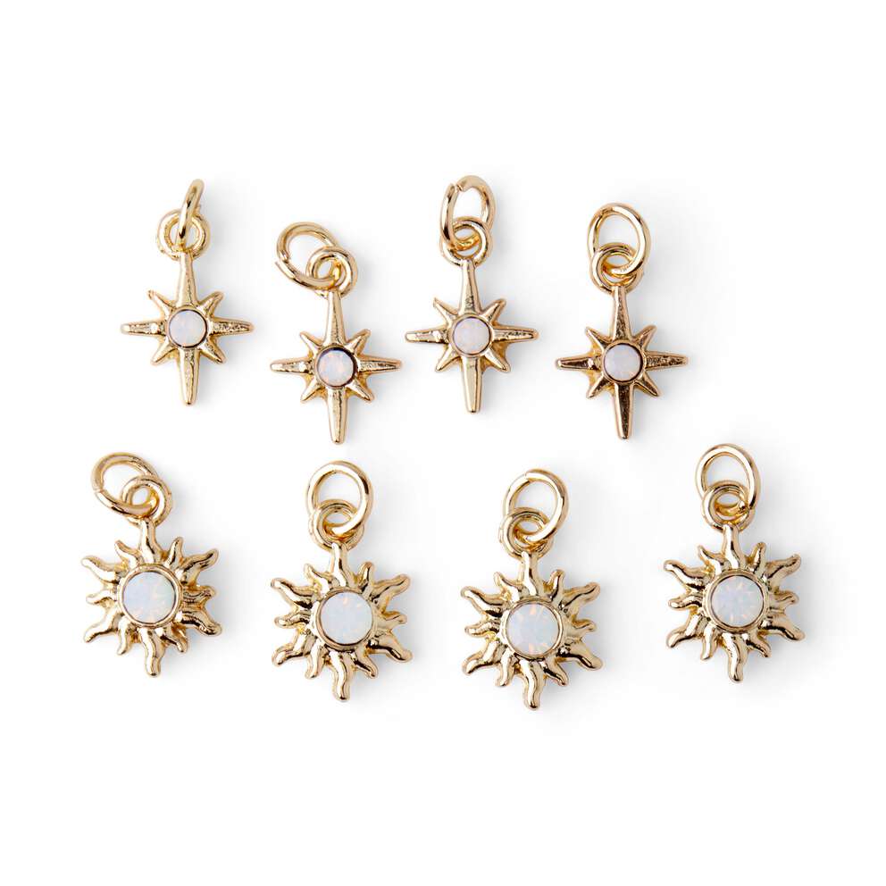 Eye-catching and interesting, the hildie & jo Sun & North Star Charms are just what you need to create unique jewelry pieces. This pack includes eight gold-toned charms. They are shaped like the Sun and North star and are adorned with a white stone. You can add them to the gift basket of a friend who likes making custom jewelry.