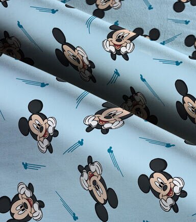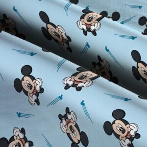 This Mickey Icon Swoosh fabric is designed with Mickey heads and mickey icon swoosh on a light blue background. This fabric would be perfect for crafting throw blankets or bedding. This is 100% cotton and machine washable.