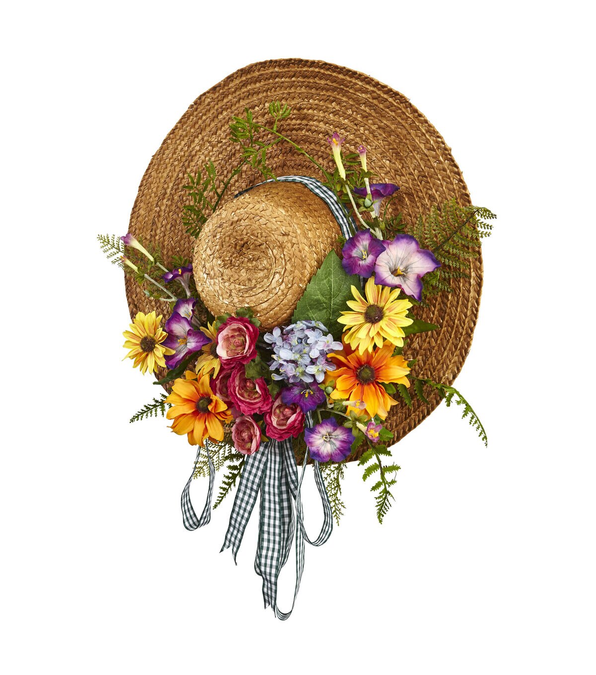 Replace traditional wreaths with farmhouse charm as springtime florals drape along the brim of a large, straw sun hat. Mixed faux florals in brilliant shades of color, bundle with gingham ribbon to create a French country inspired entryway. 18″ hat wreath offers a pop of year-round color.Silk floral arrangements are manufactured using synthetic materials and are well designed and constructed to be life-like in appearance.
