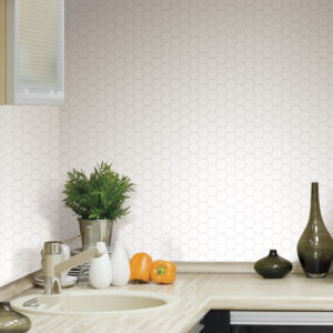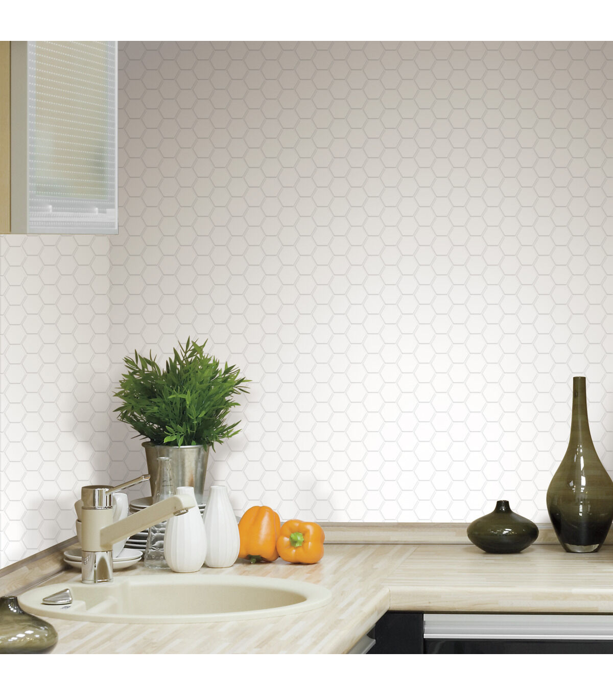 Looking to update a kitchen or bathroom? Makeover your walls and create a designer backsplash in no time with these Peel & Stick Pearl Hexagon STICKTILES from RoomMates Decor. Fast, fun and affordable, STICKTILES ?look and feel like genuine tiles and application could not be easier. Just peel and stick to any flat surface. No need for cement or grout.STICKTILES? are made of a flexible epoxy material that is easy to cut (with a utility knife or scissors) so you can work around tricky spots, spaces and corners. Installing StickTiles reduces your installation time by over half! Can be applied over existing glass or ceramic tiles!