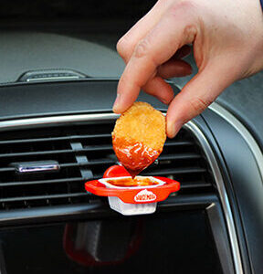 Vehicle sauce holder for ketchup and dipping sauces. Saucemoto is the solution for the age-old problem of creating a mess in your car, or worse – sauce-less food. Stop dipping irresponsibly, practice safe sauce with the Saucemoto dip clip.
