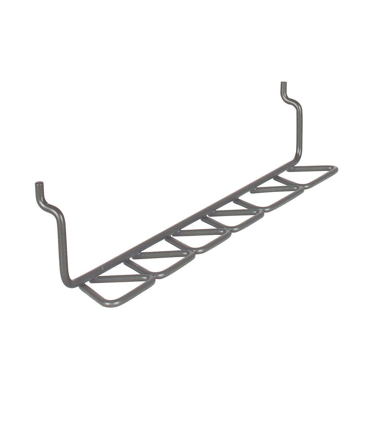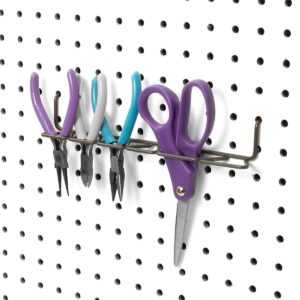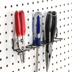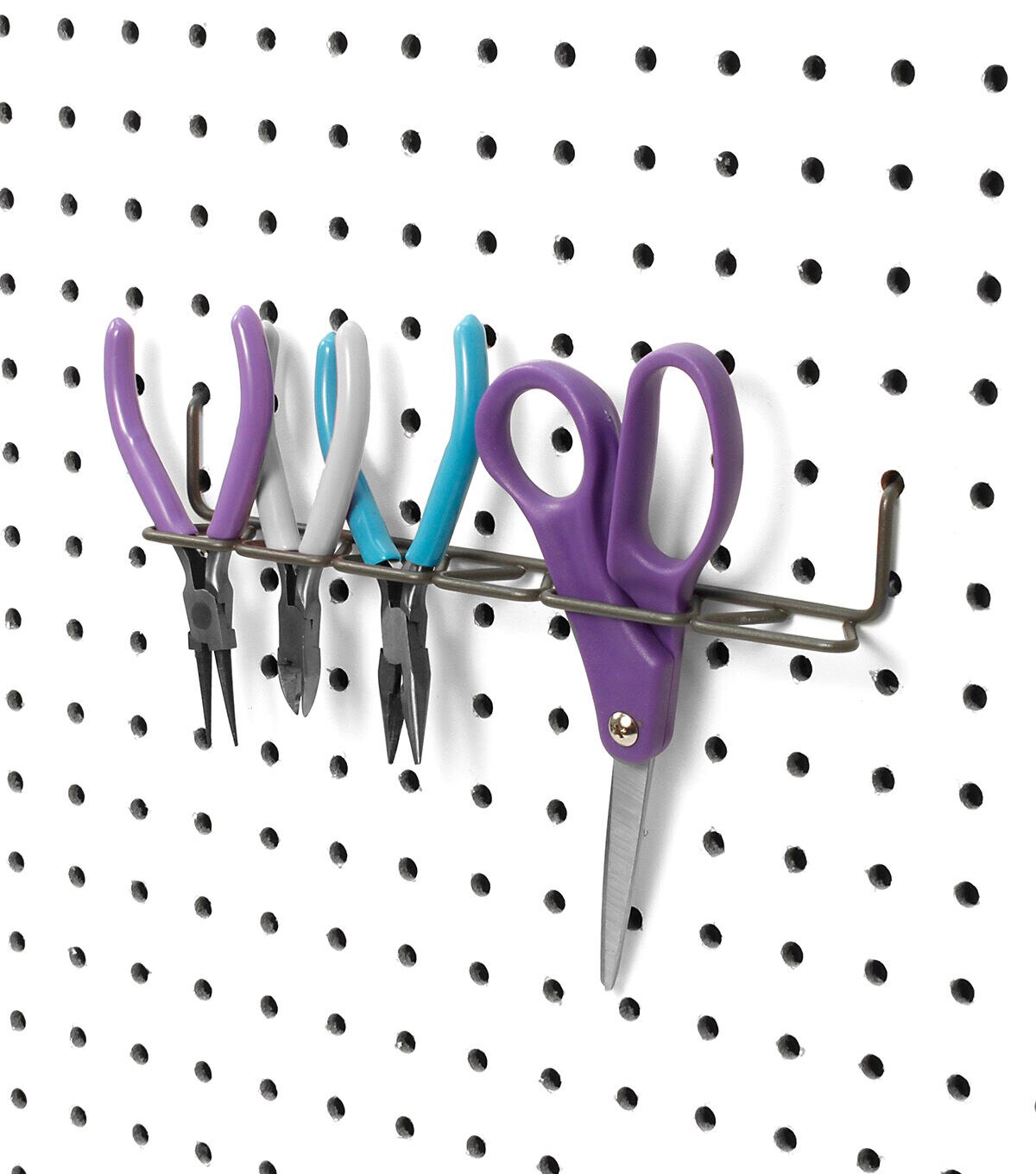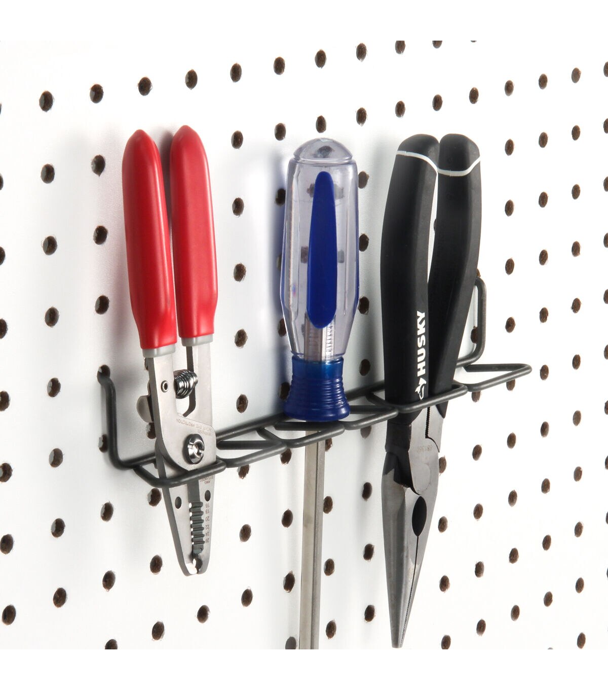 Keep household tools neatly organized and kept in sight with the Spectrum Pegboard Multi-Tool Holder. It holds up to 11 small hand tools such as screw drivers, paint brushes and scissors. Simply slide the tool holder into installed pegboard with 0.25-inch pegboard holes spaced 1-inch apart, center to center or slat wall for quick and easy storage. Made of sturdy steel, it’s perfect for the garage, workspace or craft room.