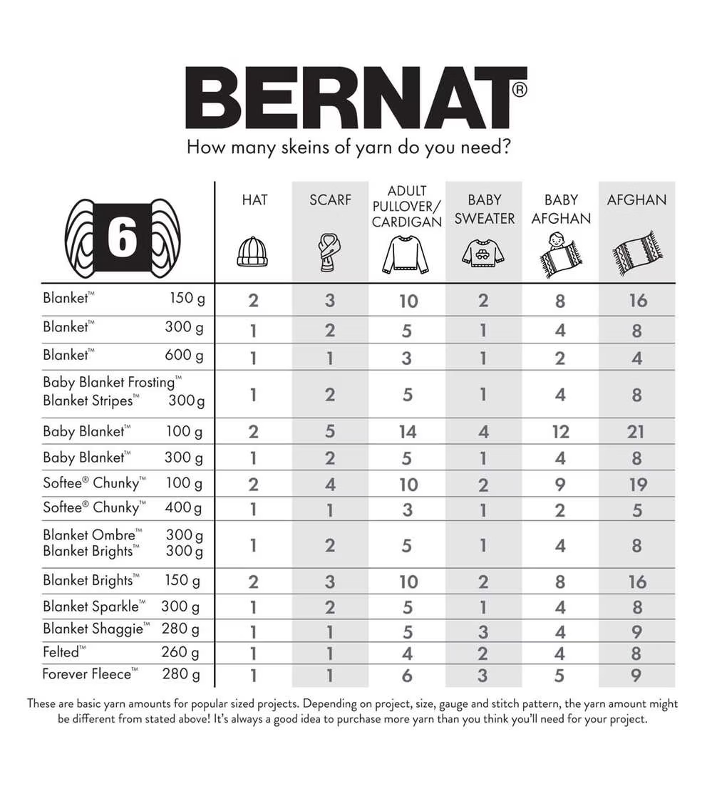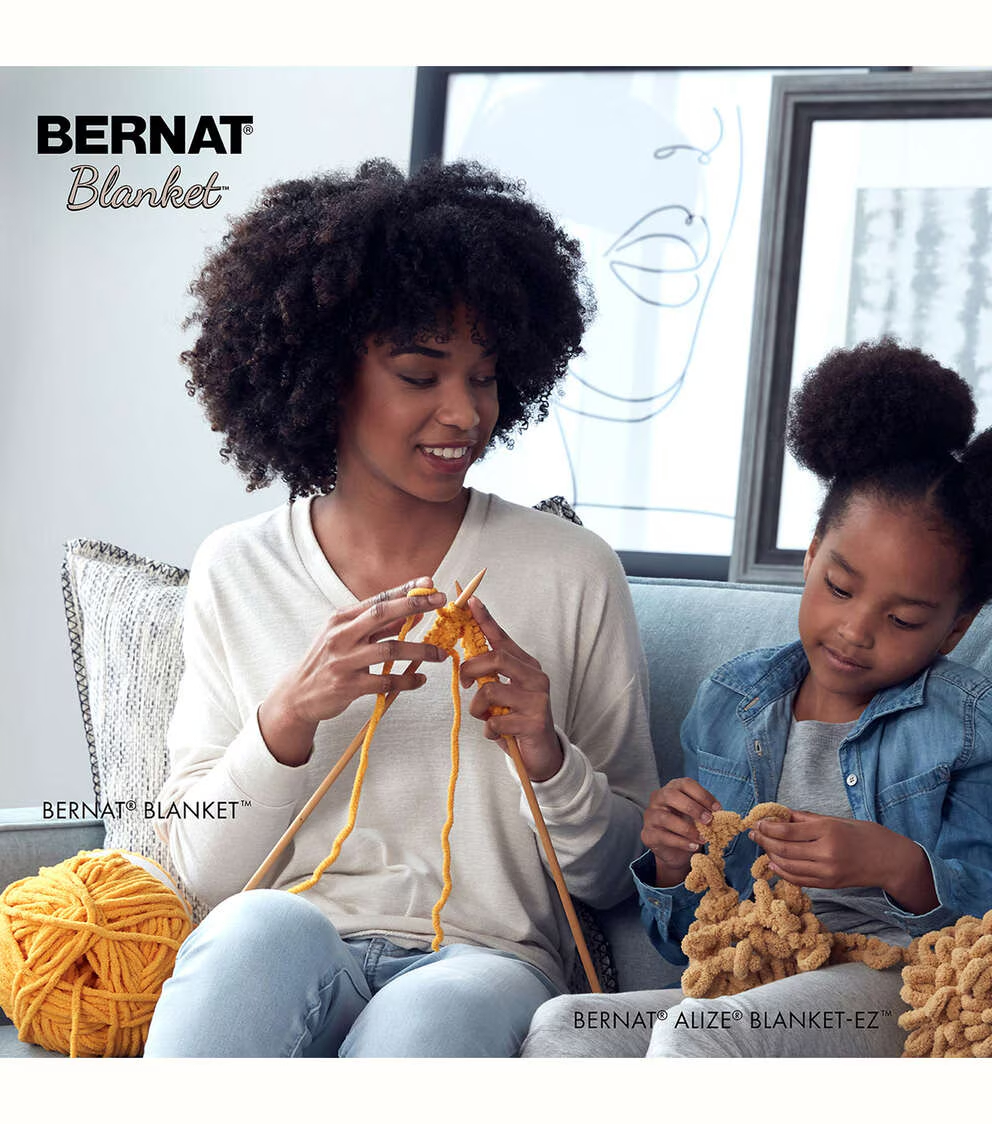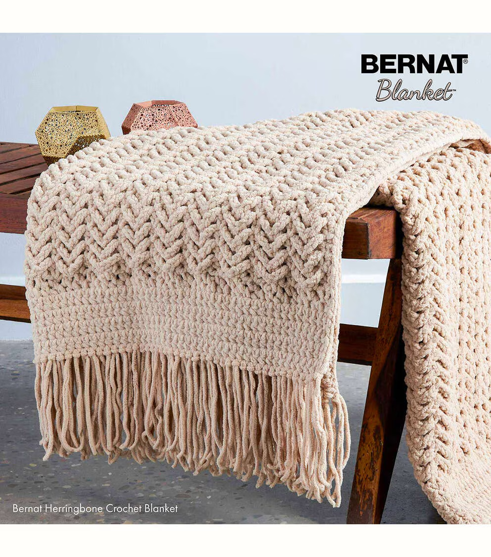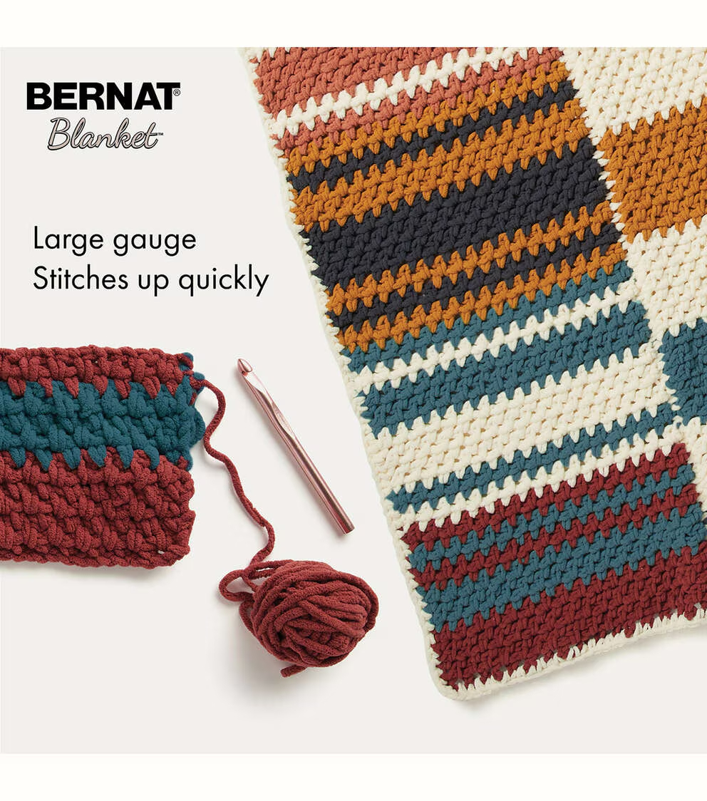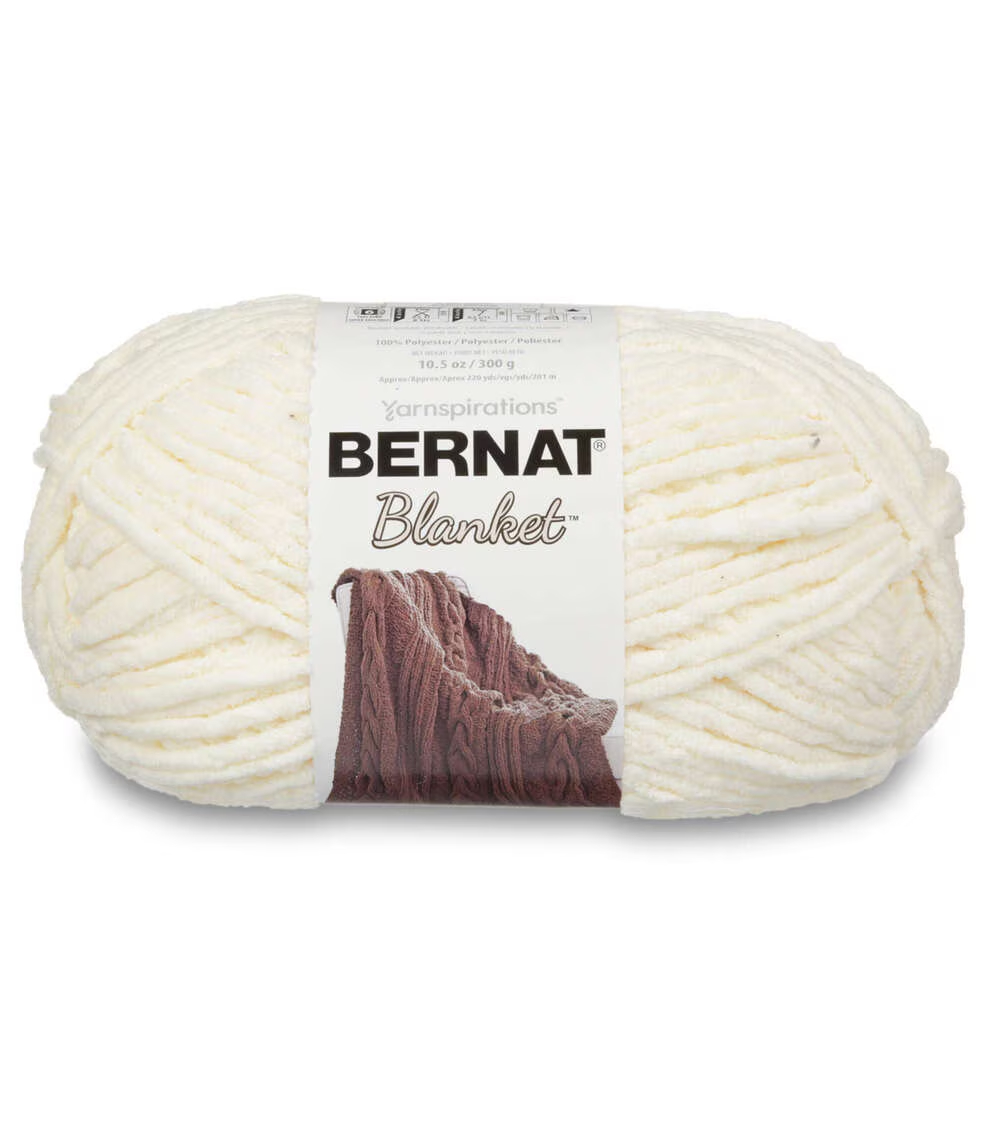A luxurious, soft and cozy yarn, Bernat Blanket is a chenille-style yarn that’s perfect for home decor projects. From blankets, to crochet baskets, Blanket is ideal for a wide range of projects. Its super bulky weight stitches up quickly, making it a great choice for afghans and blankets. Available in a wide range of solid and variegate shades to compliment your home decor. Economical big ball size for larger projects. Conveniently machine washable and dryable.