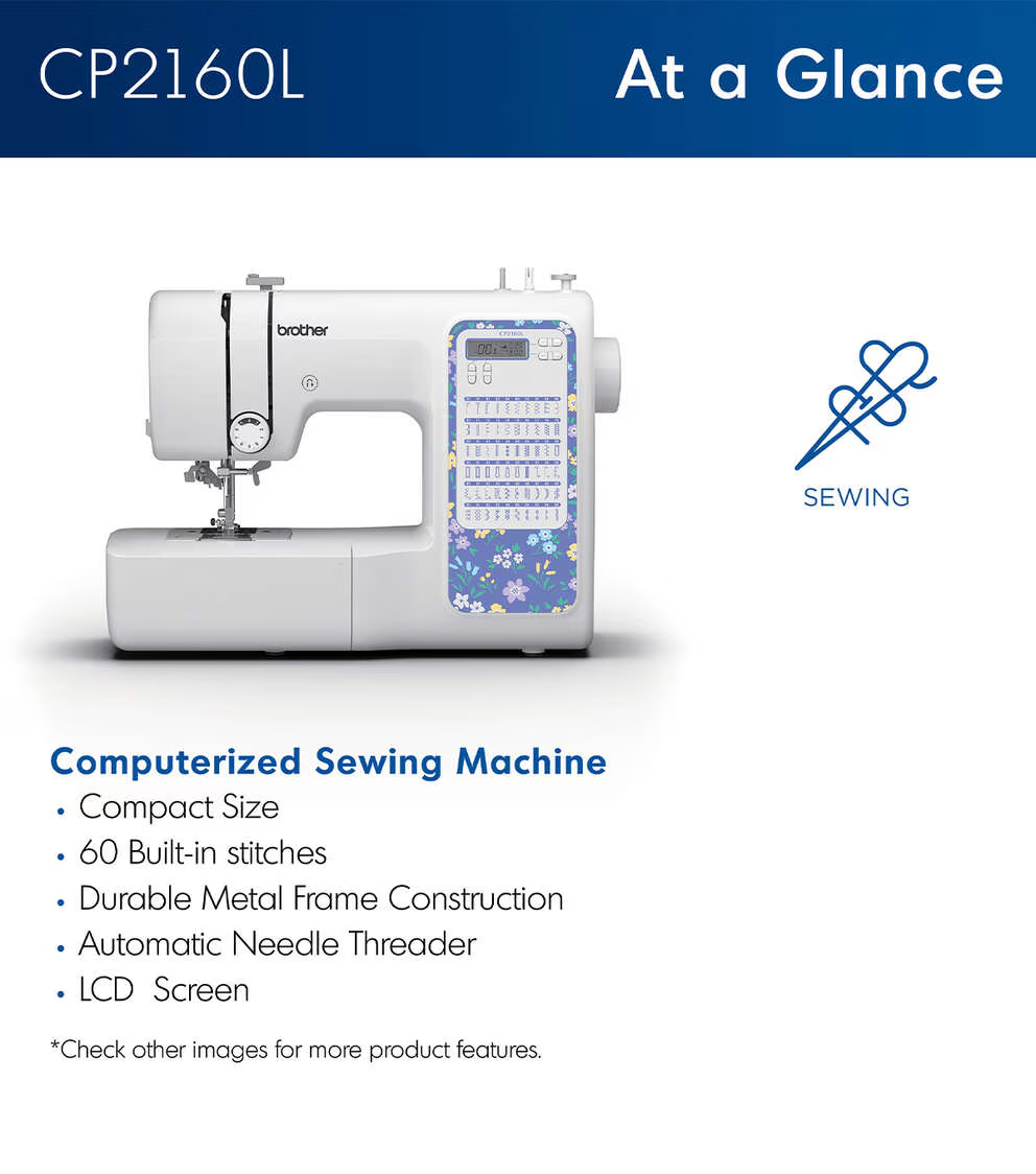 - At Your Side Support: The CP2160L sewing machine comes with Brother At Your Side support, offering free technical support via online, live chat, or phone for the life of your machine.