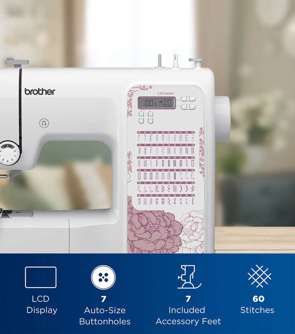 - 60 Unique Built-in Stitches: The Brother CP2160M sewing machine includes 60 built-in stitches, including utility, decorative, heirloom stitch functions, and seven auto-size buttonholes.