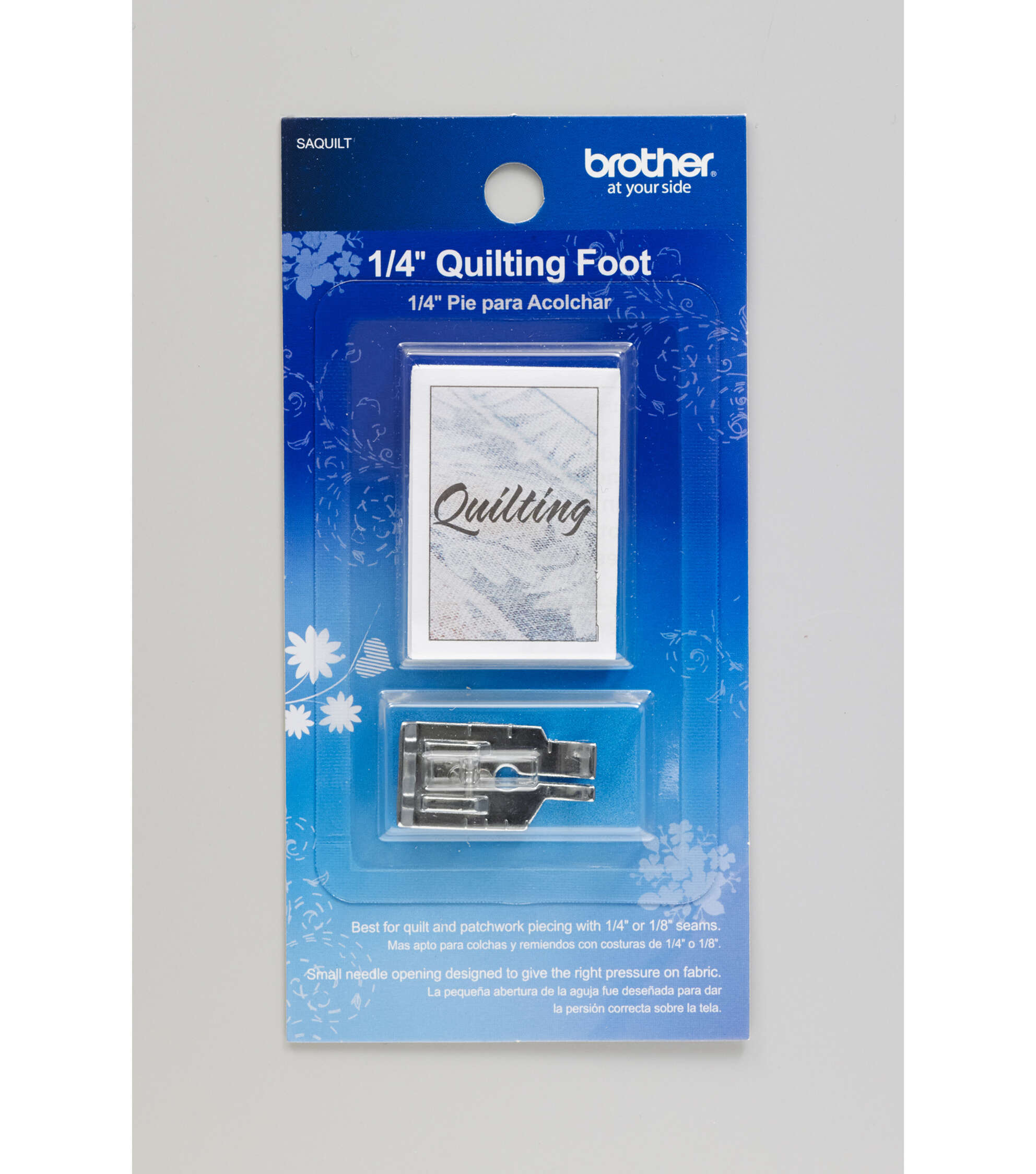 The Brother SAQUILT ¼ inch Quilting Foot should be used for patchwork piecing with ¼ inch or 1/8-inch seam allowances. Using the center needle, straight stitch position, the right front edge of this foot provides a guide for creating an even ¼ inch seam for quilts, doll clothes and heirloom projects. This is a genuine Brother accessory.