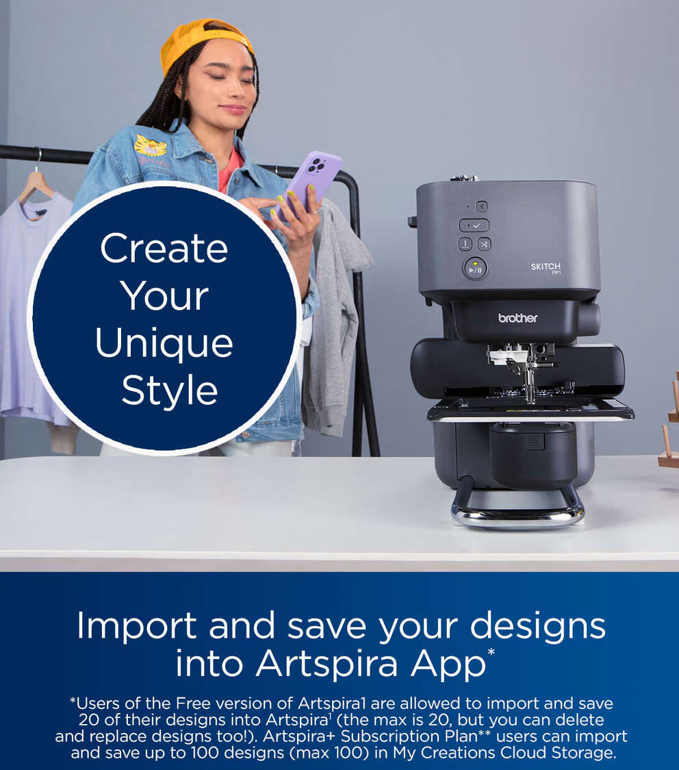 Now there is embroidery for everyone. Introducing the Skitch PP1 Single-Needle Embroidery Machine for when you want to add some individual customization to just about any embroidery project. With its industrial looks, modern design, and connection with the Artspira mobile app(1), the Skitch Single-Needle Embroidery Machine will inspire every embroidery or crafting project. The Skitch Single-Needle Embroidery Machine will look great in your house, hobby room, or any space that sparks your creativity. When you are ready to bring new life to old favorites (vintage clothing, upcycling) or are looking to draw your next great idea on Artspira(1), the Skitch PP1 Single-Needle Embroidery Machine will be ready. To start using Skitch Single-Needle Embroidery Machine, the free Artspira(1) Mobile App is where you begin. Skitch owners receive 500 free embroidery designs within the free Artspira(1) app – designs that are not available to anyone else! In addition to those 500 designs that come with the purchase of Skitch, you can also browse the additional free embroidery designs within the app. And for endless creative possibilities, users of the Free version of Artspira(1) are allowed to import and save 20 of their designs into Artspira(1) (the max is 20, but you can delete and replace designs too!). Artspira+ Subscription Plan(3) users can import and save up to 100 designs (max 100) in My Creations Cloud Storage. Artspira(1) lets you design line-art-inspired embroidery drawings right in the palm of your hand with built-in embroidery drawing tools and optional stitch types (straight stitch and zigzag stitch). With these tools at your fingertips, you can design hand-drawn drawings that fit in a 4″ x 4″ embroidery area and then quickly transfer your creations to your Skitch PP1 Single-Needle Embroidery Machine. The Skitch PP1 Single-Needle Embroidery Machine has Free Arm capability, so adding a design to pants or sleeves, just got more customizable. Plus, the Skitch Single-Needle Embroidery Machine has a Thread Trimming Key that, at the touch of a button, the machine stops to trim both the upper and bobbin thread. Other features include a quick set bobbin, a needle threader, and an embroidery speed of 400 SPM, so adding a personal touch to embroidery projects is fast and easy. With access to embroidery designs and the ability to make embroidery patterns by drawing on your mobile device, there’s no limit to your next embroidery project. The Skitch Single-Needle Embroidery Machine is ideal for enhancing readymade goods so you can express yourself with your style.