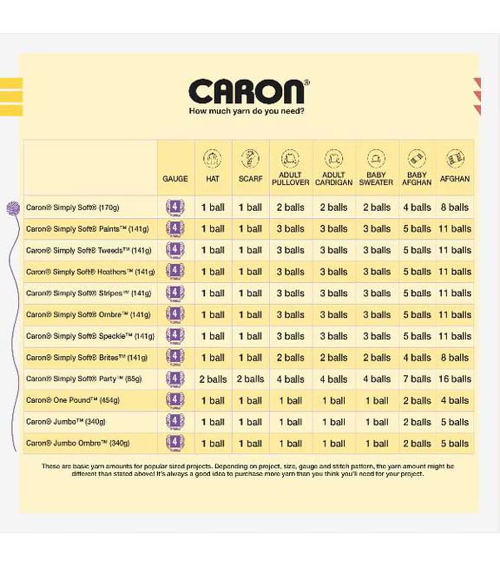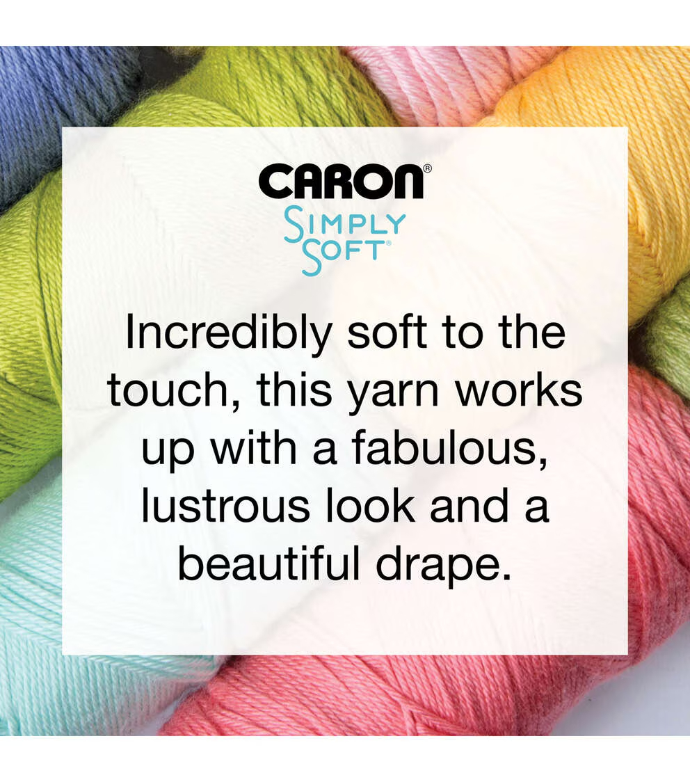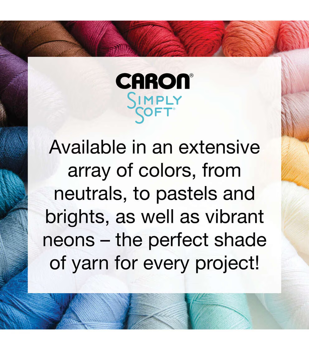 Caron Simply Soft yarn is one of the most popular, versatile worsted weight yarns. Incredibly soft to the touch, this yarn is perfect from a variety of projects from baby to fashion to home decor. Simply Soft comes in an extensive array of colors, from neutrals, to pastels and brights, as well as vibrant neons – the perfect shade for every project! With a unique sheen, this yarn works up with a fabulous, lustrous look, with a beautiful drape. Conveniently machine washable and dryable for easy care.Beautiful luster and sheen