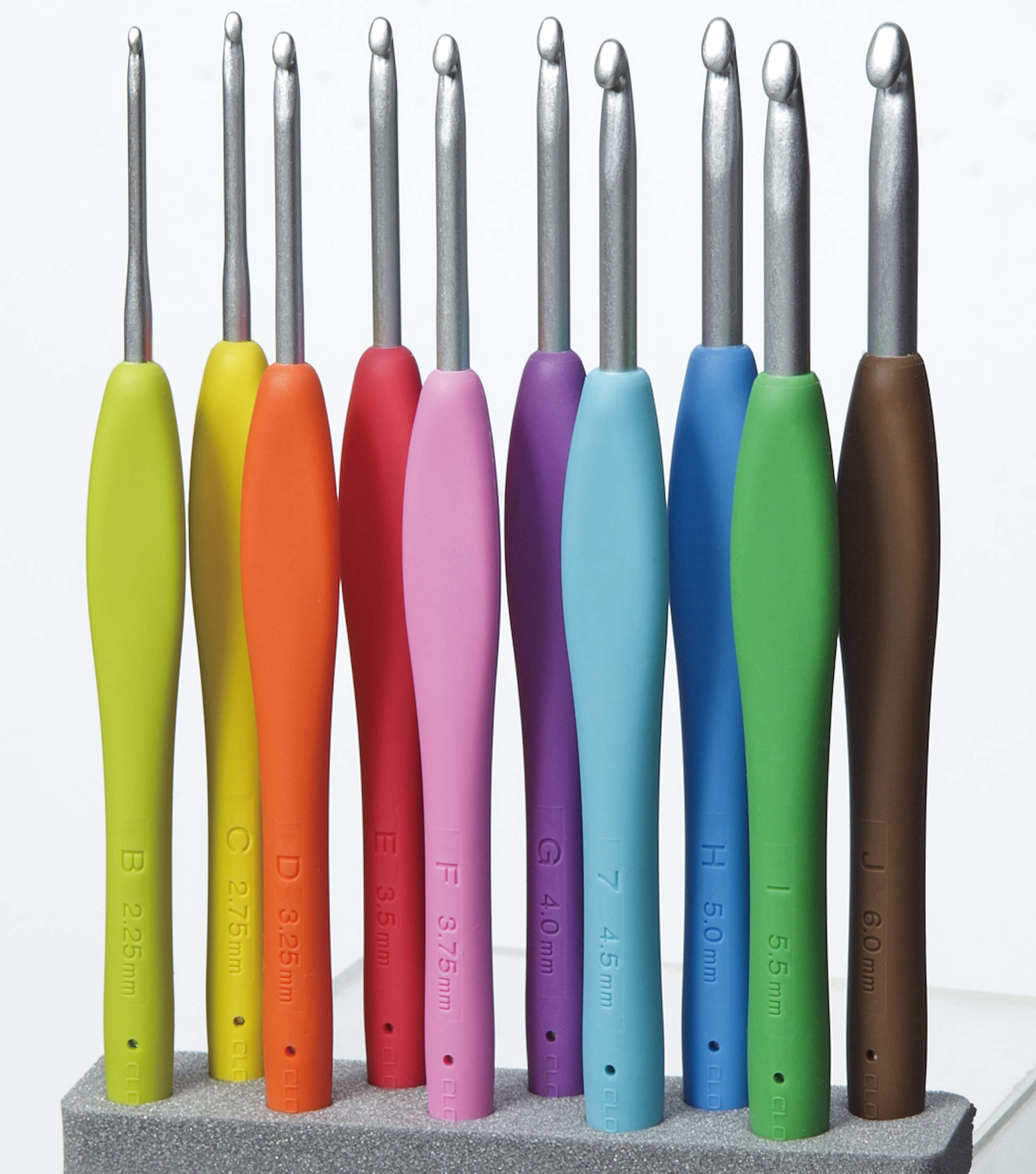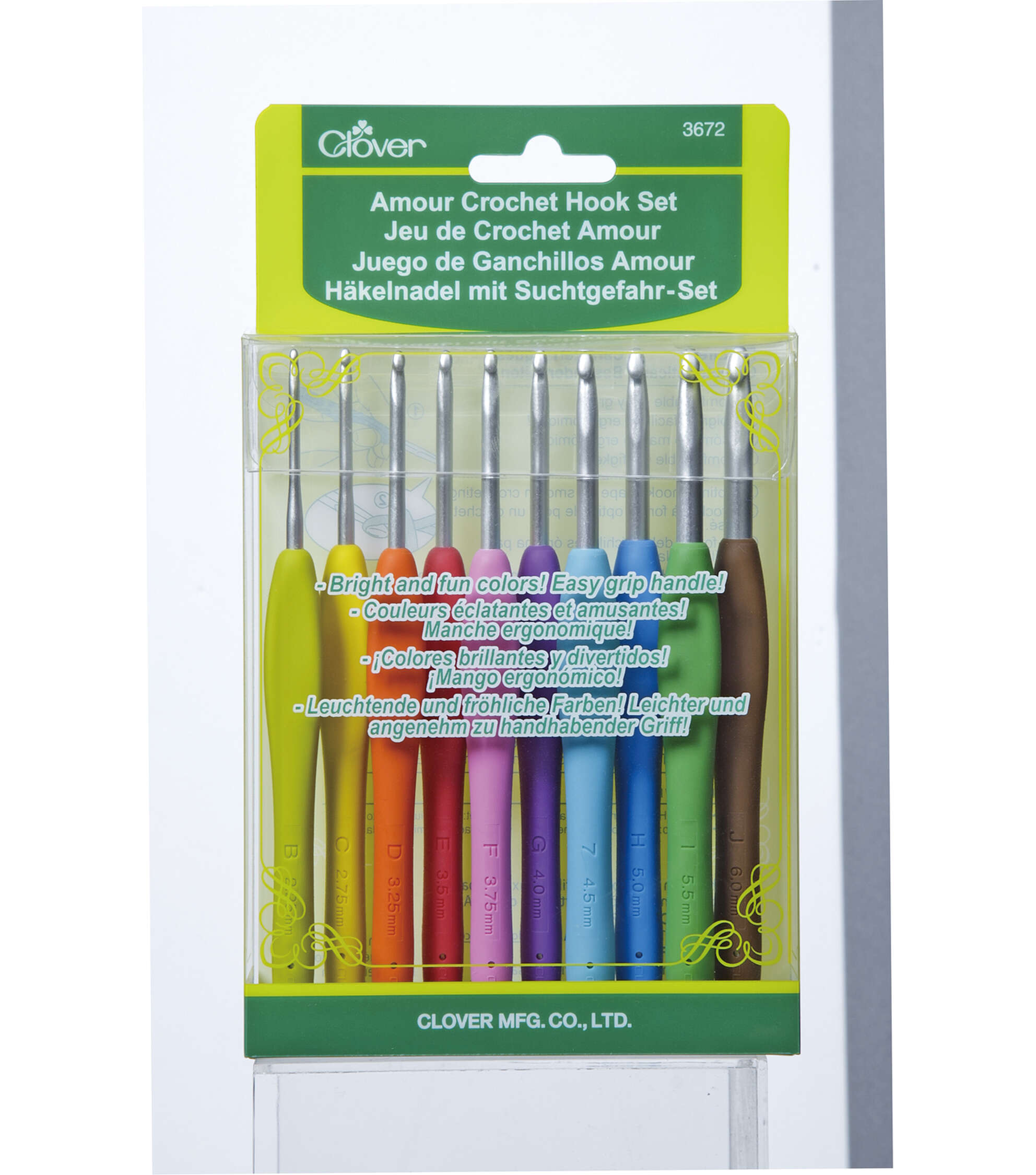 CLOVER-Amour Crochet Hook Set. These brightly colored crochet hooks have easy grip handles; which makes them comfortable and easy to grip while working on all crochet projects. This package contains ten metal hooks (B/2.25mm; C/2.75mm; D/3.25mm; E/3.50mm; F/3.75mm; G/4.00mm; 7/4.50mm; H/5.00mm; I/5.50mm and J/6.00mm). Imported.