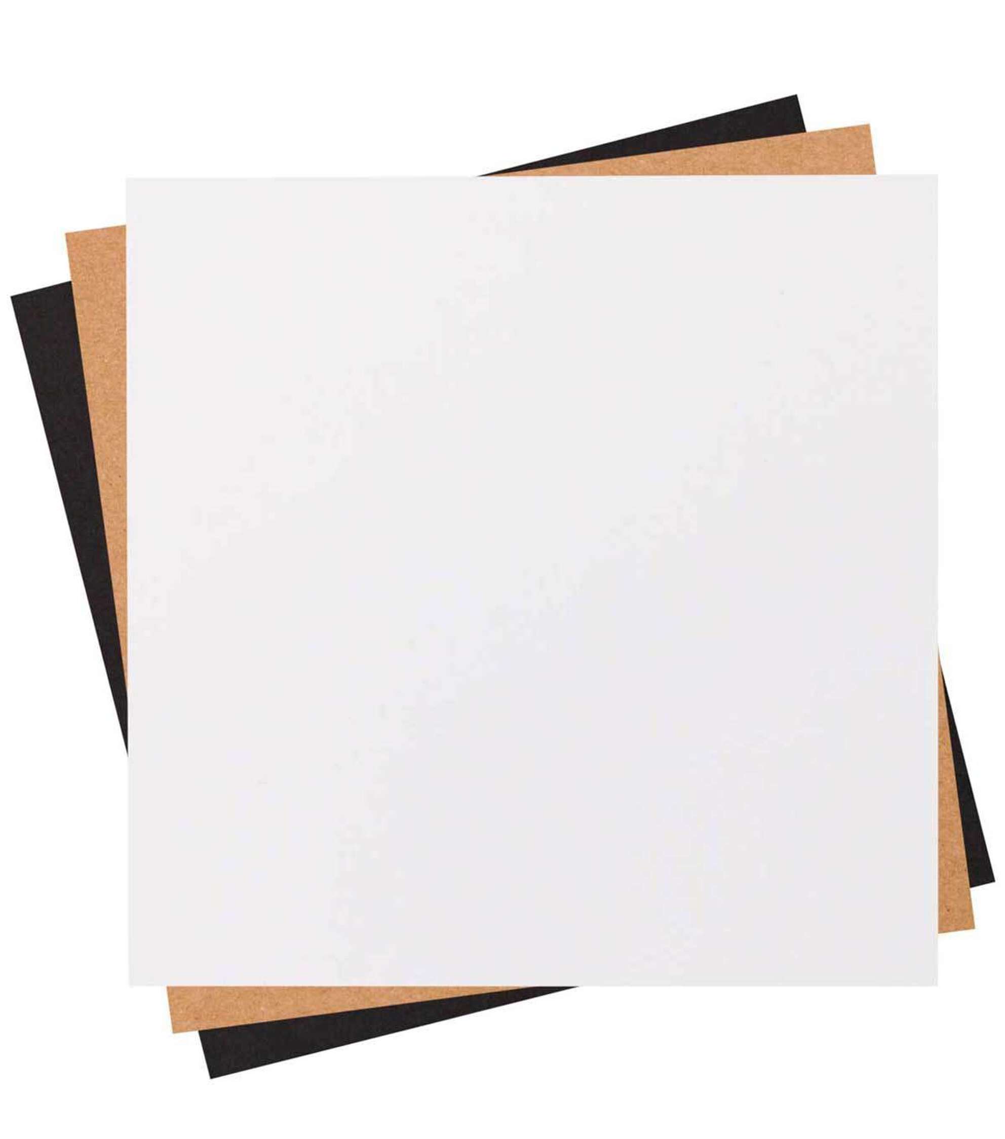 - Thirty sheets (Ten of each color) 12 Inches x 12 Inches Kraft Board in Black, White, and Natural