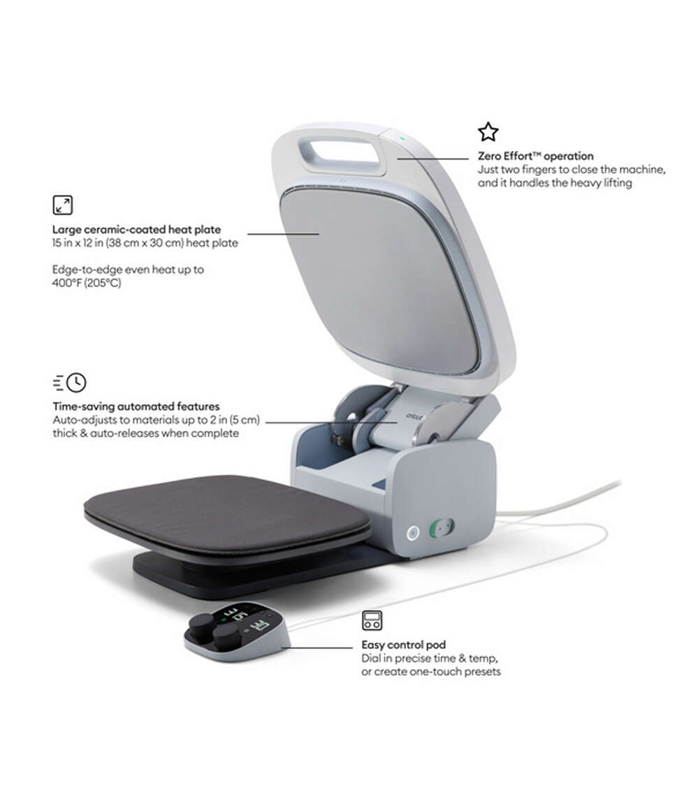 - Reaches temperatures up to 400 °F (205 °C) for iron-on (HTV), Infusible Ink & sublimation projects