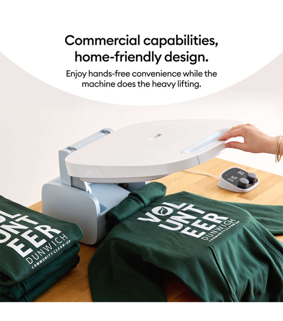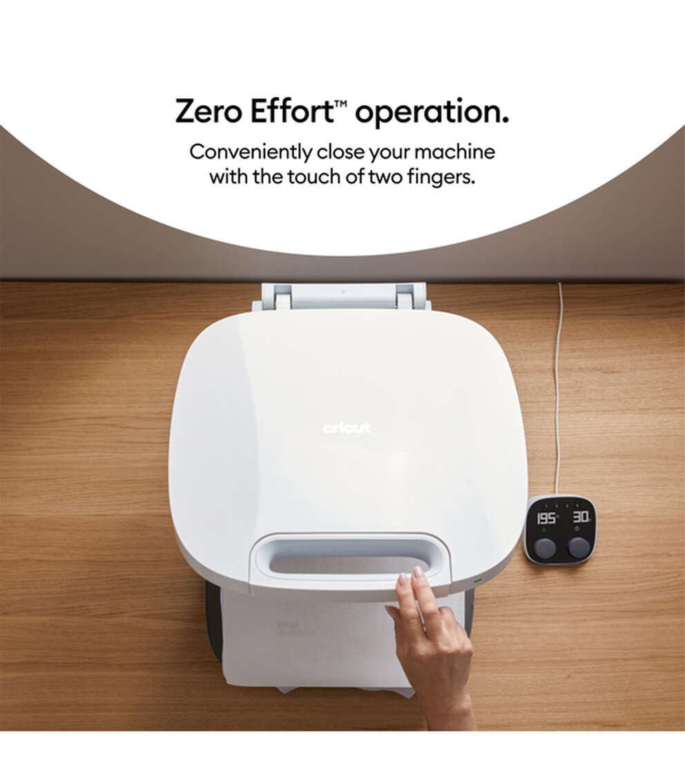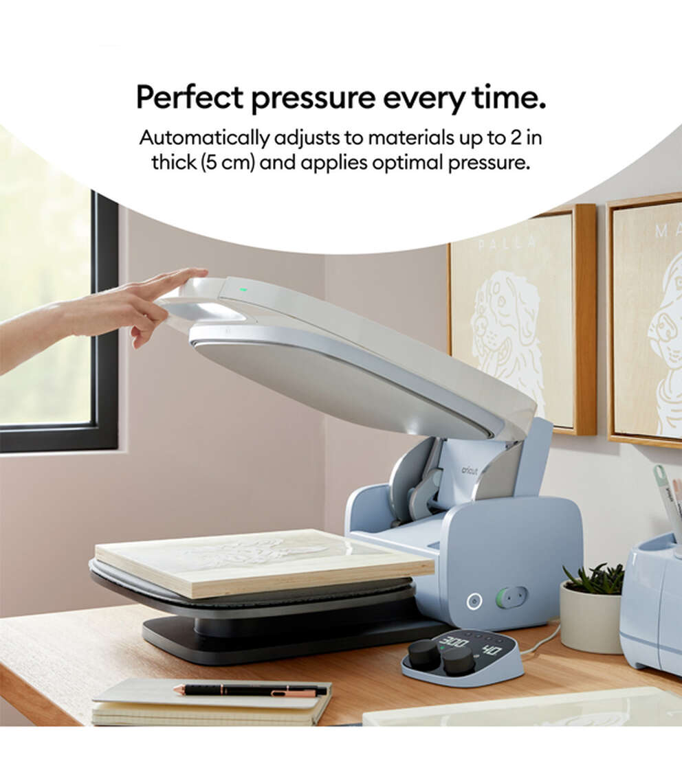 Make more in less time with the professional heat press for home. Cricut Autopress combines commercial power with a sleek, user-friendly design to take on any heat transfer project. Zero Effort operation lets you securely close the machine with just two fingers, and the handle’s motor does the rest. Use the control pod to dial in precise time & temperature settings for consistent results on your creation, whether it’s a big-business production or a one-time passion project. The ceramic-coated heat plate reaches up to 400ºF (205ºC) for a large variety of heat-transfer applications and auto-adjusts to materials up to 2 in (5 cm) thick – that means no more pressure adjustments. Safety features like auto-off & certified temperature-rated plastics mean you can press with peace of mind. It even auto-releases when the press is complete. Works with major brands of iron-on (HTV), Infusible Ink & sublimation materials. A perfect complement to Cricut cutting machines. Product will not function until activated using PC/Mac computer with USB port and internet connection.