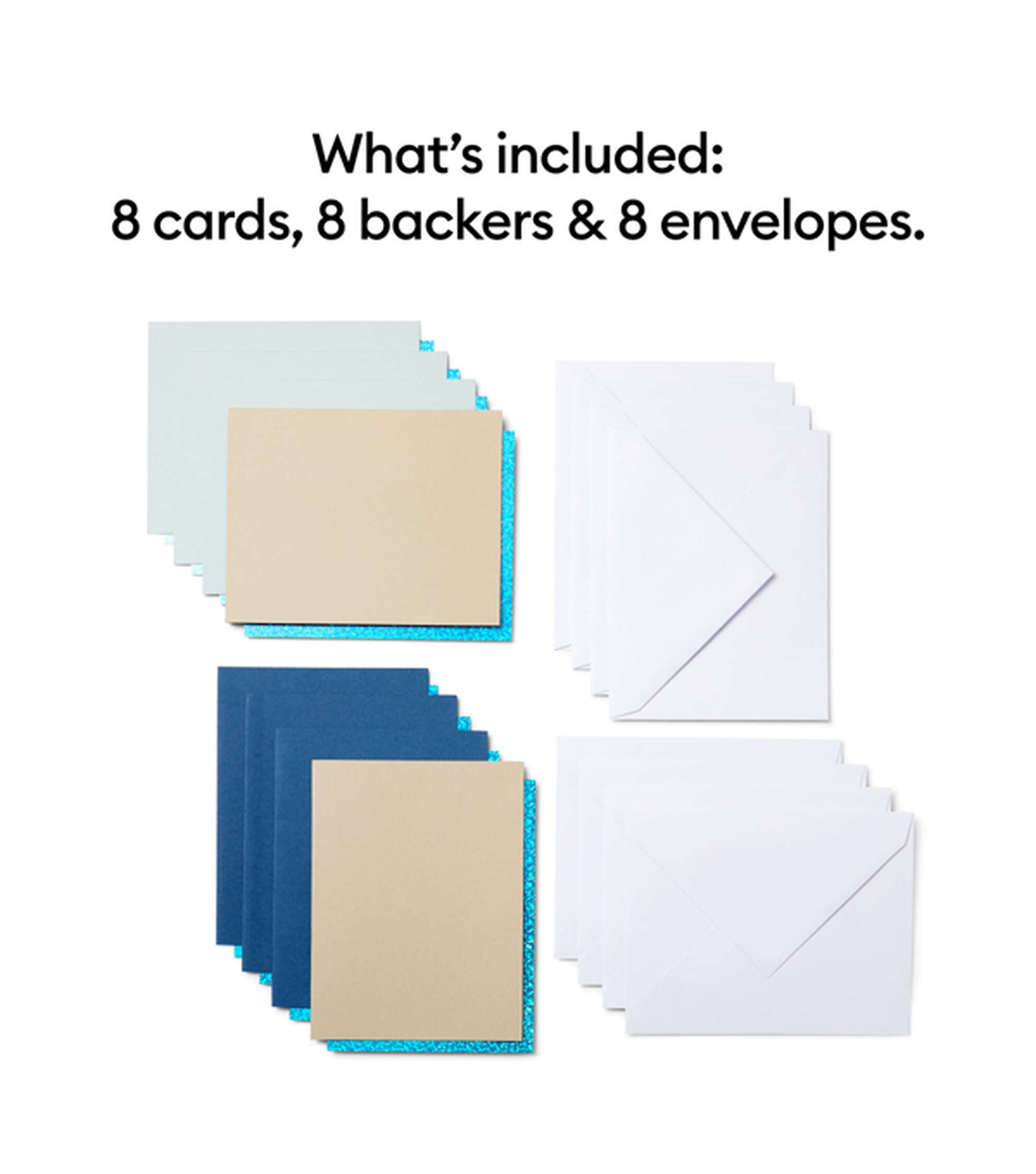 - 8 cards with adhesive (3 Midnight Blue, 2 Khaki, 3 Whispering Blue); 8 Blue Holographic backers; 8 White envelopes