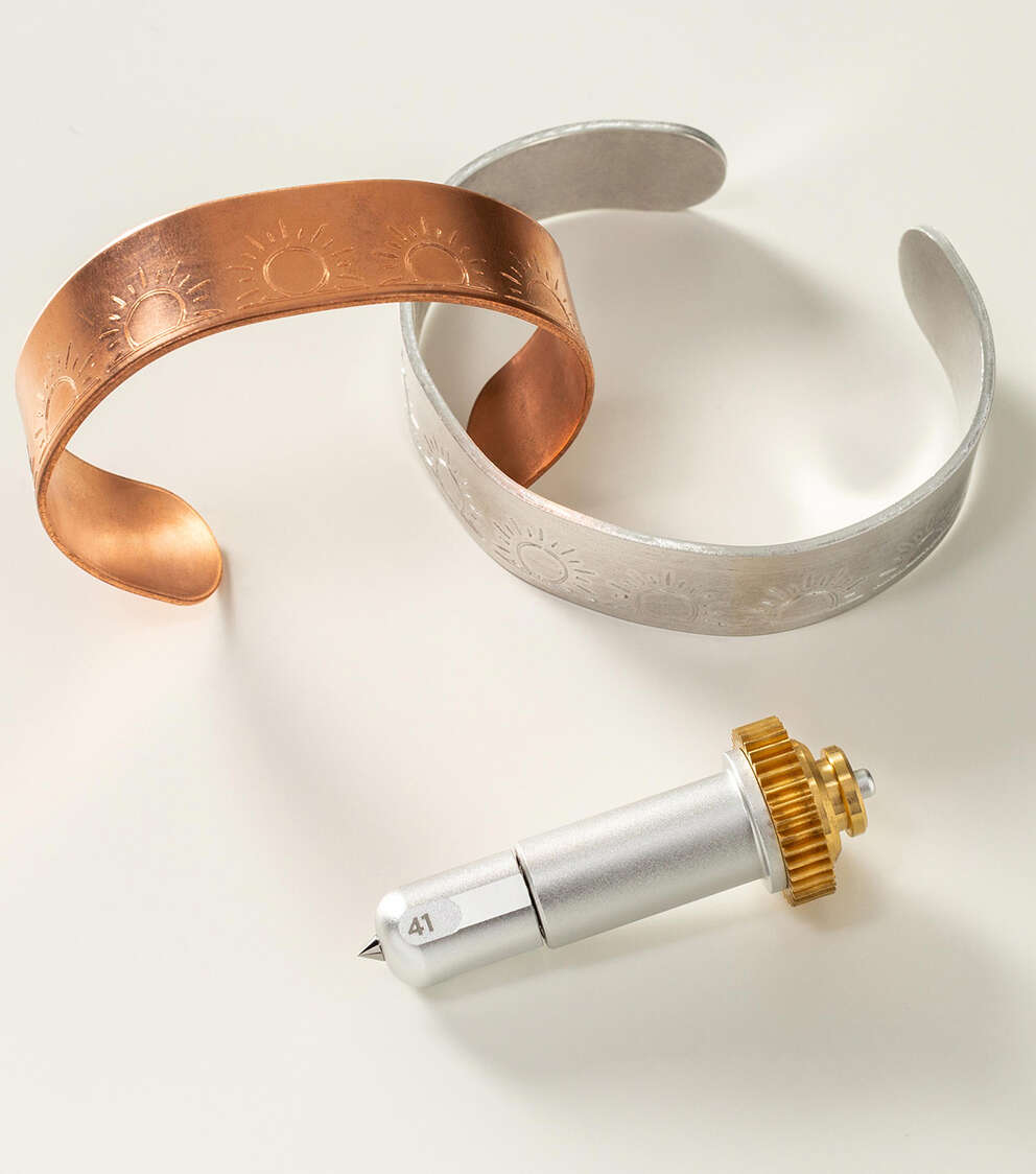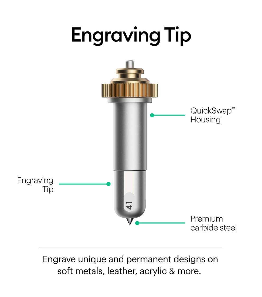 Cricut Engraving Tool makes an impression that lasts and lasts. Simply snap this tip onto your QuickSwap Housing and watch as Cricut Maker adds polished, professional-looking engraved designs on glass, leather, metal, and more. From personalized text or monograms to decorative flourishes and inscribed inspirational messages, give every keepsake a special touch that stands the test of time. Engrave Cricut Aluminum Sheets or anodized aluminum to reveal the silver beneath for a striking effect. For use with Cricut Maker machines. To learn more about engraving materials and techniques, visit help.cricut.com/engrave. Expand your collection of Cricut Maker tools with a variety of QuickSwap tips. Just swap out Cricut Engraving Tip with any other QuickSwap tip, including Scoring Wheels, Debossing Tip, Perforation Blade, and Wavy Blade – with more on the way. Note: Design Space includes an engrave Linetype with customized material settings.