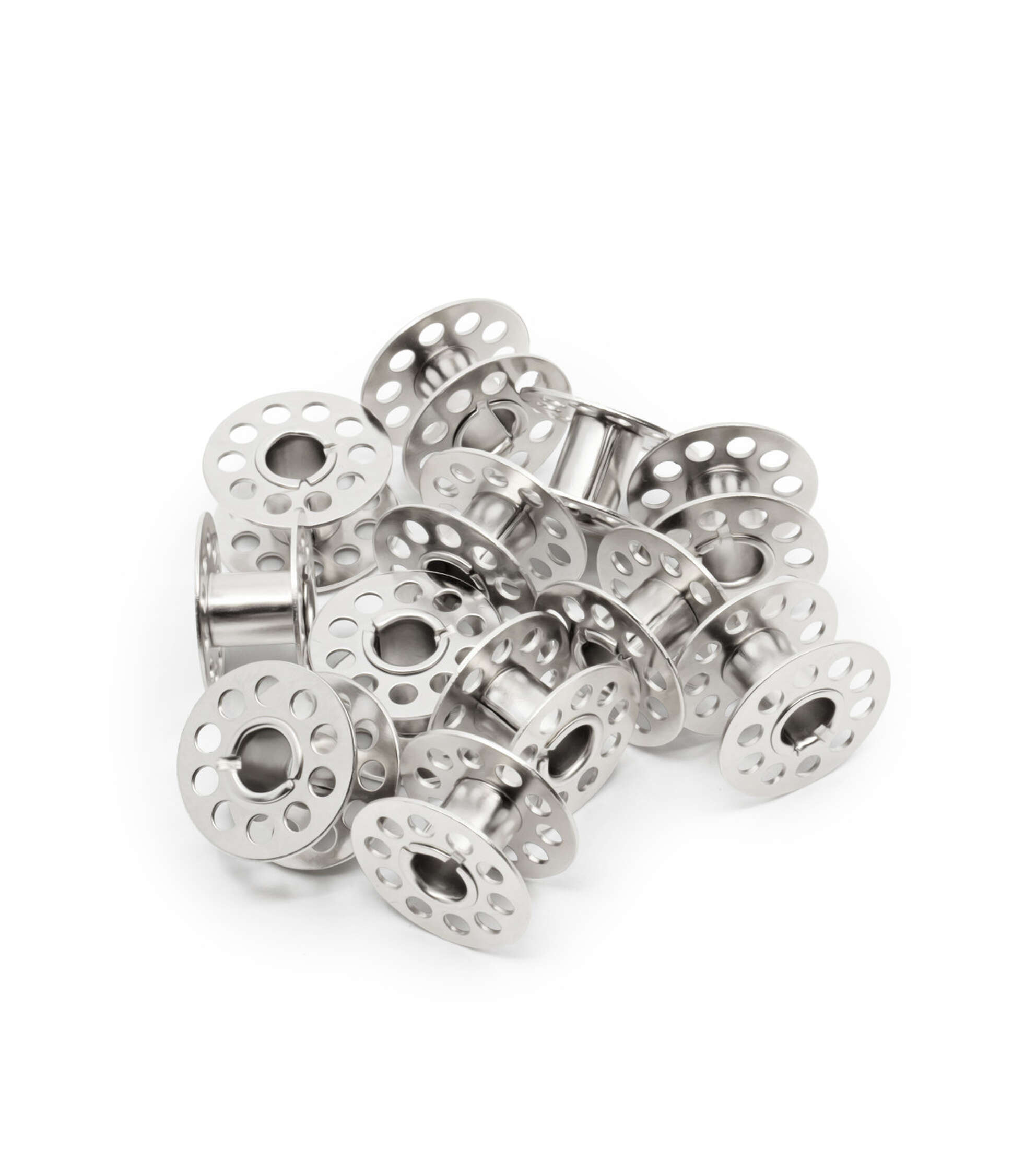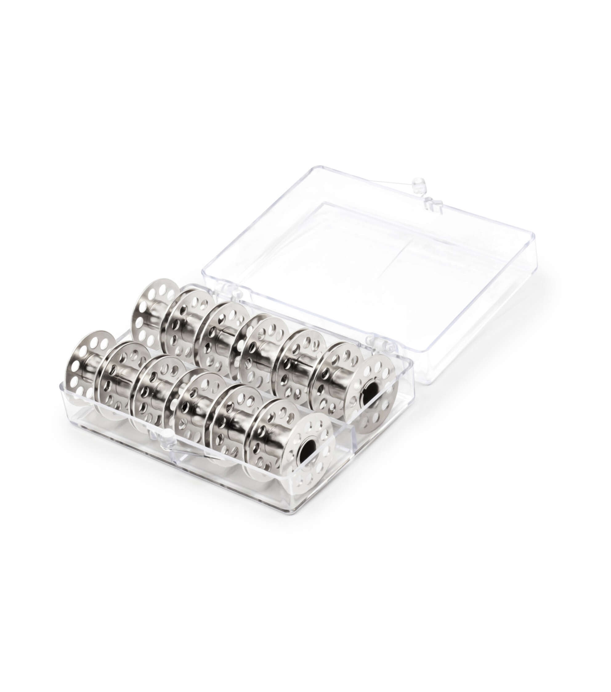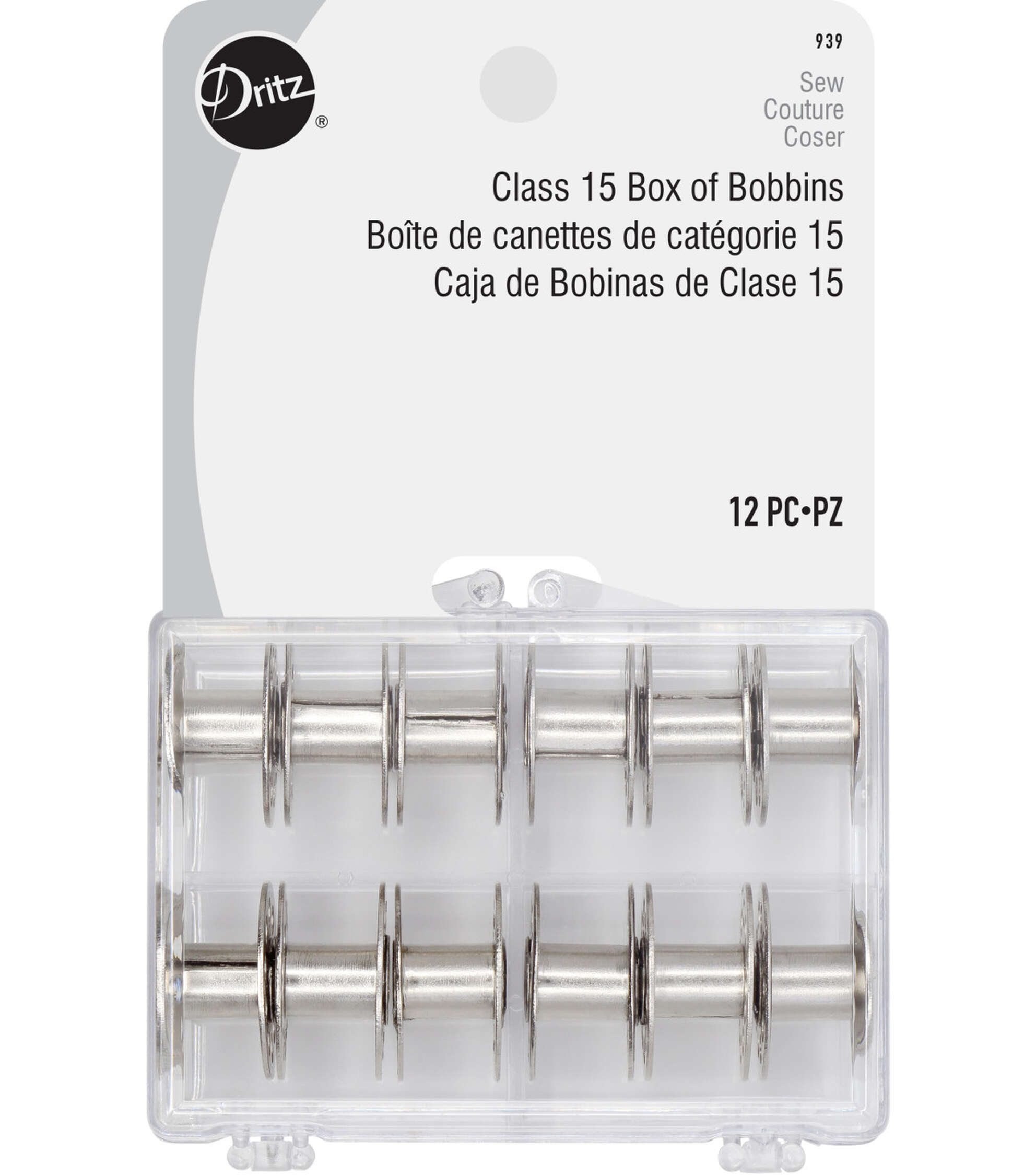 Organize sewing threads neatly in the Dritz Box of Bobbins – Clear. This pack contains 12 bobbins of Class 15 in a plastic case that can be used to keep threads in place when not in use. These metal bobbins are designed to fit in all Singer Class 15 models and machines like Baby Lock, Riccar, Simplicity and White.