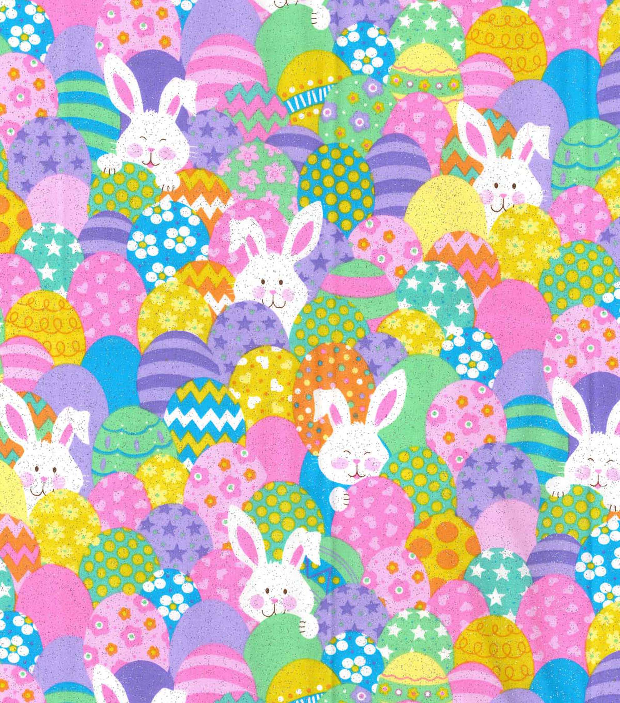 Transform your home into an Easter wonderland with the vibrant and festive Easter Cotton Glitter Fabric-Bunnies and Eggs from Fabric Traditions. Made of 100% cotton, this delightful fabric features a pattern of glittery Easter eggs and bunnies that will add a touch of whimsy to any DIY sewing or craft project.