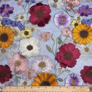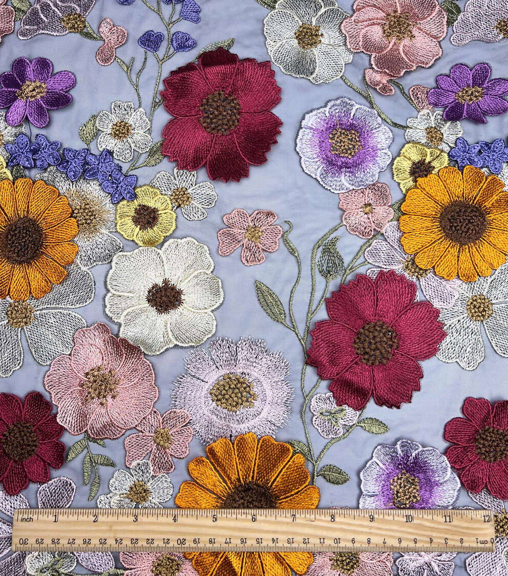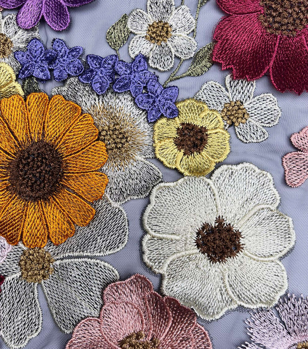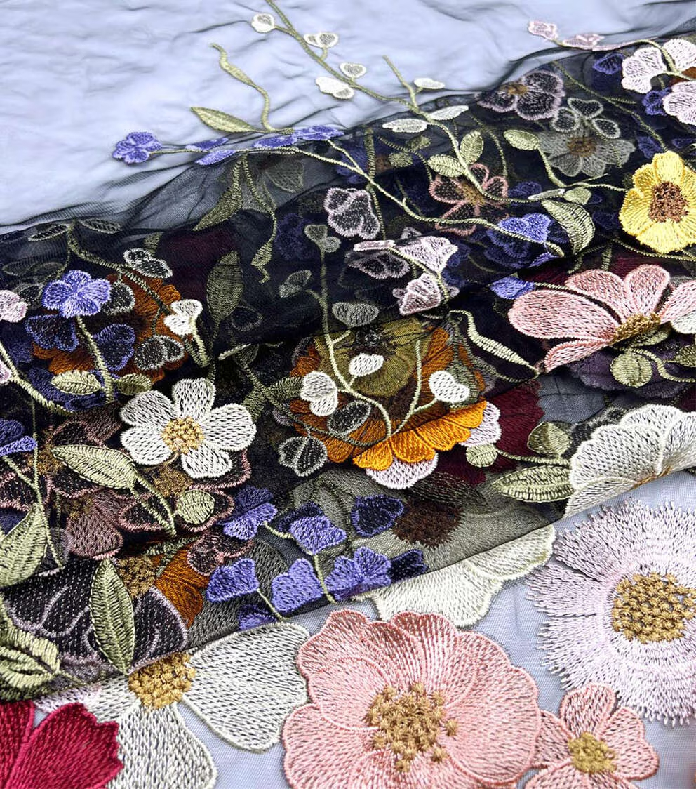 Multicolor 3D Embellished Floral on Black Mesh Fabric
