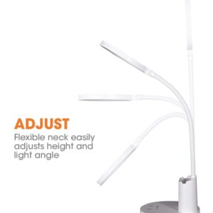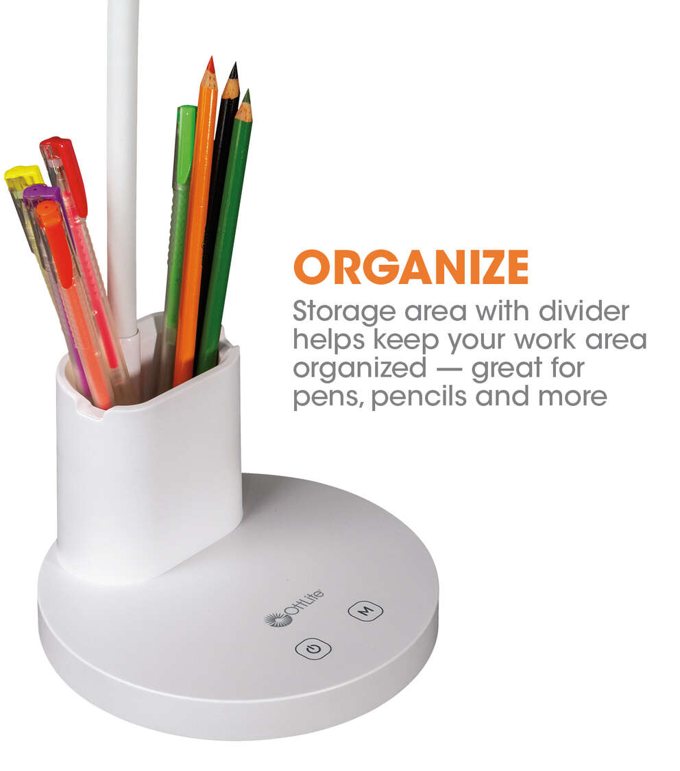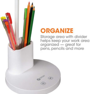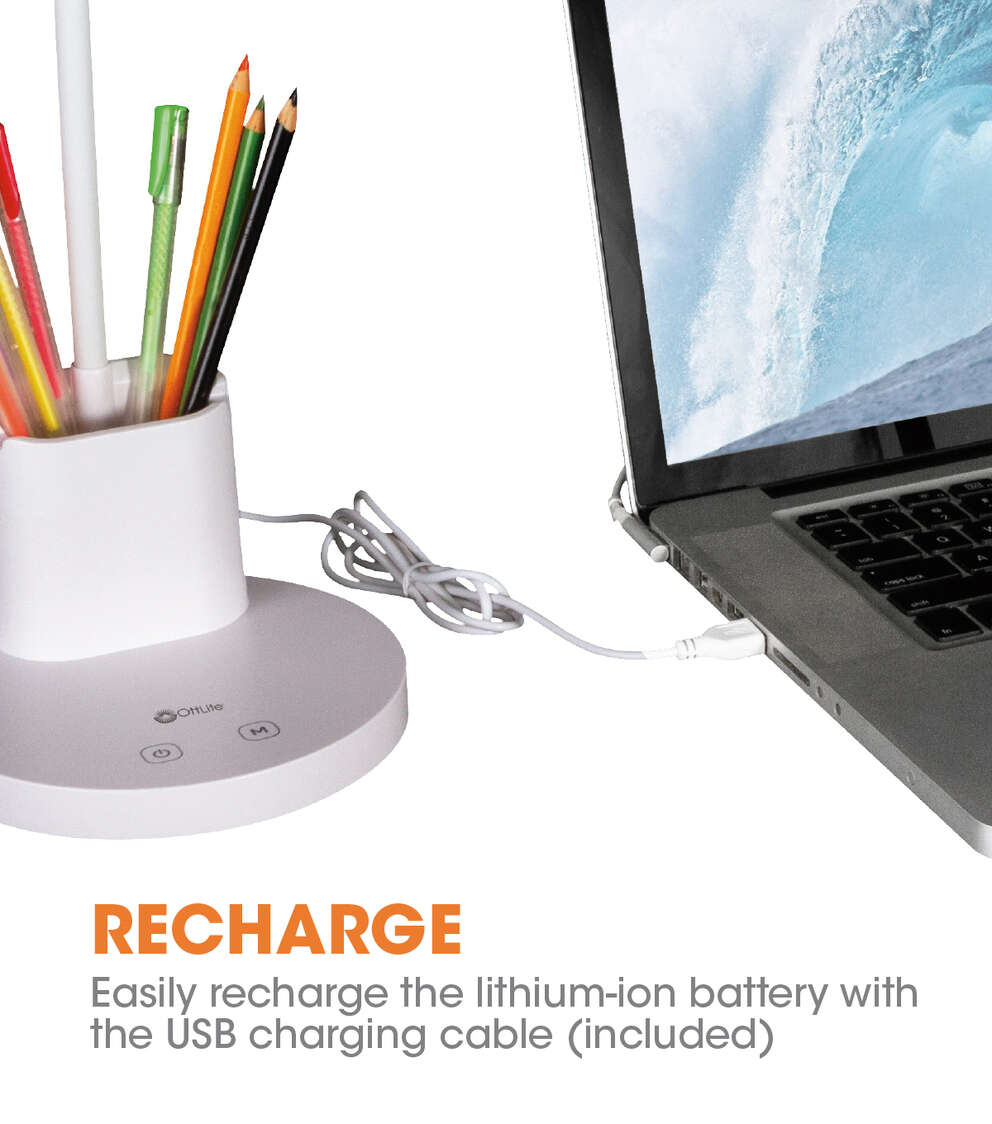 Easily move the OttLite Rechargeable LED Lamp with Phone Holder from coffee table to dining room table to craft room – wherever your creativity takes you! This rechargeable lamp is equipped with a lithium-ion battery. Just charge with the provided USB charging cable and you’re ready to move. See every detail clearly and color accurately with OttLite’s exclusive ClearSun LEDs – shown to reduce eyestrain by up to 51%. Position the natural daylight illumination over your work area with the flexible neck and wide 5.375 inch diameter shade. Store key supplies in the base or use the base as a mobile phone stand – great for watching videos.