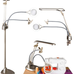 The most versatile and feature-packed lamp OttLite has ever developed, the OttLite Ultimate 3-in-1 Creative Station is a game changer for craft and sewing rooms alike. This lamp easily transforms from a floor lamp, to a table lamp, to a sturdy clamp-on lamp, so you can adapt it to your changing needs. Magnify the details with the 2x optical-grade magnifier that’s surrounded by 360 degrees of crisp, clear LED illumination. Both the magnifier and sturdy hands-free clip placed on long, flexible 20 ¾” arms so you can put them exactly where needed. There’s even a convenient outlet included to fully charge smartphones, tablets or power those craft tools. The long 18 inch x 3.5 inch shade features OttLite’s exclusive ClearSun LED technology – shown to reduce eyestrain and glare for hours of working in comfort. This high contrast, dimmable light has a color rendering index (CRI) of 95+ so you’ll see every color accurately and detail clearly.