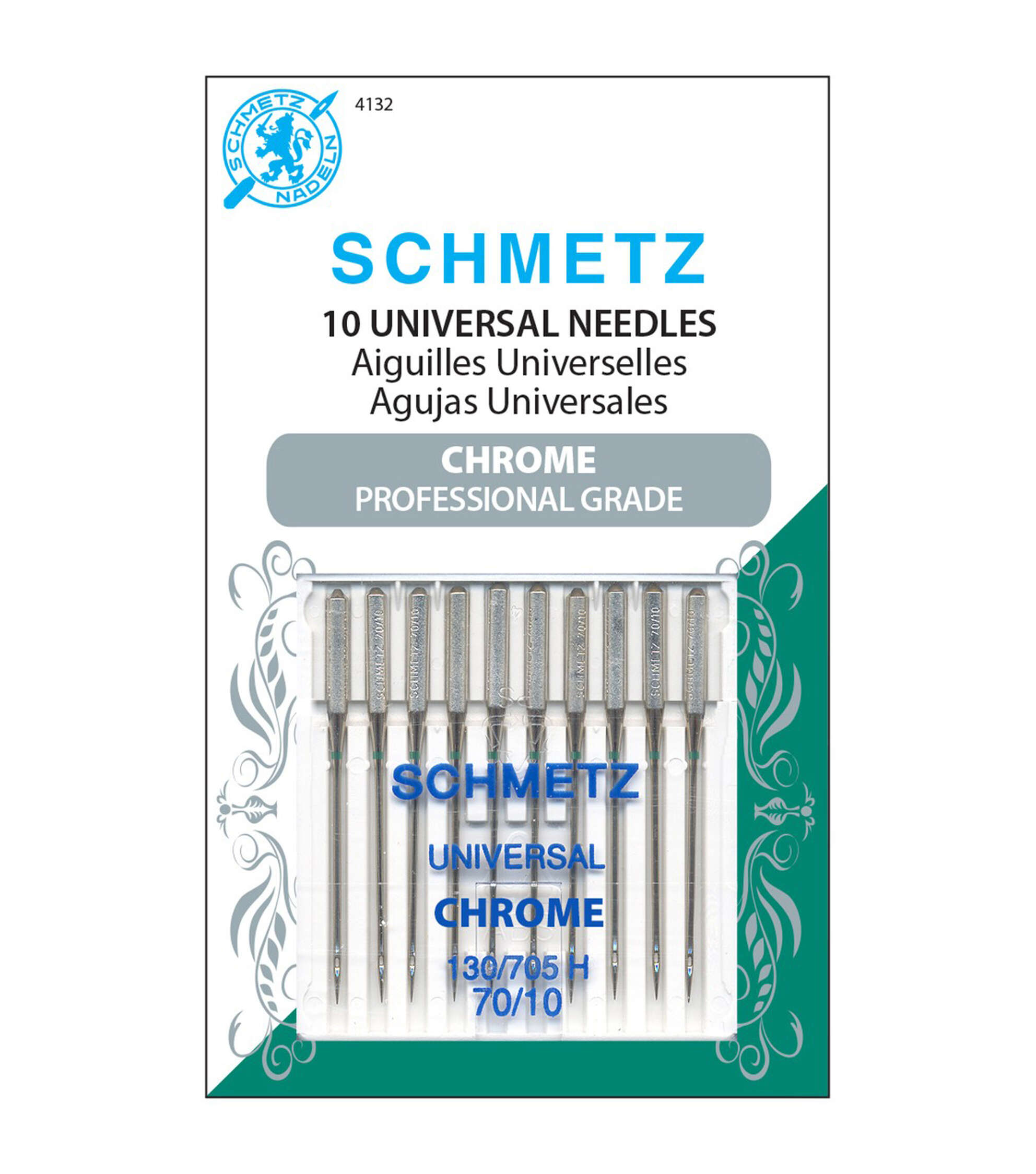 With the Schmetz Chrome Professional Grade Universal Machine Needles, power quilters, embroidery enthusiasts and stitch mavens can complete their projects faster. These needles resist heat and wear and stay cooler longer with less stitch distortion and will make the perfect sewing partner. They allow the thread to pass through the needle eye with less friction and less heat build-up. Use them on woven and knitted fabrics.