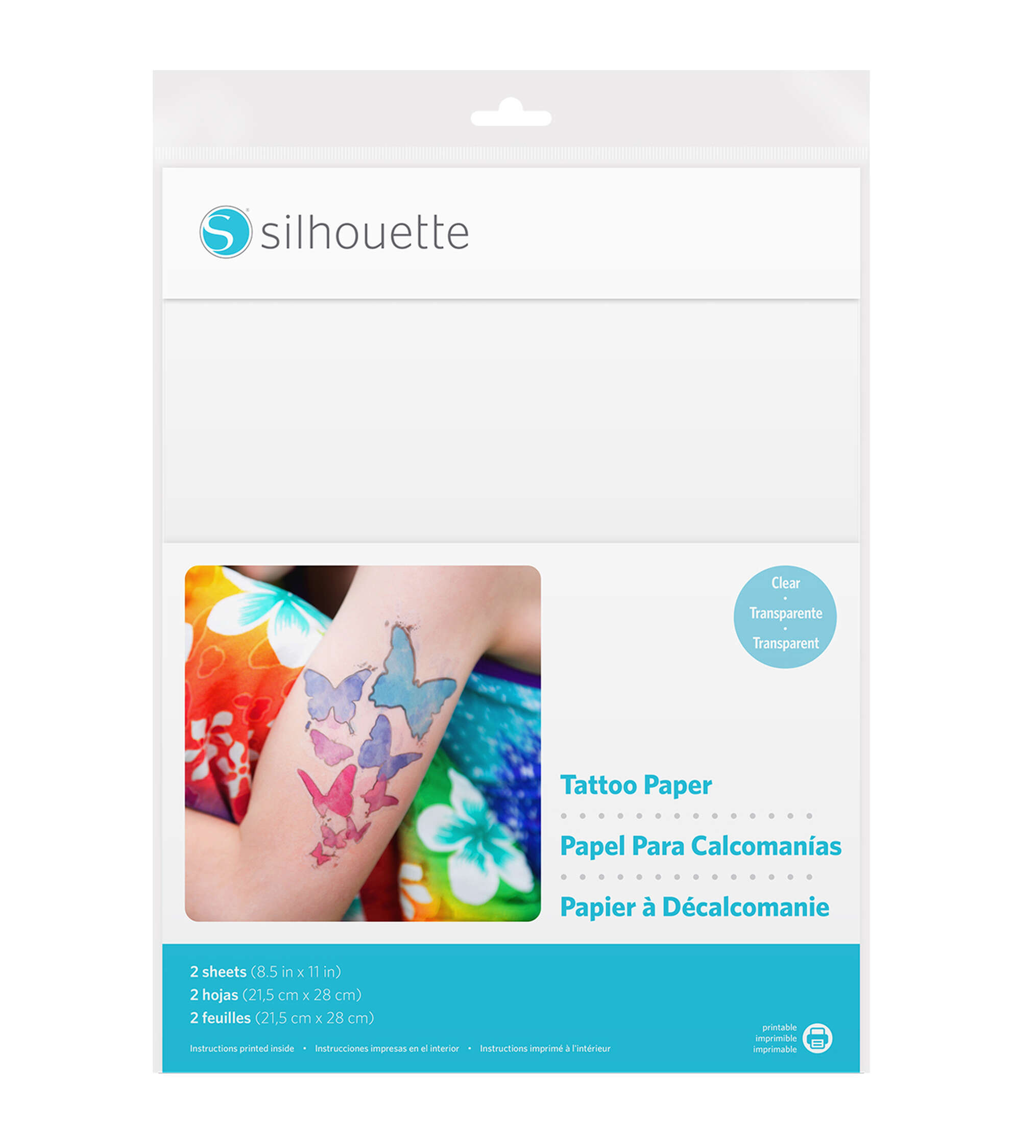 Silhouette Of America-Temporary Tattoo Paper. Make your own temporary tattoos from your favorite print & Cut designs! Simply print designs onto this unique paper with an inkjet printer. Then, with included adhesive, use the Silhouette’s Print & Cut feature to cut around each design. Tattoos apply easily with water, generally last a day or two, and can be removed with warm water and a cloth. This package contains two 11×8-1/2 inch sheets of tattoo paper and two 11×8-1/2 inch sheets of adhesive. Imported.