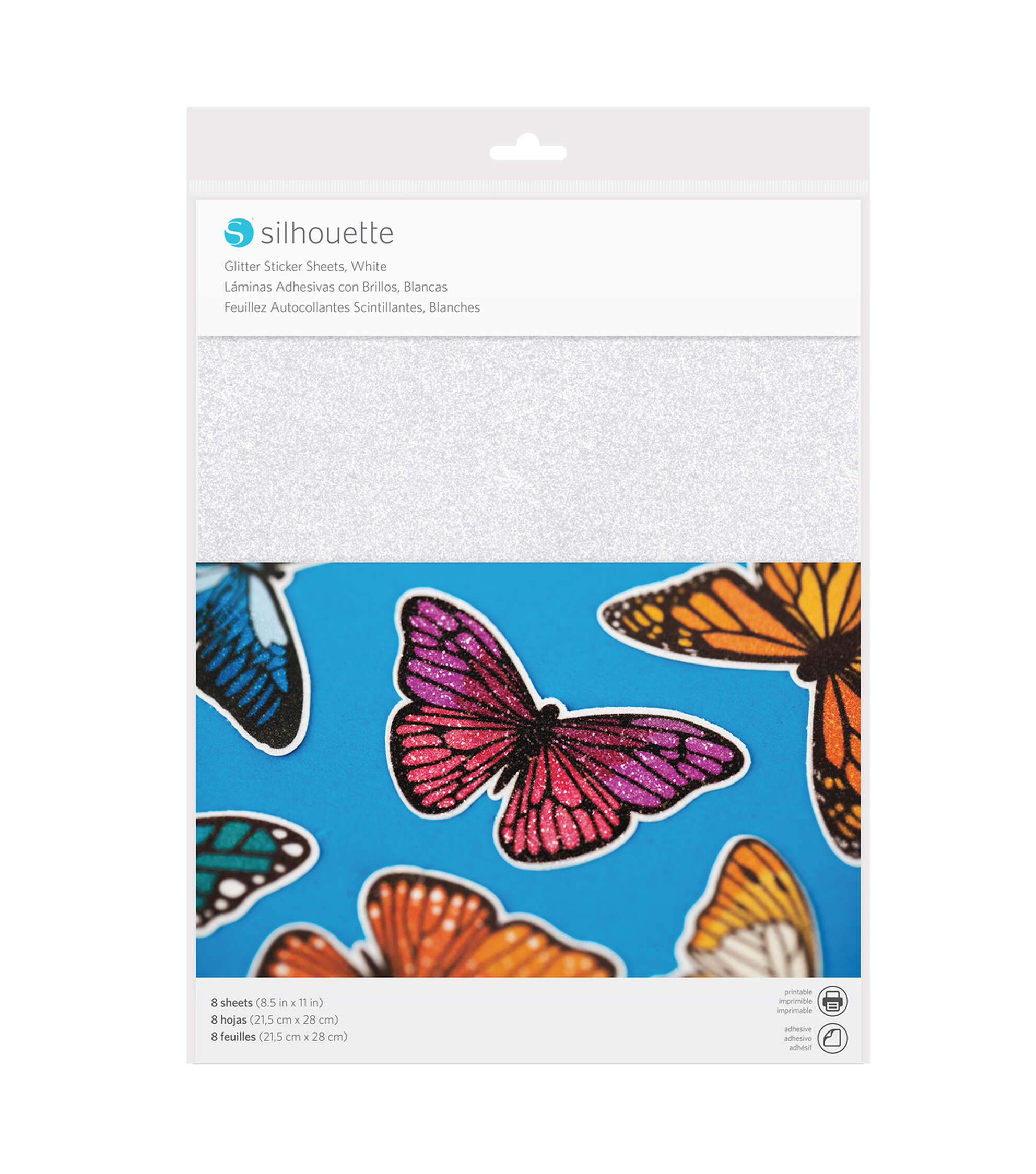 Create labels and stickers with a flashy look using White Glitter Sticker Sheet. This material has a printable surface and an adhesive backing. The glitter sparkle shines through printed images. Simply print an image onto the Sticker Sheet and then cut out around the contour using the Silhouette cutting machine’s Print & Cut feature.