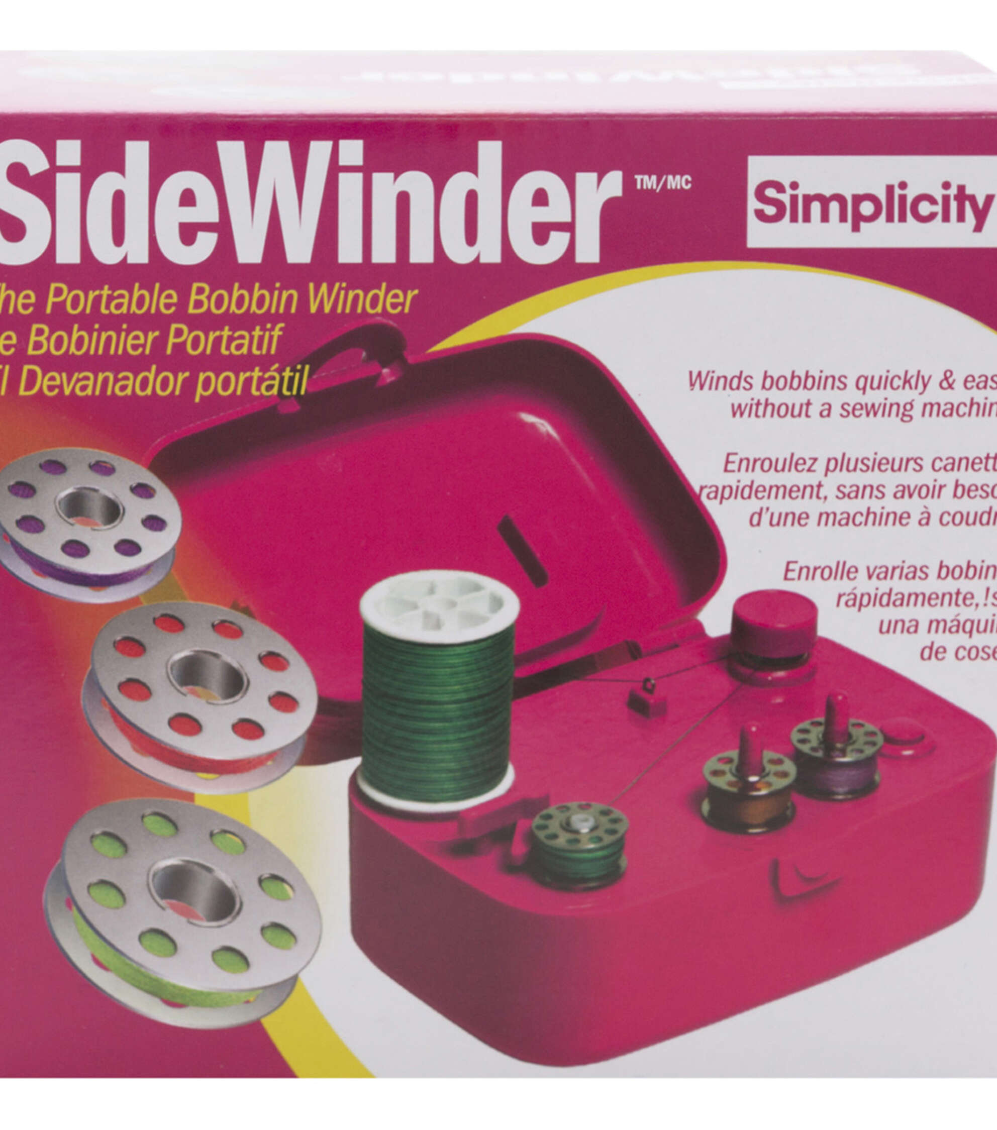 Compact and functional, the Simplicity SideWinder Portable Bobbin Winder is perfect for keeping threads organized even while traveling. This winder comfortably holds spools with a standard-sized center and winds the threads around bobbins to prevent them from getting tangled or knotted. It operates with a simple push of a button. Use this portable bobbin winder with a UL-approved AC power adapter or wireless with batteries.
