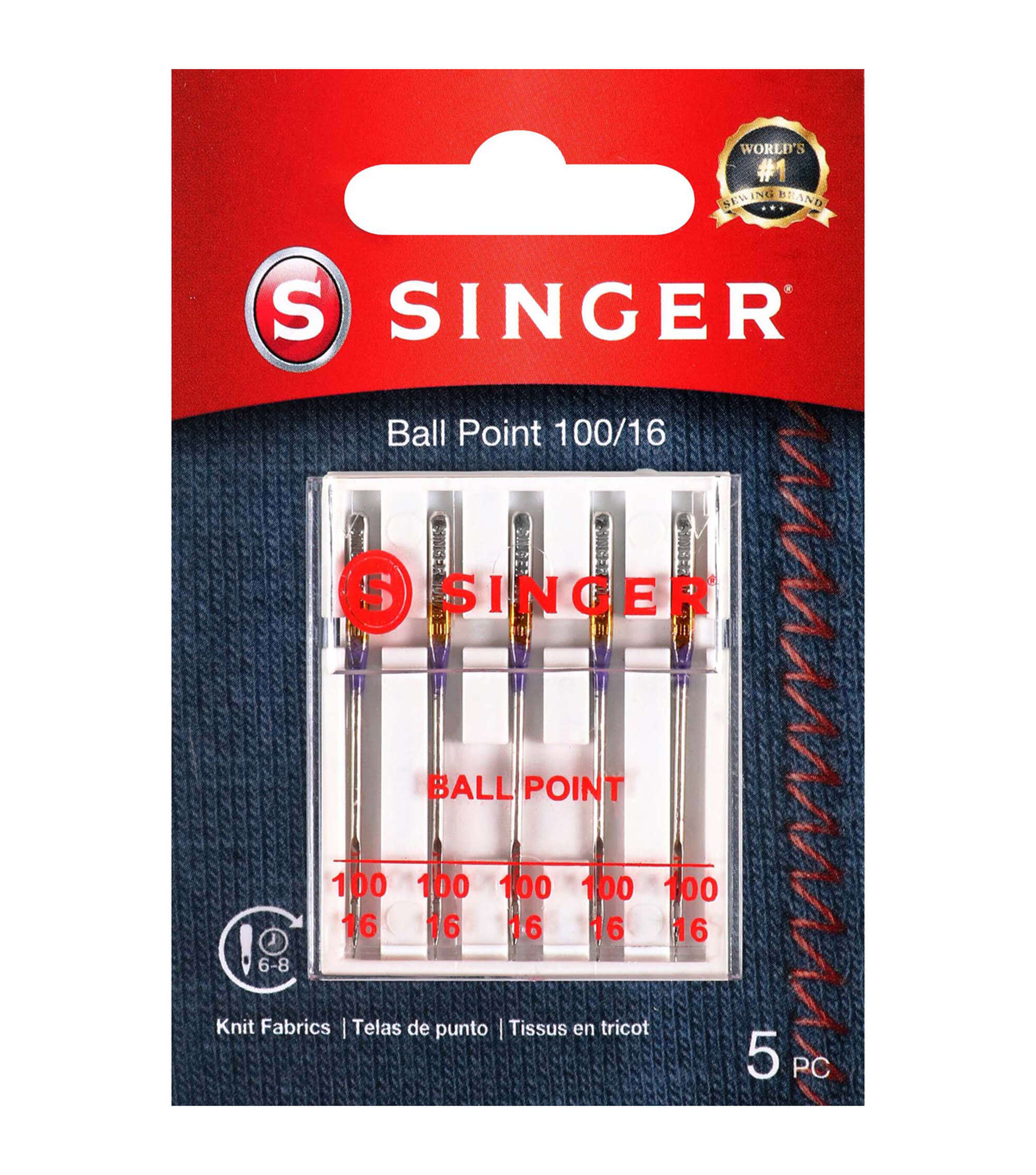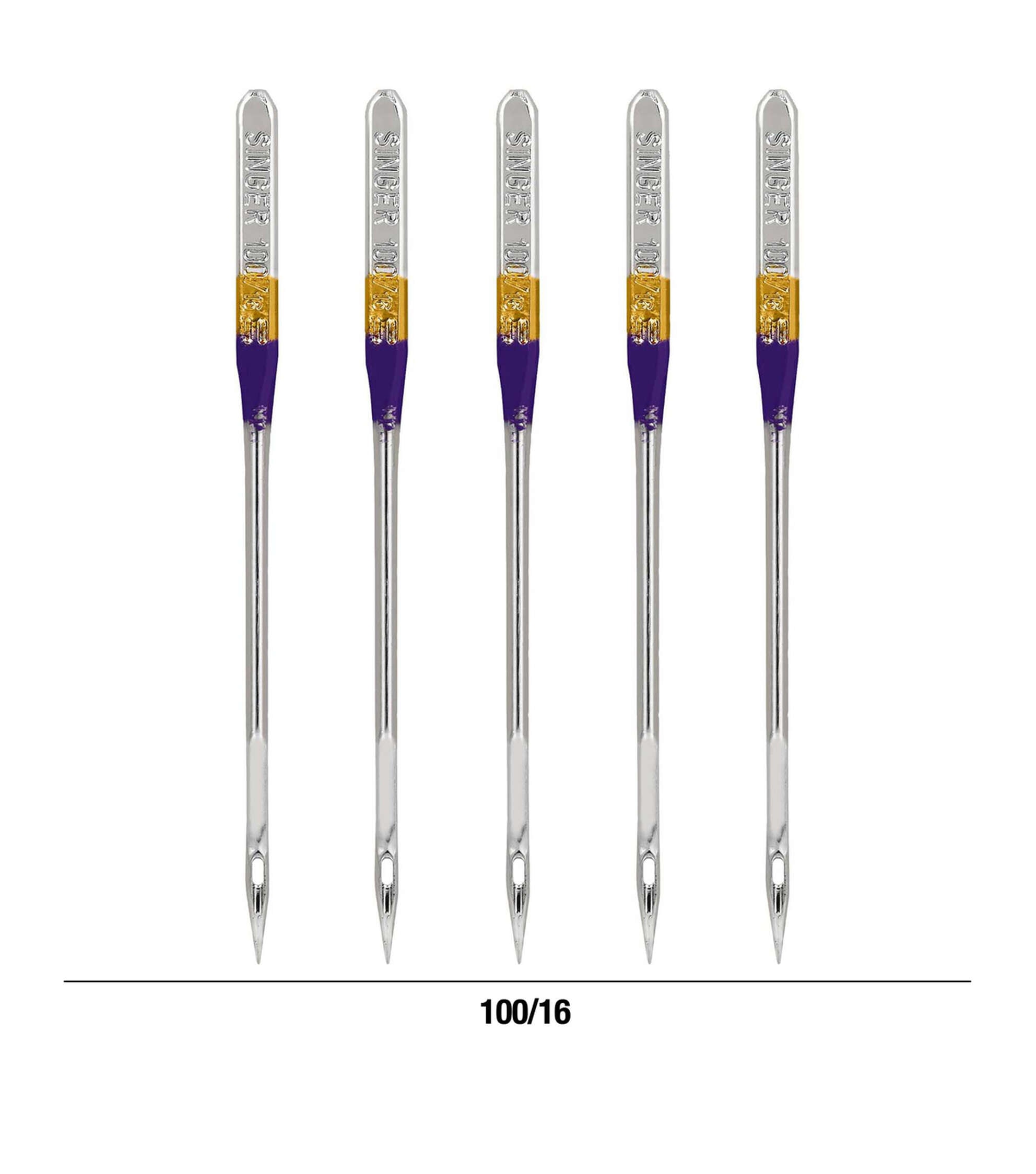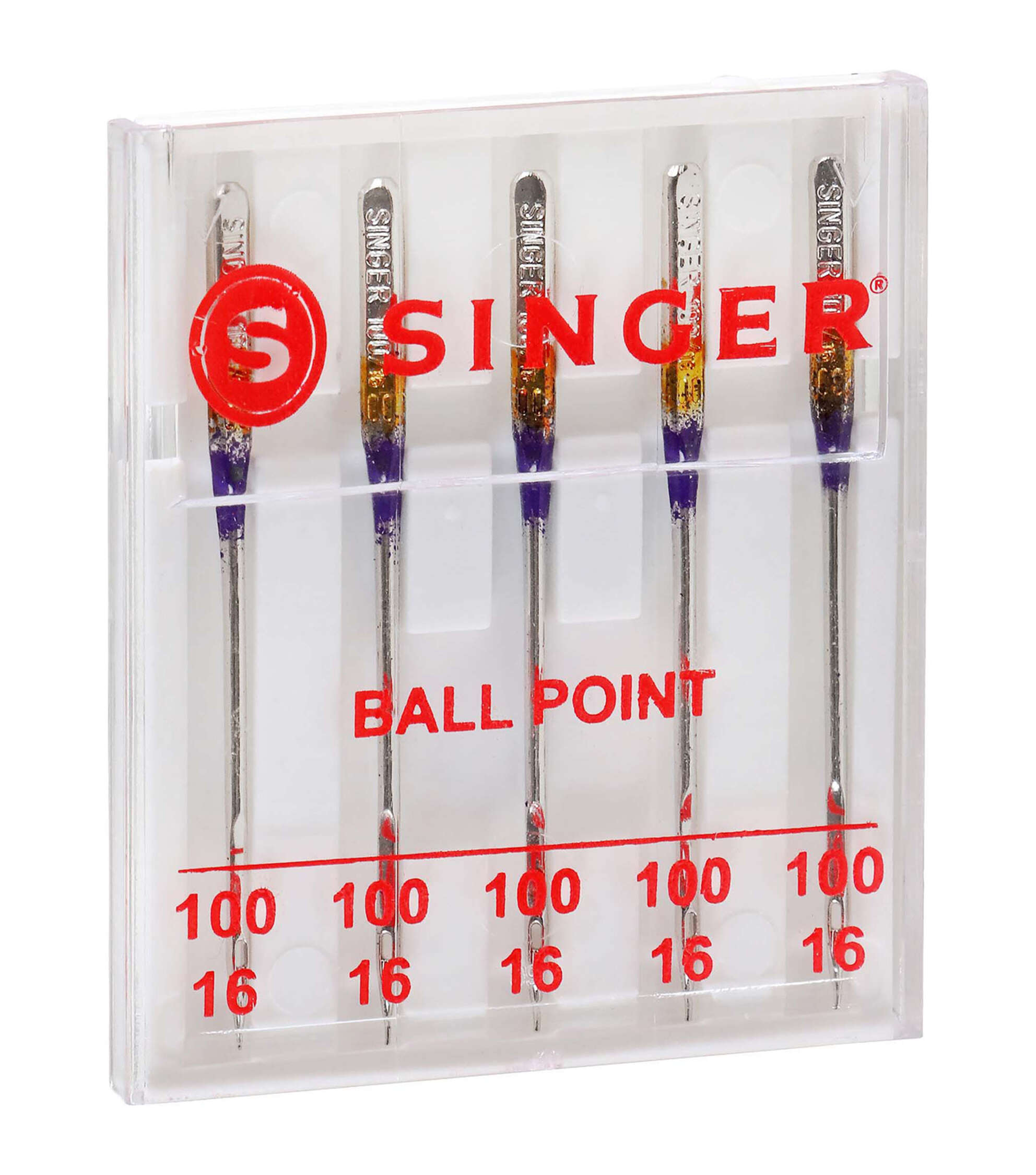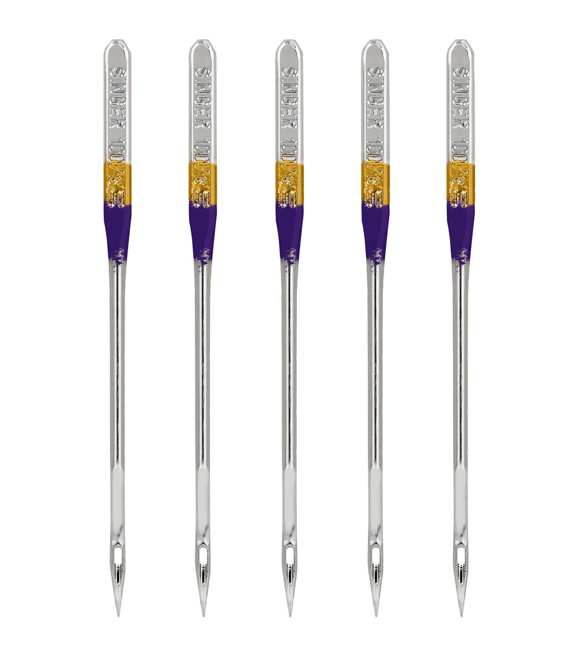 - This pack of 5 SINGER ball point sewing machine needles is the perfect addition to an existing collection of sewing machine needles. The point is designed to slide between fibers of knit fabrics smoothly, without creating holes or runs in knit fabrics. Needles are color coded and sized 100/16, best used for heavy and medium-weight knit fabrics. The SINGER sewing machine needles can be used on SINGER, Brother, Kenmore, Bernina, Janome, Juki and other quality household domestic sewing machines. Domestic machines needles are not compatible with industry sewing machines.