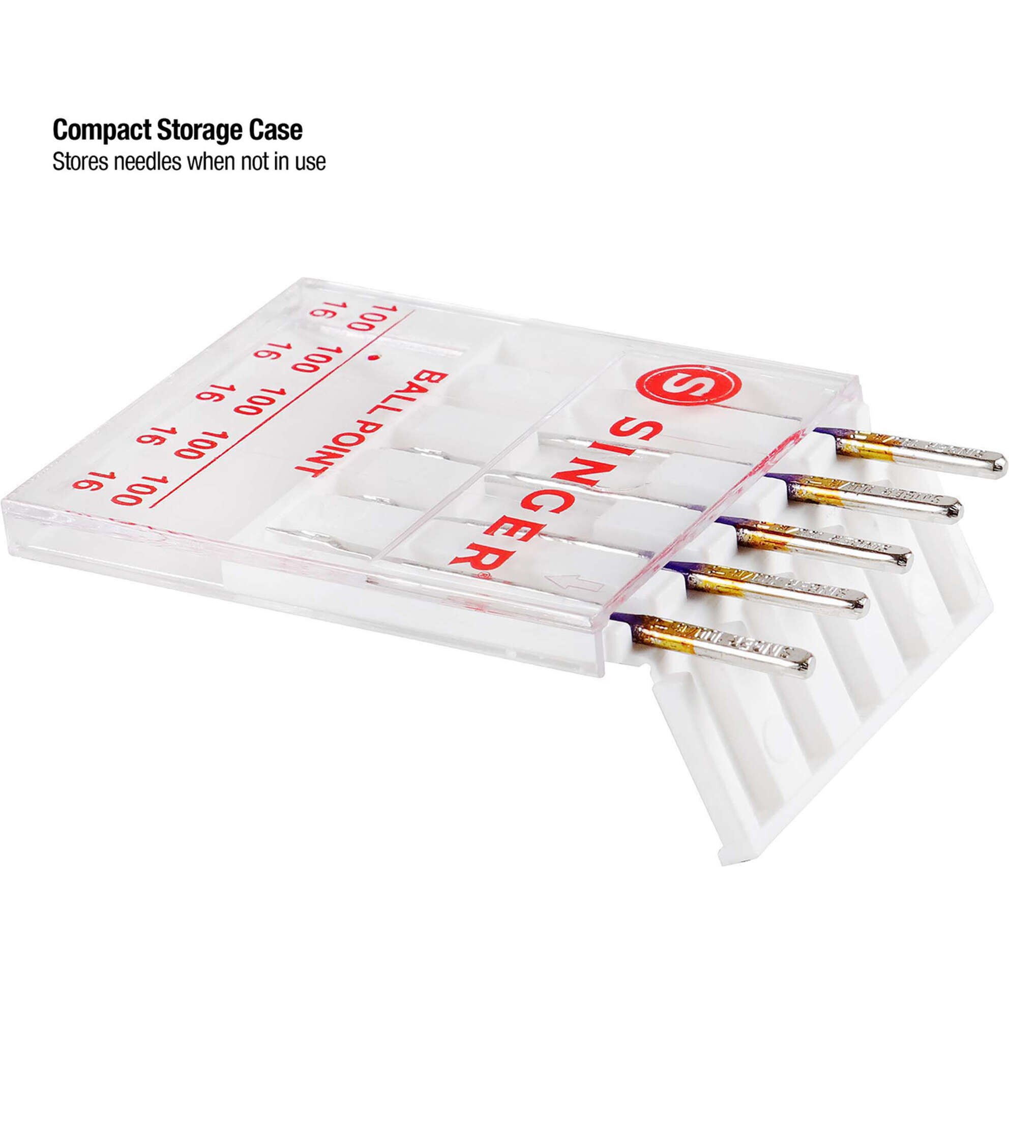 - To prevent needles from going dull when not in use, store needles in the compact transparent case which includes size marking on its cover