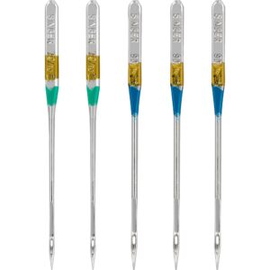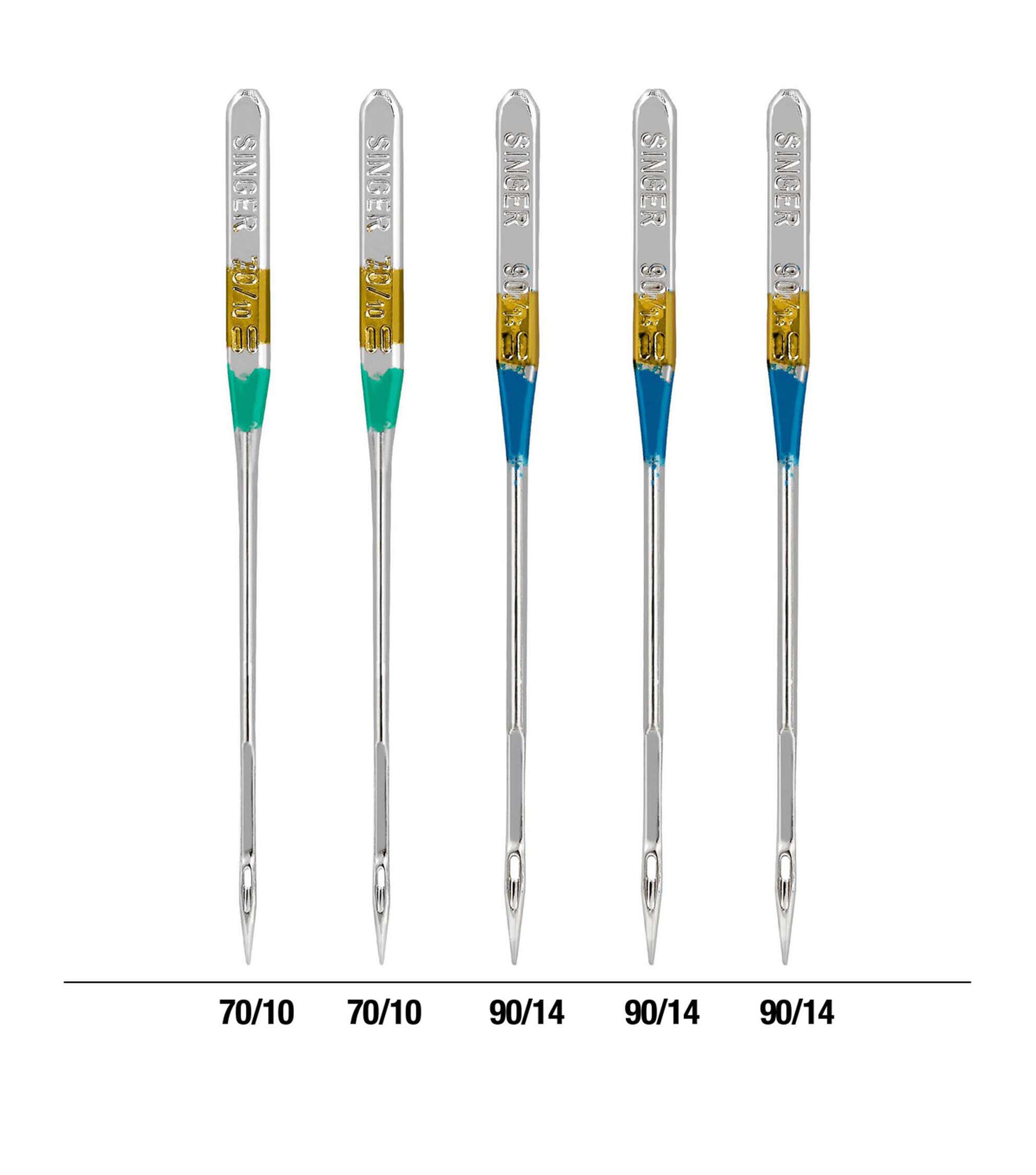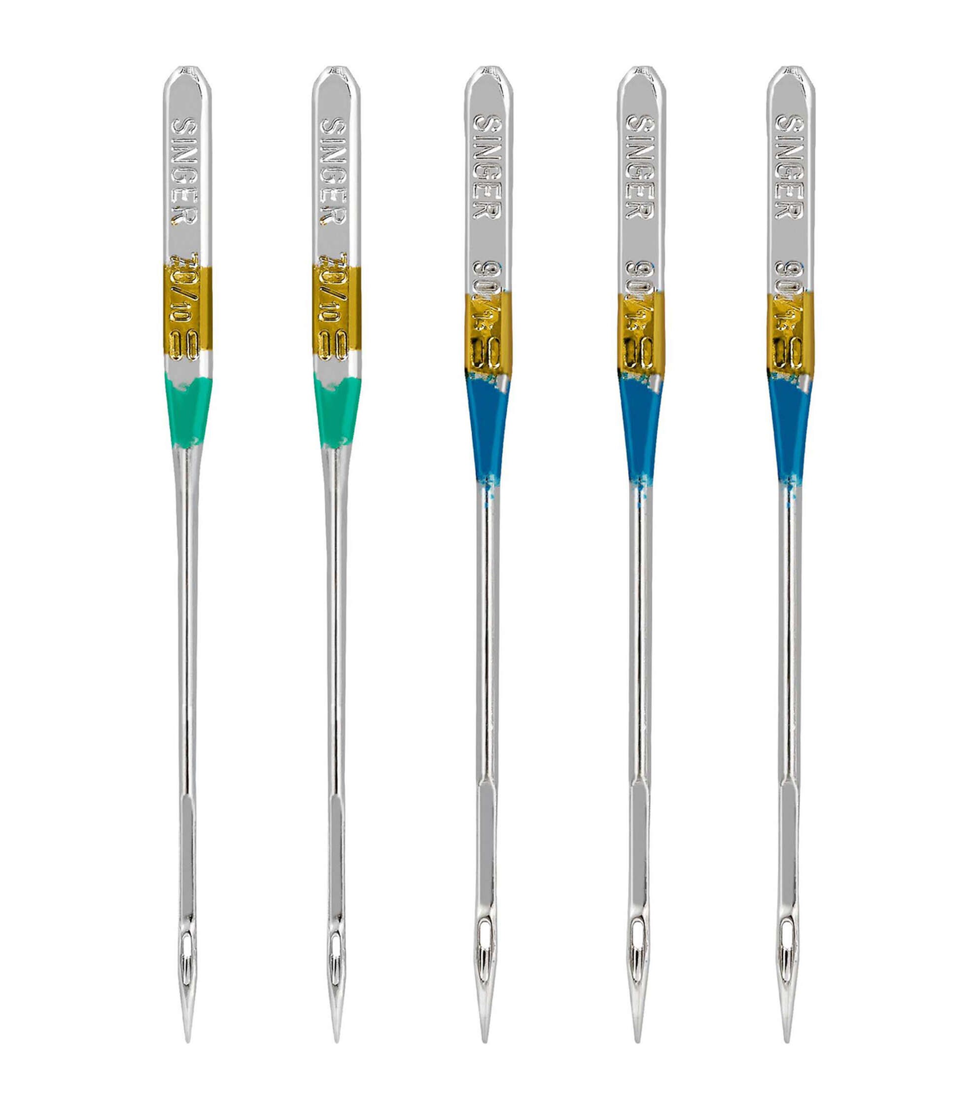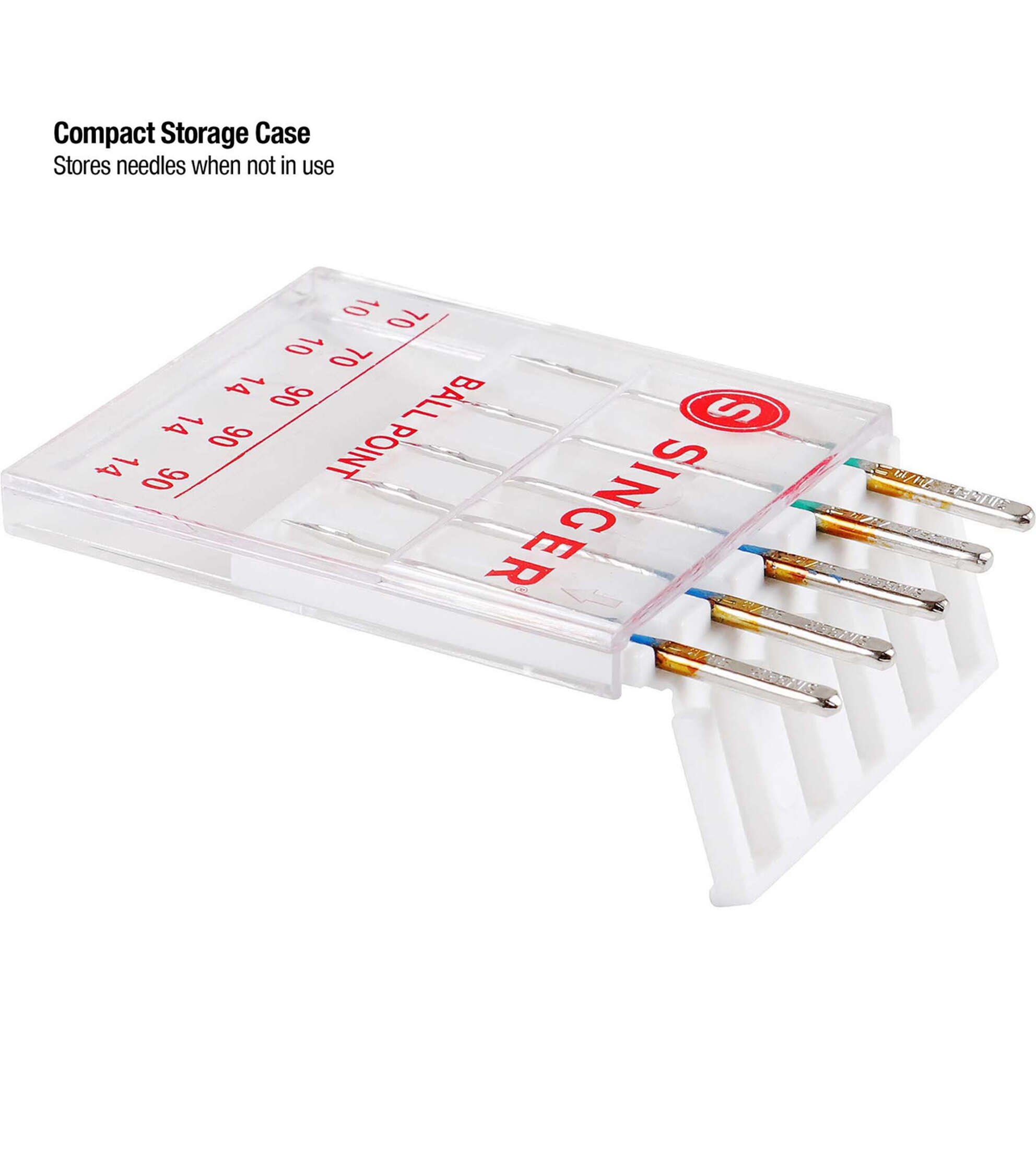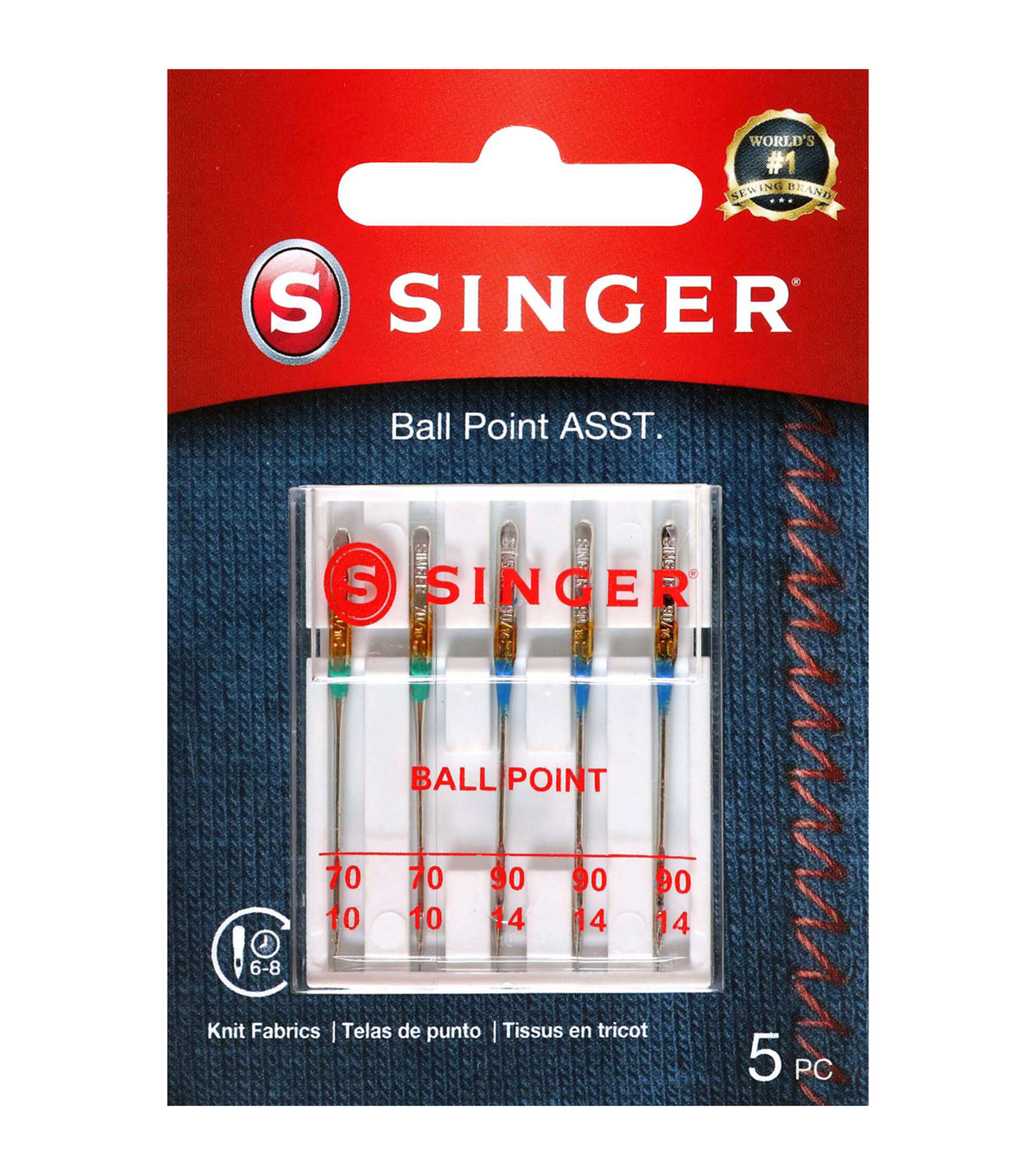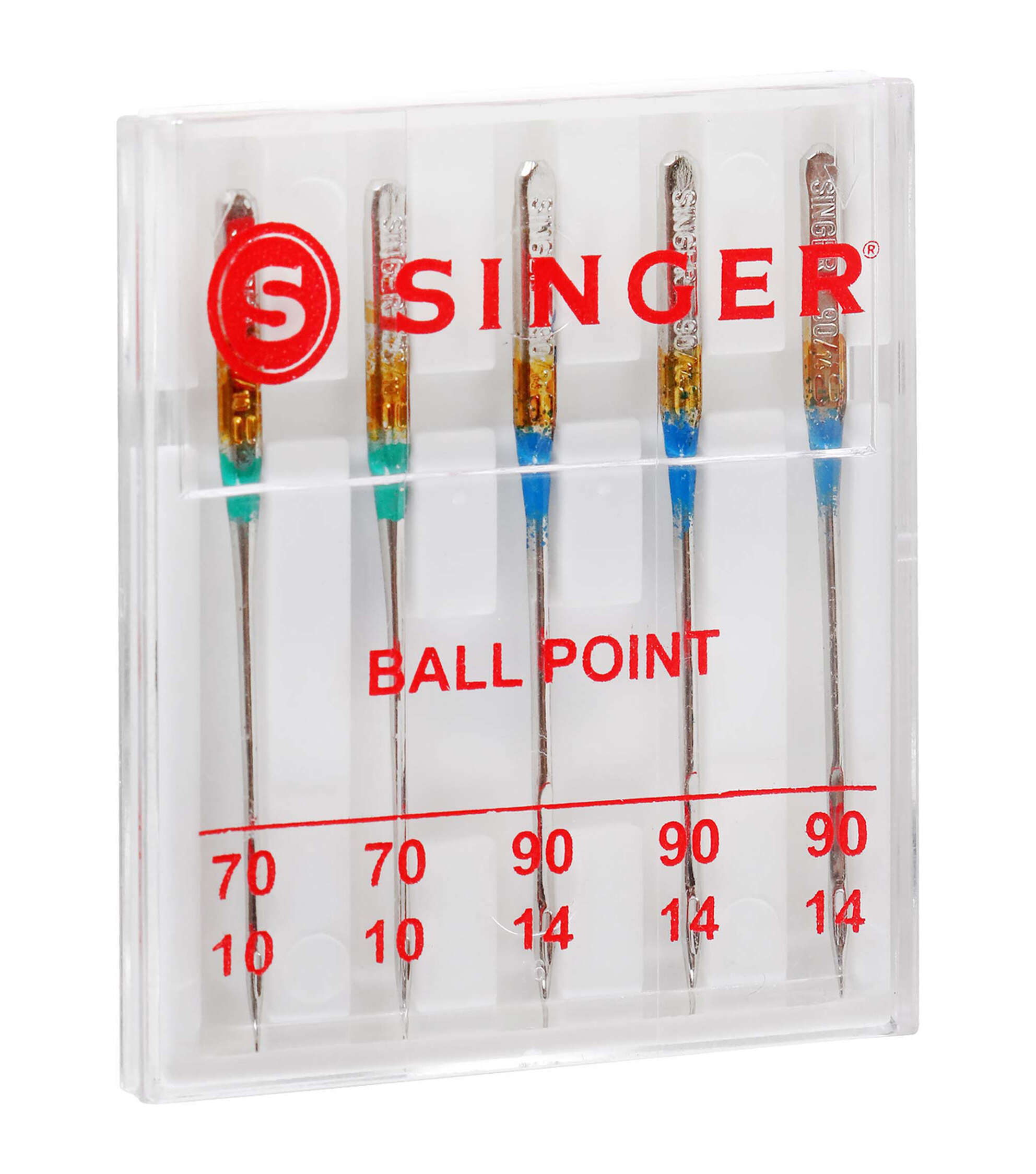 - The pack of 5 SINGER ball point sewing machine needles allows you to perform multiple standard stitching projects on knit fabrics. Ball point needles are best used on knit fabrics. Machine needles are color coded to their sizes, which include: 3 green size 70/10 and 2 orange size 80/12 for use on lightweight fabrics. The needle kit comes in an easy-to-store plastic container with sizes marked on the cover for easy location and replacement. The SINGER sewing machine needles can be used on SINGER, Brother, Kenmore, Bernina, Janome, Juki and other quality household domestic sewing machines. Domestic machines needles are not compatible with industry sewing machines.