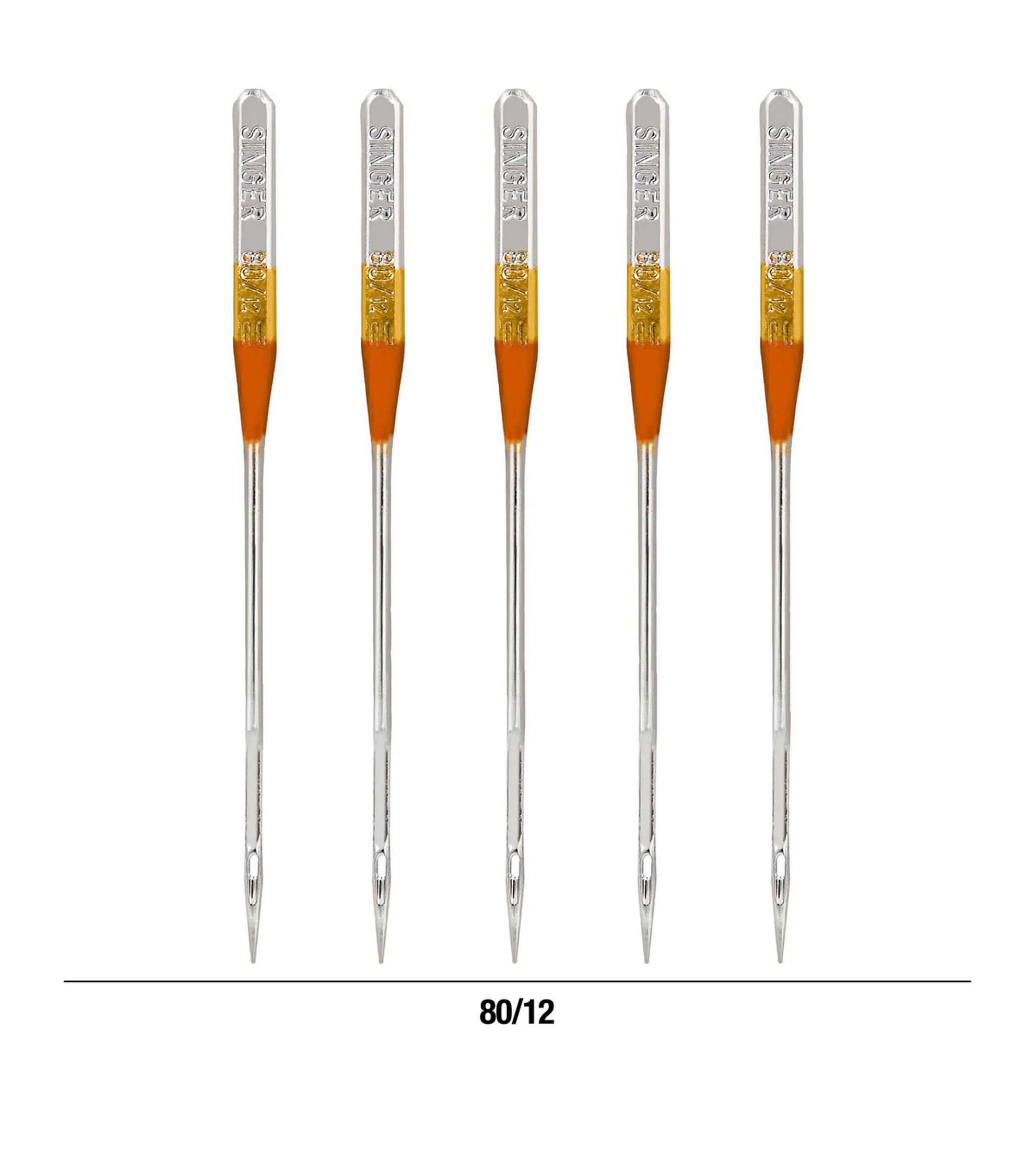 - This pack of 5 SINGER ball point sewing machine needles is the perfect addition to an existing collection of sewing machine needles. The point is designed to slide between fibers of knit fabrics smoothly, without creating holes or runs in knit fabrics. Needles are color coded and sized 80/12, best for use on lightweight fabrics. The SINGER sewing machine needles can be used on SINGER, Brother, Kenmore, Bernina, Janome, Juki and other quality household domestic sewing machines. Domestic machines needles are not compatible with industry sewing machines.