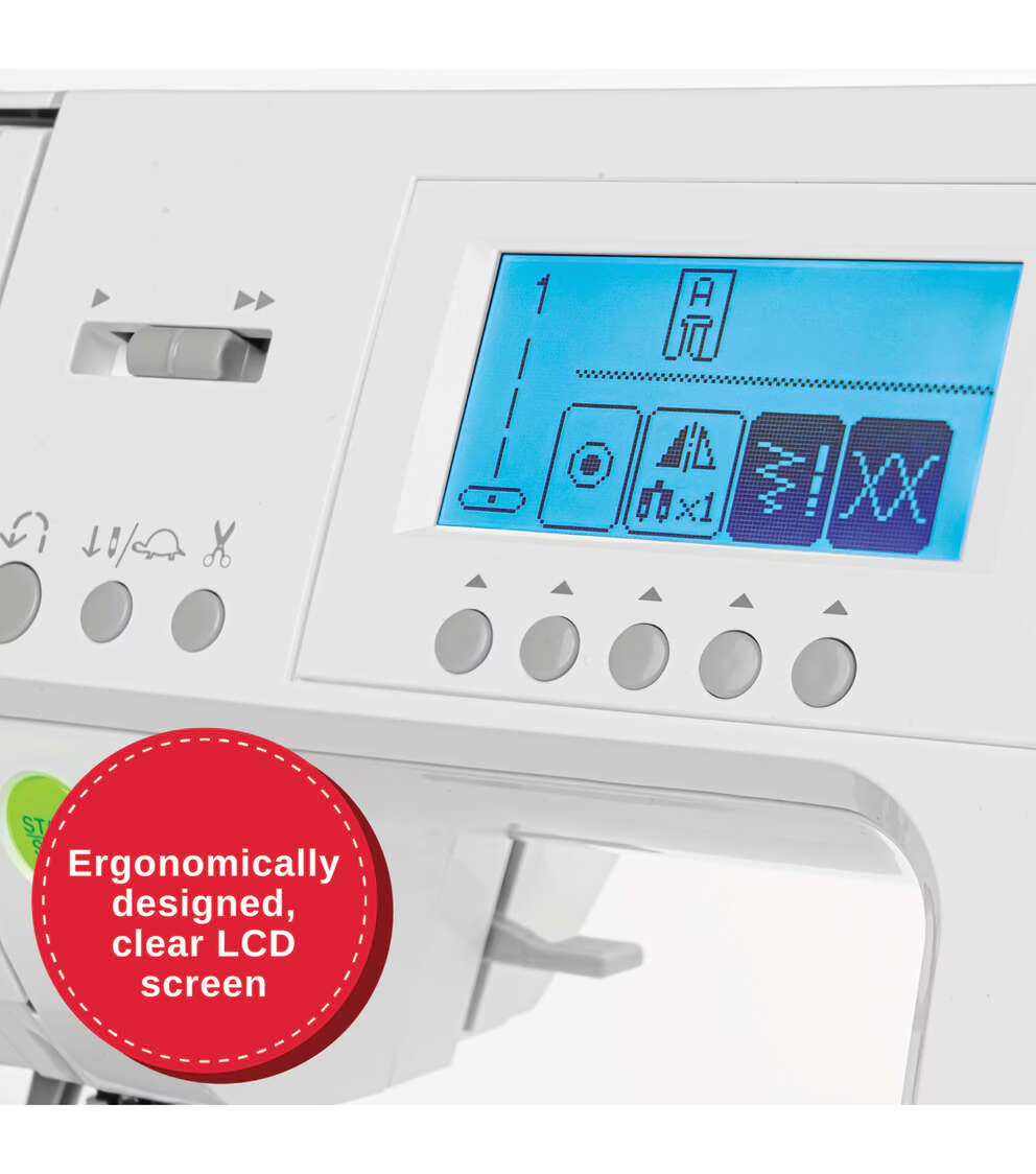 - ERGONOMIC LCD SCREEN-See before you sew at the perfect viewing angle. Easily view your stitch number, settings & more!