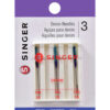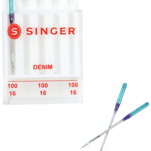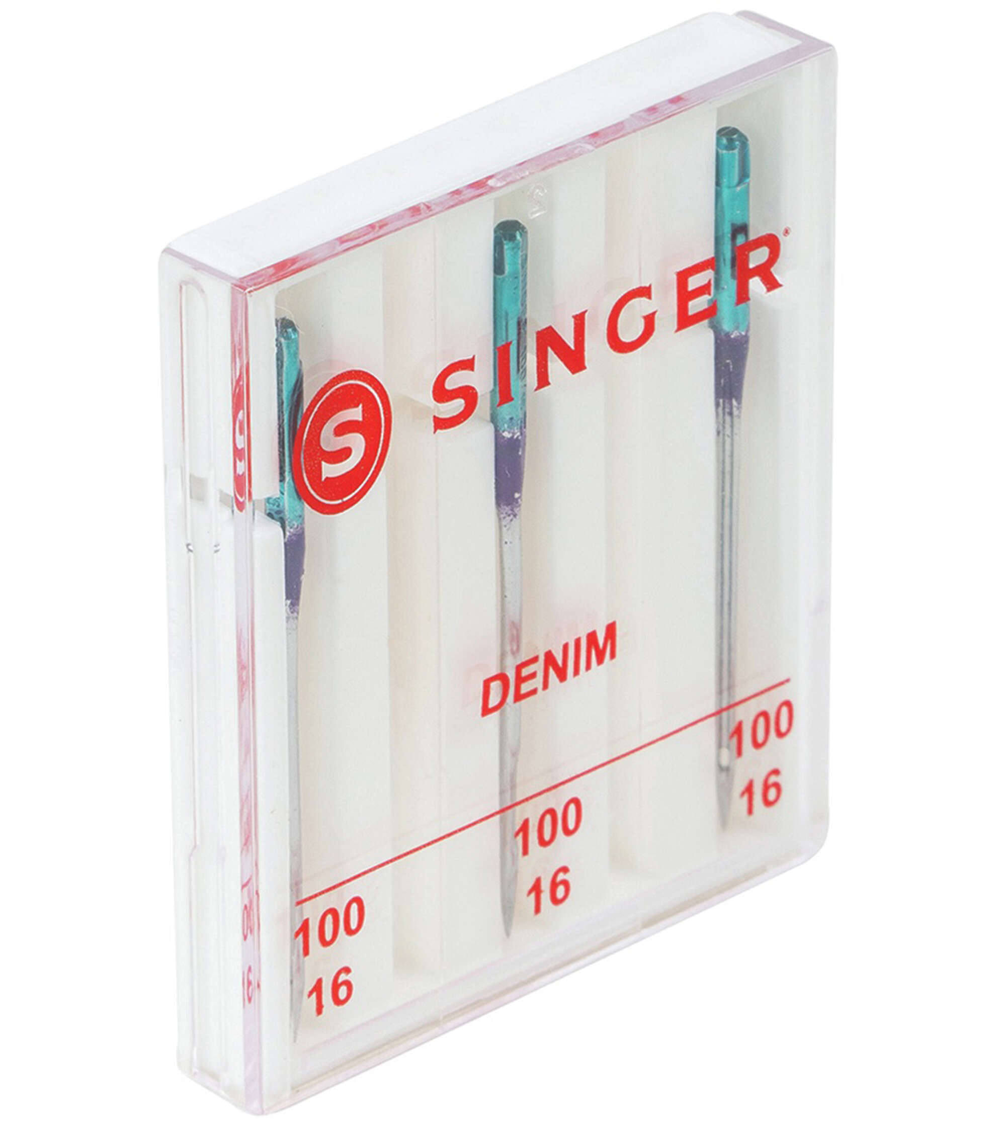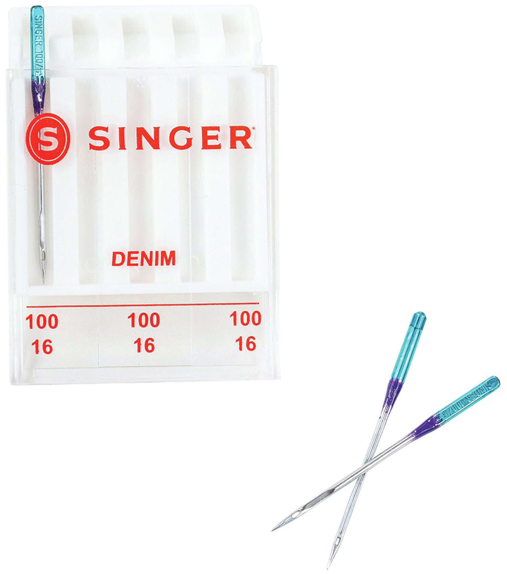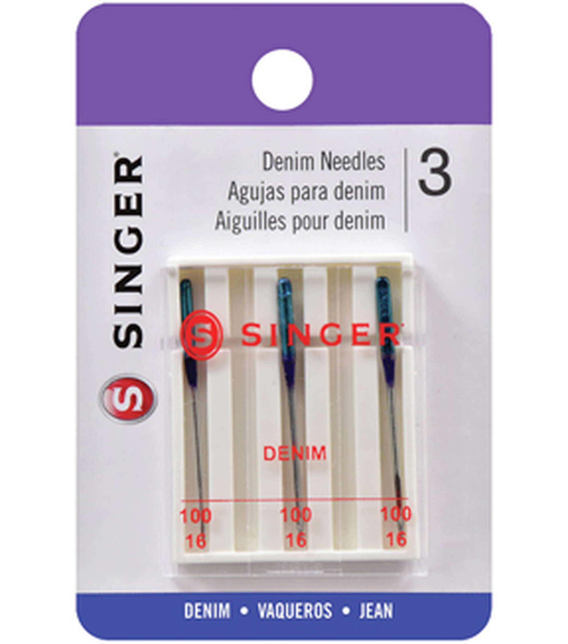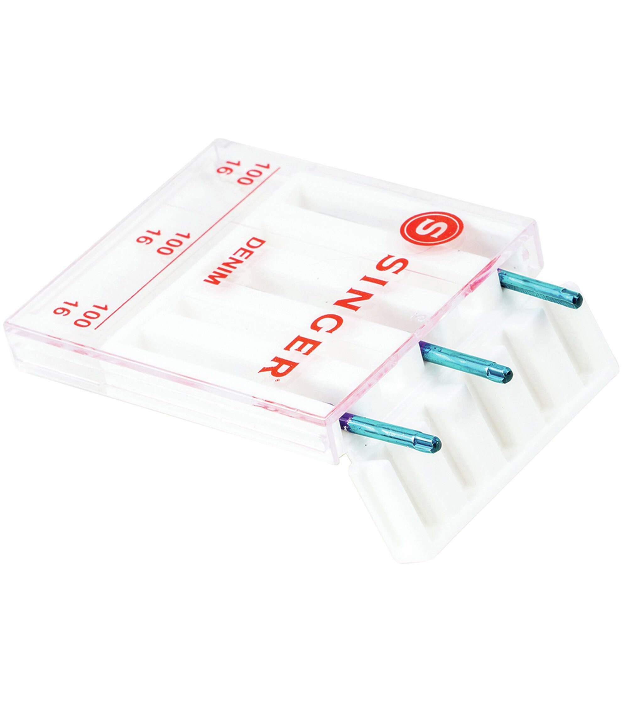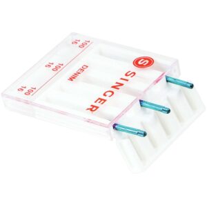 The Singer Denim Machine Needles are used for stitching on denim and other heavyweight or layered fabrics. You can also use them for mending thick clothes or in crafting projects. These needles are encased in a safe compact storage case with the sizing marked on its clear cover. They are compatible with Singer, Brother, Kenmore and other quality sewing machines. This pack includes three needles in size 100/16.