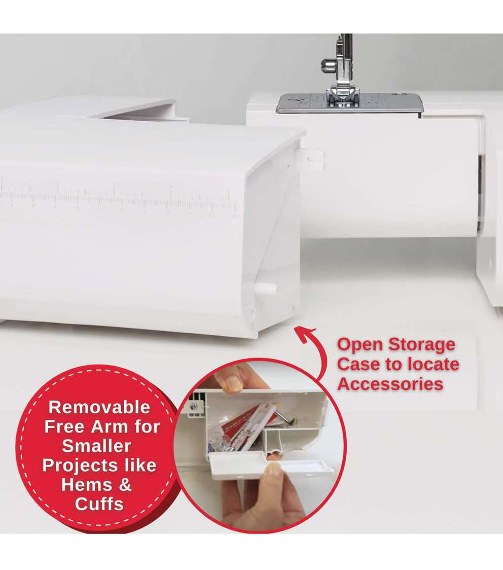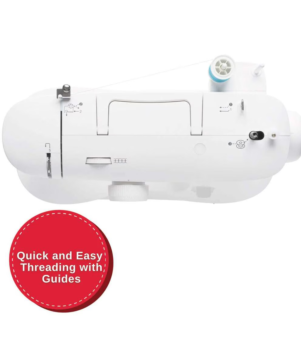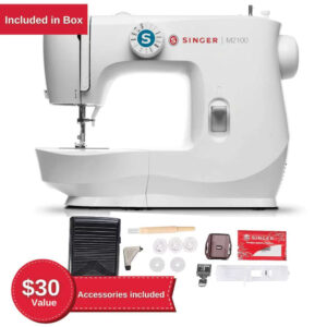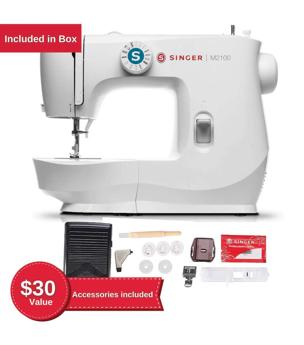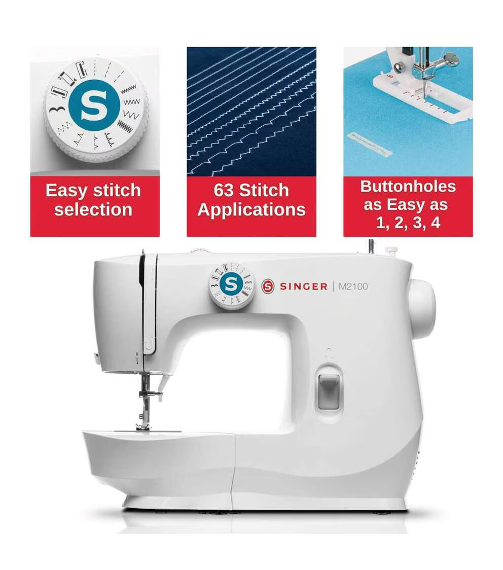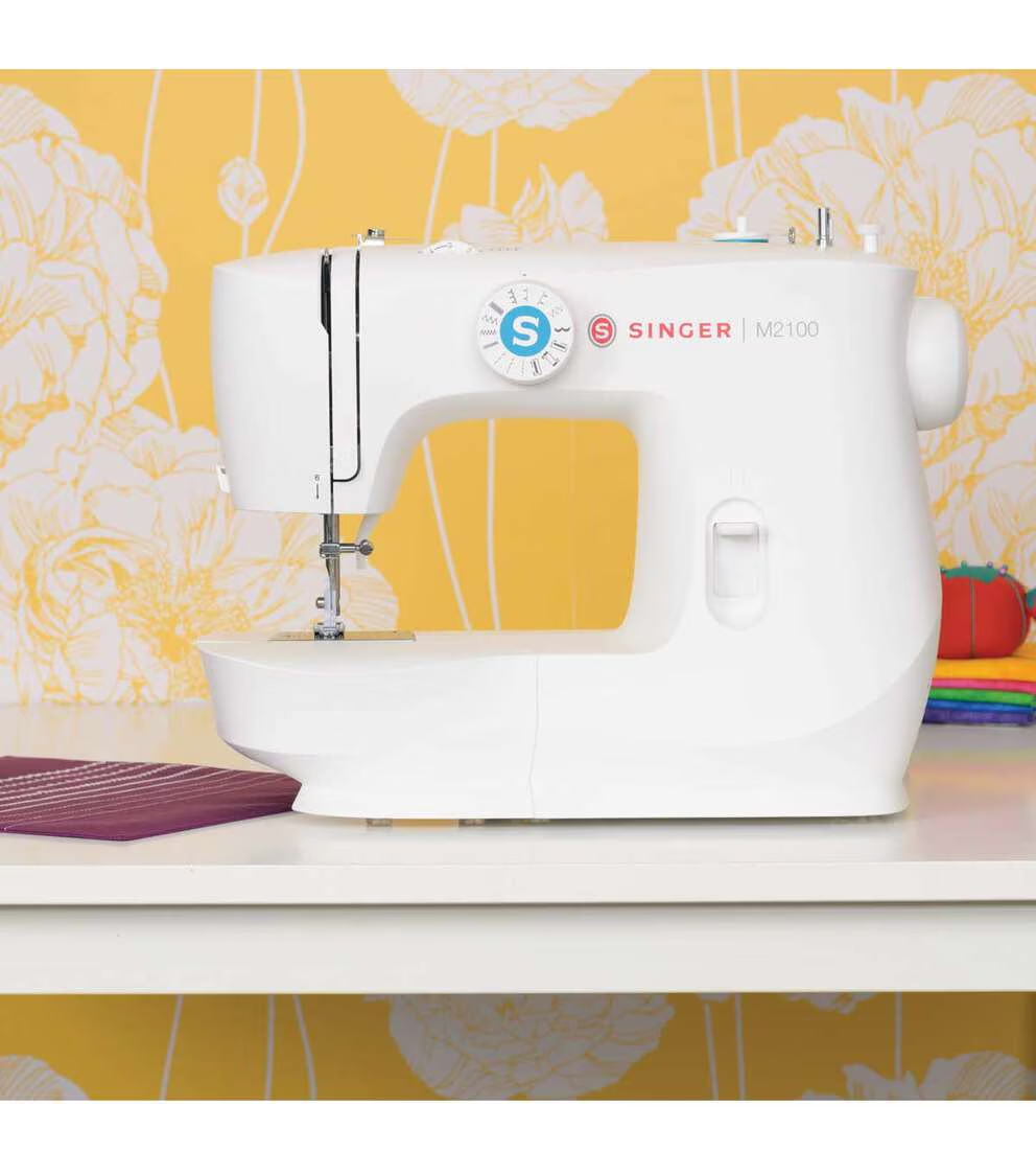 The SINGER® M2100 is designed for all the things sewists on-the-go love to do… Mend, Quilt, Create, and more. This lightweight and portable machine is easy to carry and easy to store, while its full size sewing area accommodates your sewing and quilting projects easily. From zig zags to a blind hem, the SINGER® M2100 includes 63 essential Stitch Applications. Just choose the stitch you need with the turn of the dial, and you’re ready to sew! Stitch length and stitch width are preset for you, eliminating guesswork – perfect for the beginner! Enjoy features for sewing convenience like an illuminated sewing space with STAYBRIGHT™ LED lighting, easy threading, and a removable free arm for smaller projects. Plus, with four included Presser Feet, you’ll have the essential tools needed for your next sewing creation!