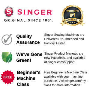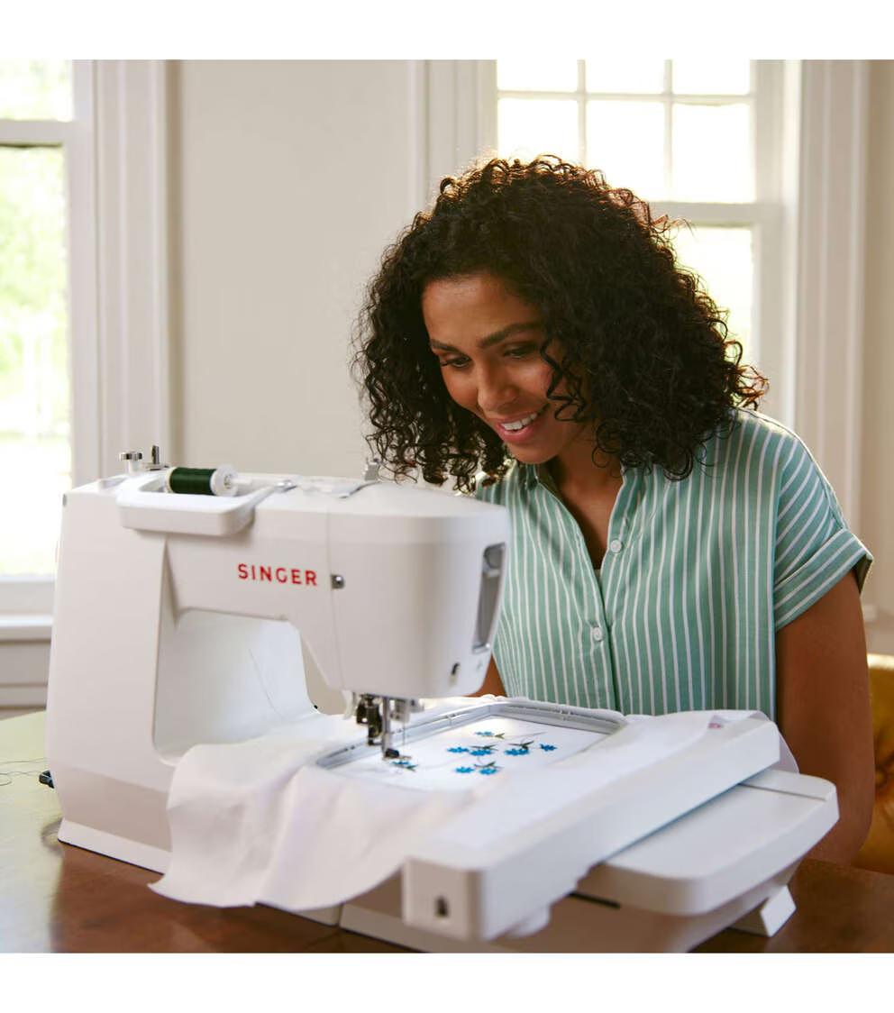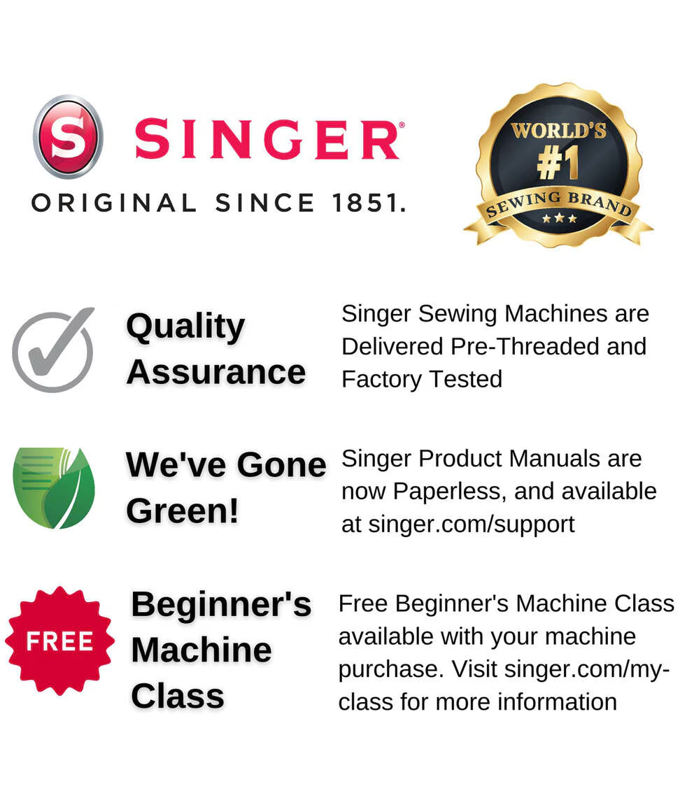 - Sewing Machine Accessories that Make Projects Come to Life- Embroidery Hoop 170x100mm (6 3/4 in x 4 in), 6 Snap-On Presser Feet (All-Purpose Foot, Satin Stitch Foot, Blind Hem Foot, Zipper Foot, One-Step Buttonhole Foot and Free-Motion/Darning Foot), SINGER Class 15 transparent Bobbins, Thread Spool Caps, Spool Pin Felt, Screwdriver, Multi-Purpose Tool, Seam Ripper, Thread Net, Auxiliary Spool Pin, Brush, Pack of Needles, Edge/Quilting Guide and Stylus.