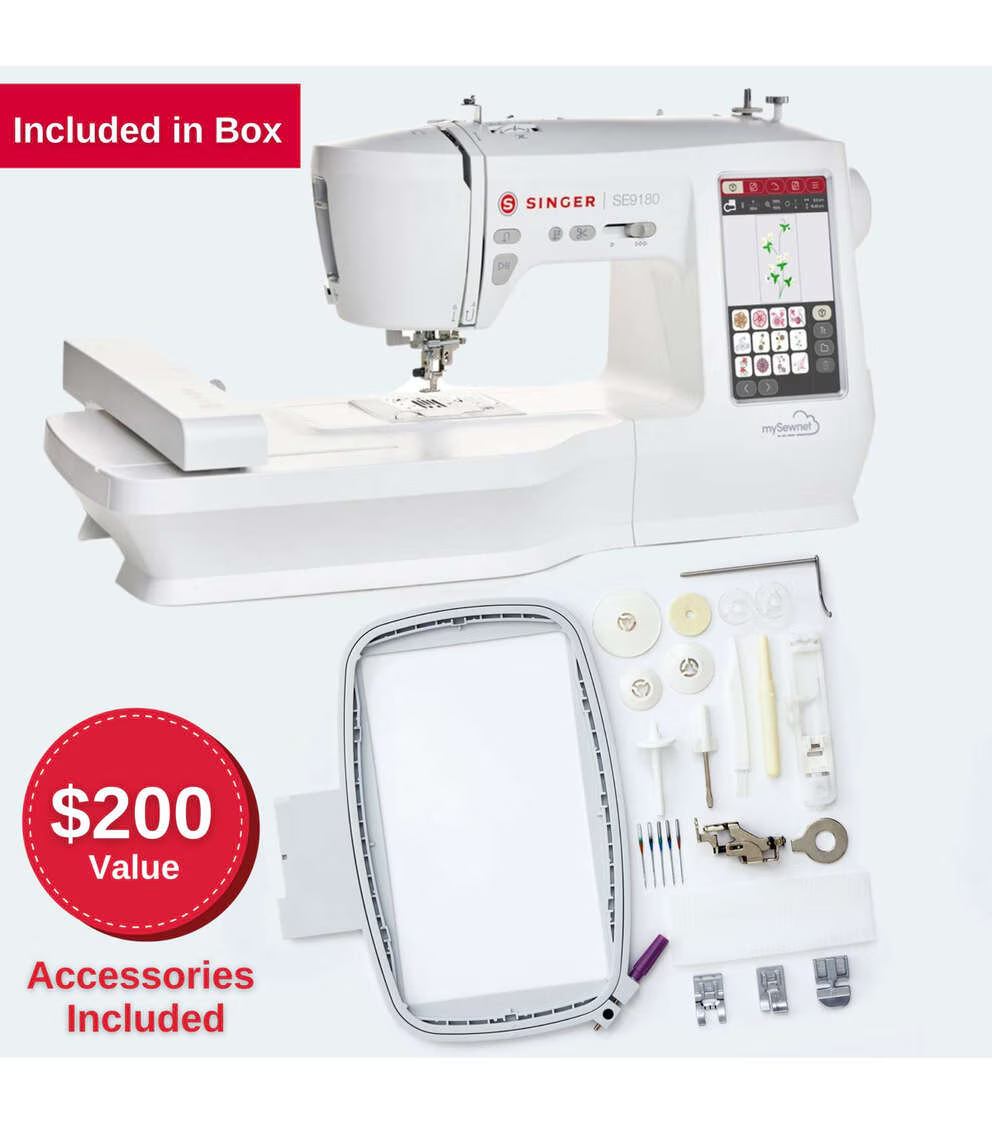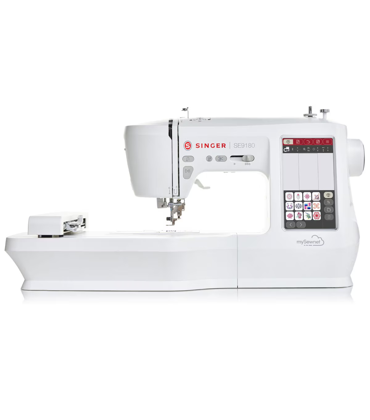 The SINGER SE9180 sewing and embroidery machine is loaded with user-friendly features that sewists of all levels love like a large 7″ touch screen so you can clearly see what you are stitching, and an automatic needle threader that will get you sewing in no time at all. Also, mySewnet connectivity gives you a whole world of possibilities from app notifications of your embroidery progress, to creating designs from scratch and so much more. Plus enjoy a 90-day free-trial of mySewnet software and the mySewnet Library, which has thousands of designs to choose from. With over 150 built-in embroidery designs and over 250 stitches, you get the best of both worlds with the Singer SE9180 sewing and embroidery machine.