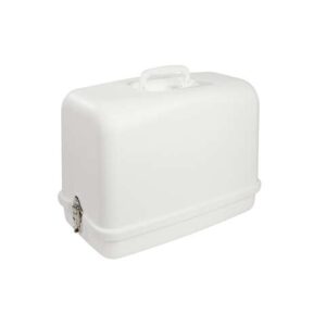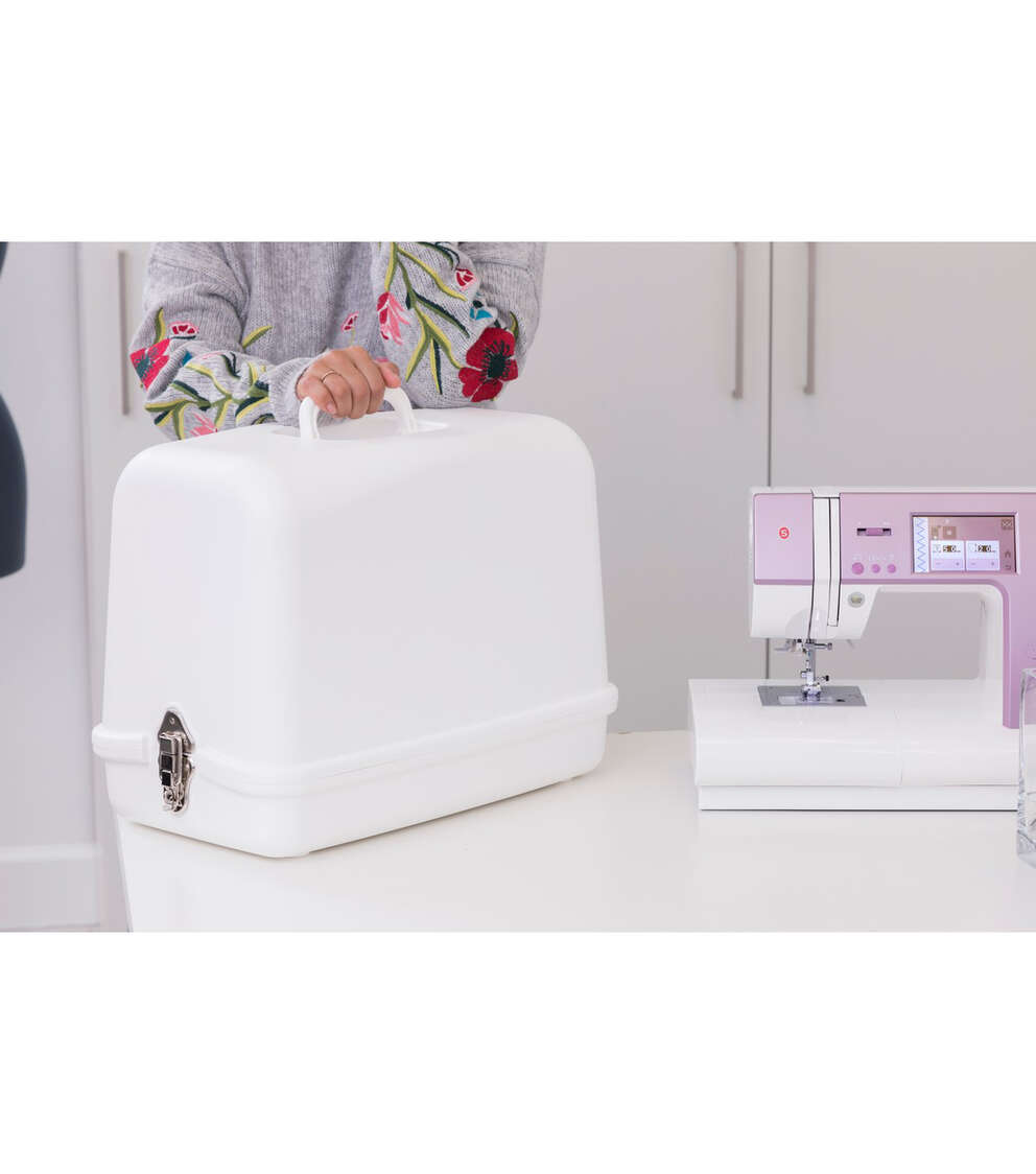 Singer Universal Carrying & Storage Sewing Machine Case is made of impact-resistant plastic. It fits most brands of free-arm sewing machines and small overlock machines. Lightweight, yet durable, it’s great for travel. This sewing machine case provides dust-free storage for machines not in use, and features safety ‘sure-lock’ metal latches, as well as a built-in handle.