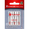 The Singer Universal Heavy Duty Sewing Machine Needles are just what you need for stitching on heavyweight fabrics such as denim, drapery fabrics, wool and corduroy. These needles are color-coded in a silver tone while the plastic case holder comes with markings for ease of recognition. This pack includes three heavy-duty sewing machine needles in size 110/18. They are compatible with Singer, Brother and Kenmore and other standard sewing machines.