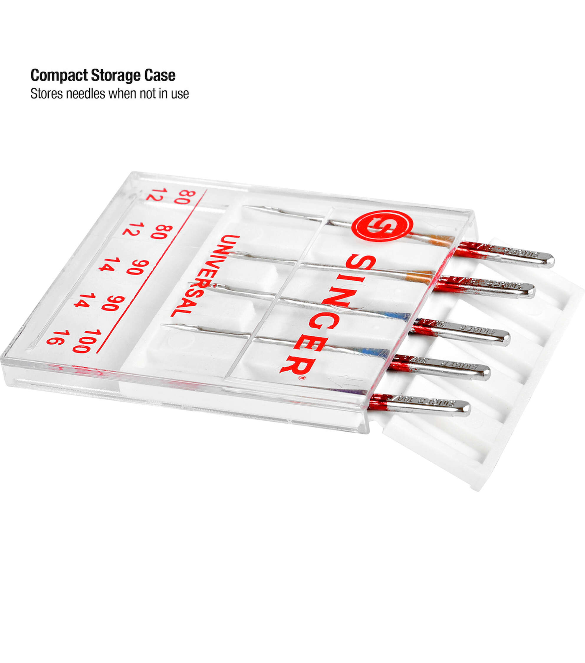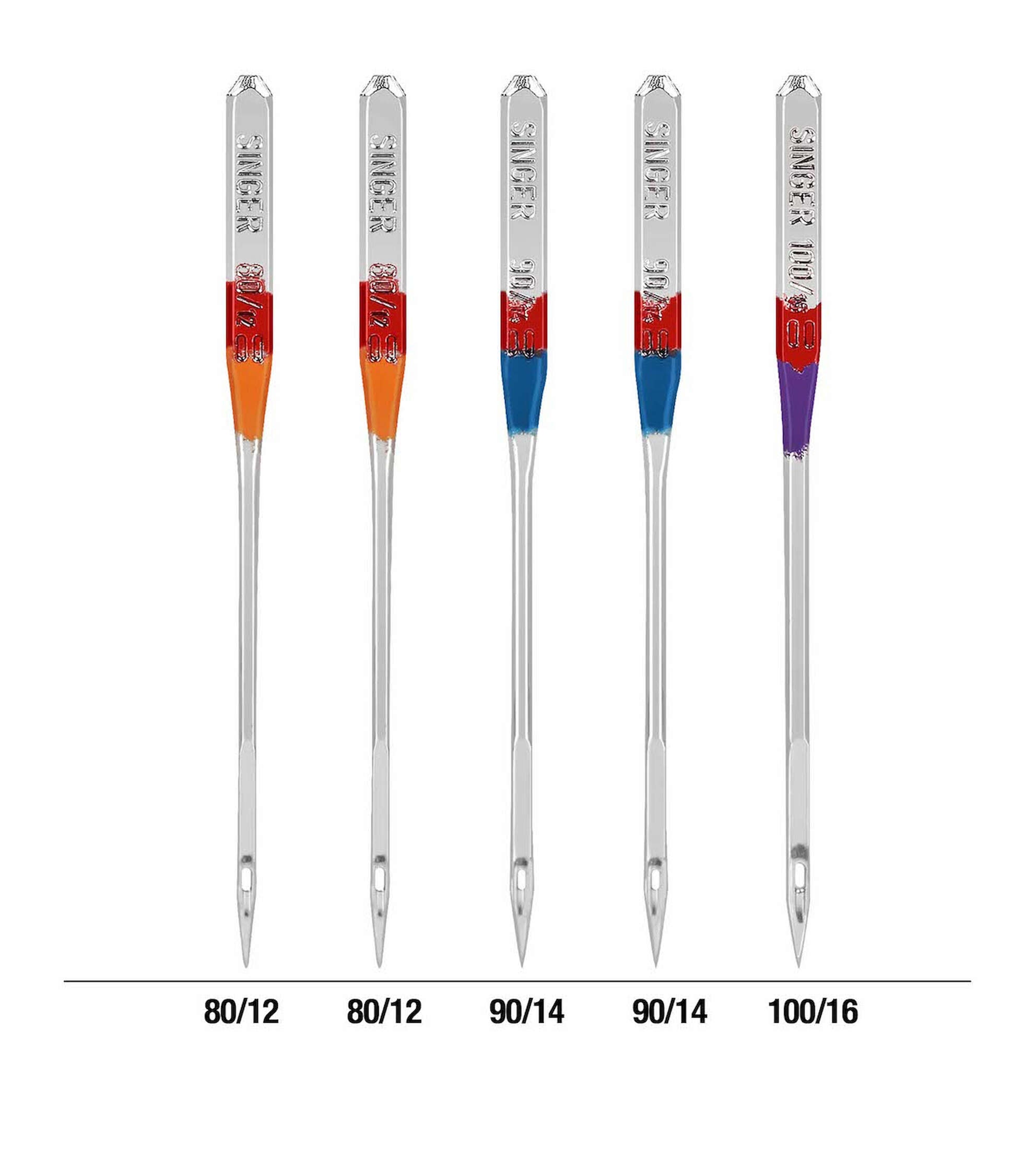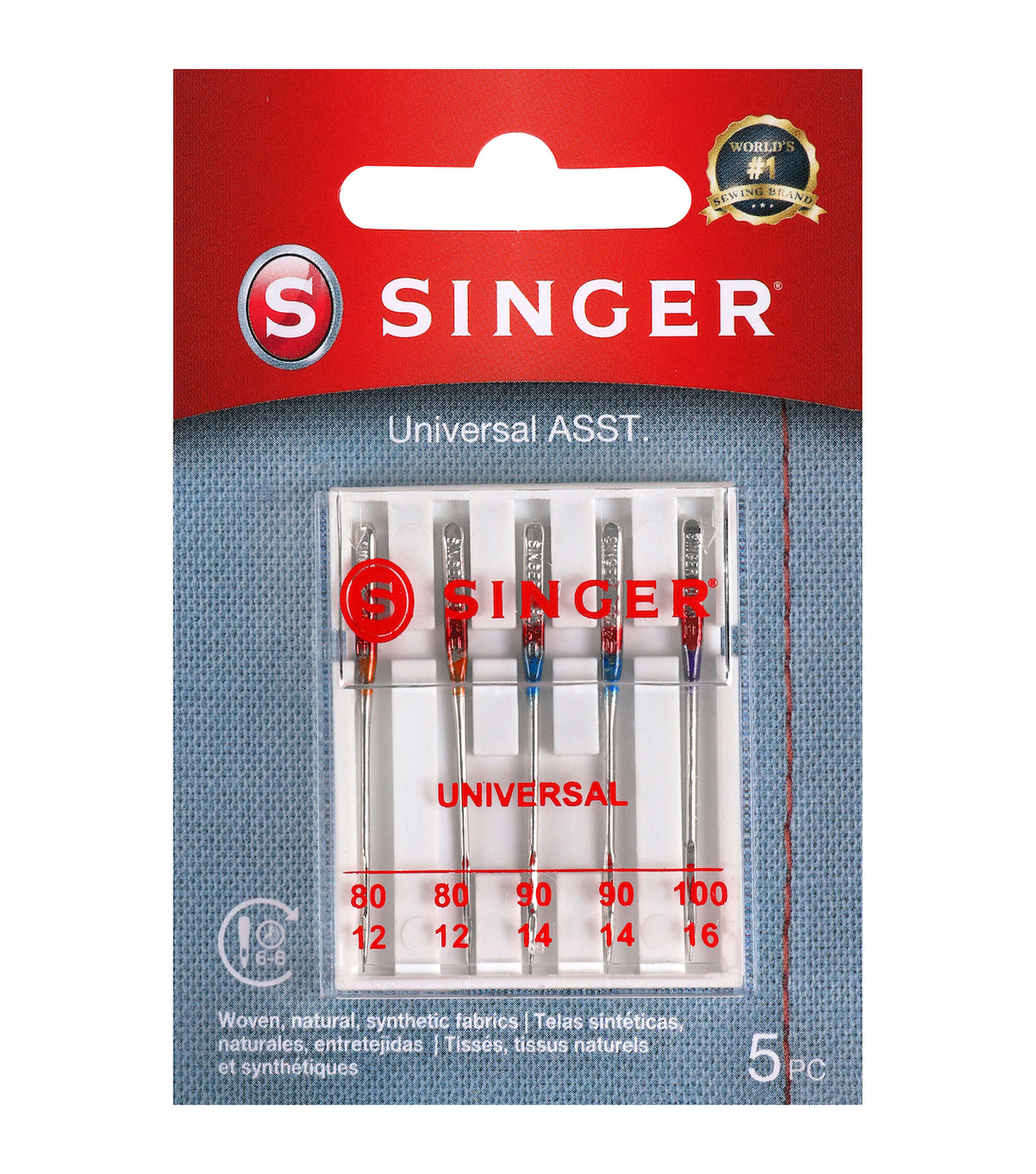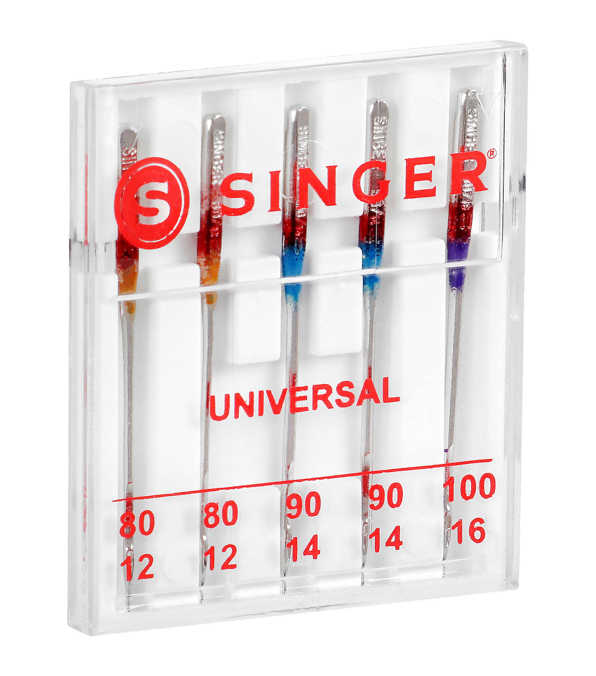 Perform multiple standard stitching projects on woven fabrics using the Singer Assorted Universal Regular Point Machine Needles. They are color-coded to their sizes, making them easy to identify and come in a convenient plastic container with size markers on the clear cover. These all-purpose regular point sewing needles are compatible with standard sewing machines. Use the orange size 80/11 needles on lightweight woven fabrics, blue size 90/14 on medium-weight woven fabrics and purple size 100/16 for heavyweight woven fabrics. This pack includes a set of five all-purpose regular point machine needles in assorted sizes.