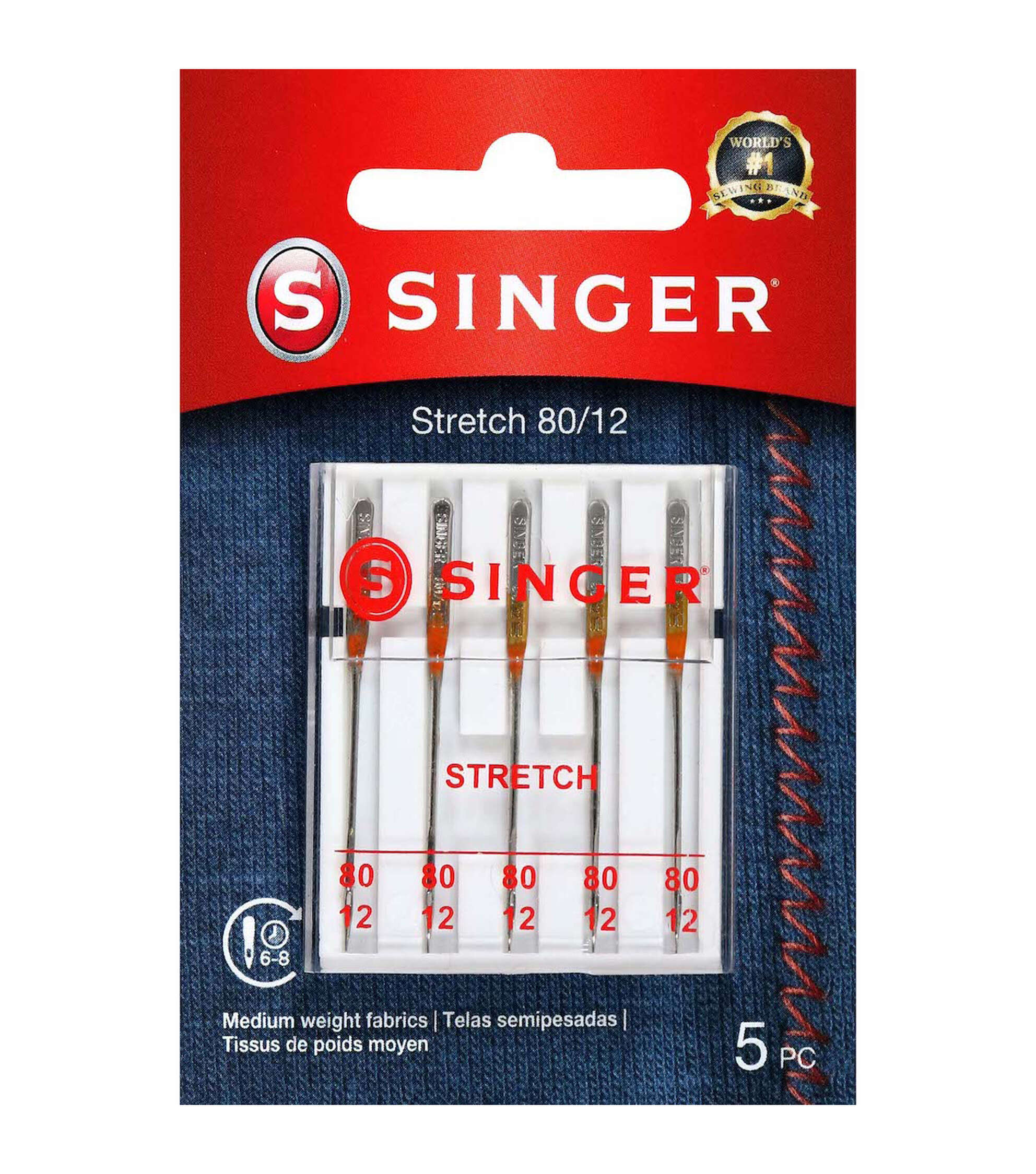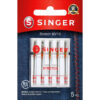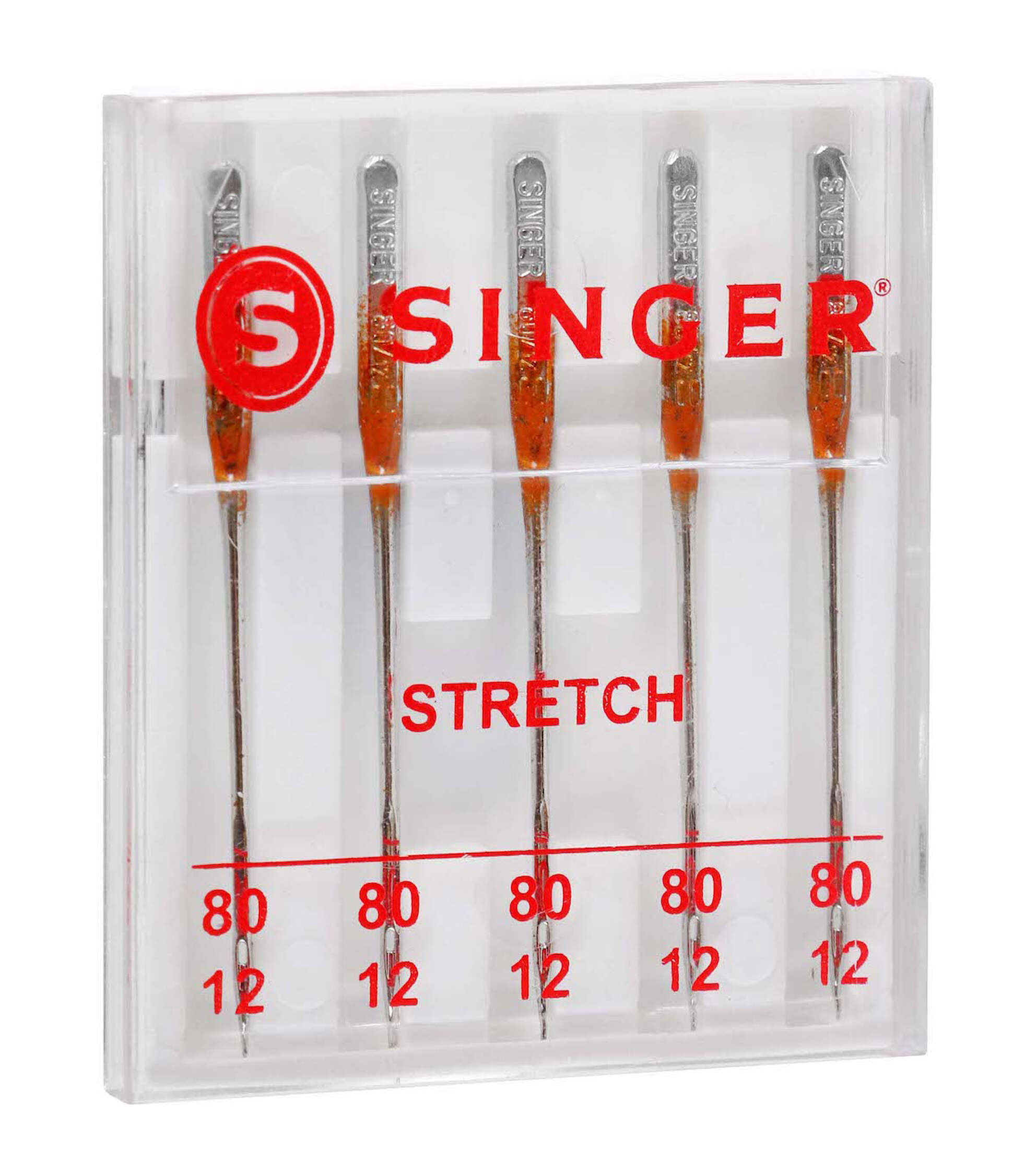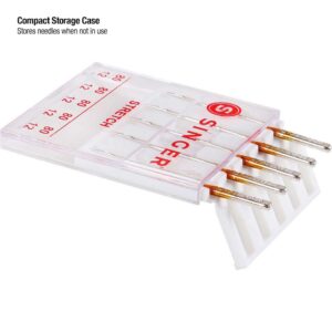 The Singer Universal Stretch Sewing Machine Needles are designed to prevent skipped stitches when working on spandex, lycra and suedes. This pack contains five size 80/11 needles that are best used on lightweight, stretch fabrics. They come in a compact case with sizing marked on the cover.