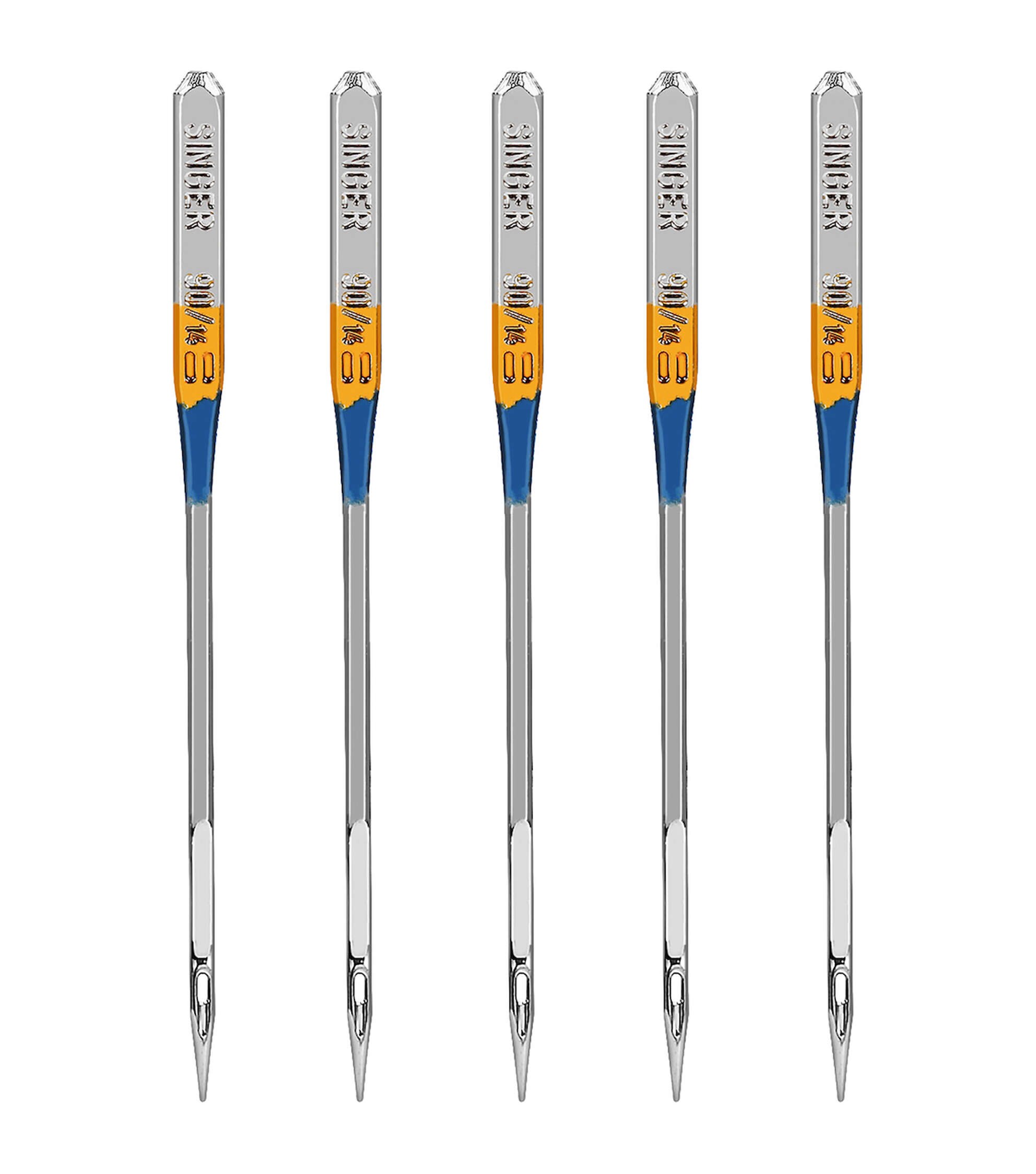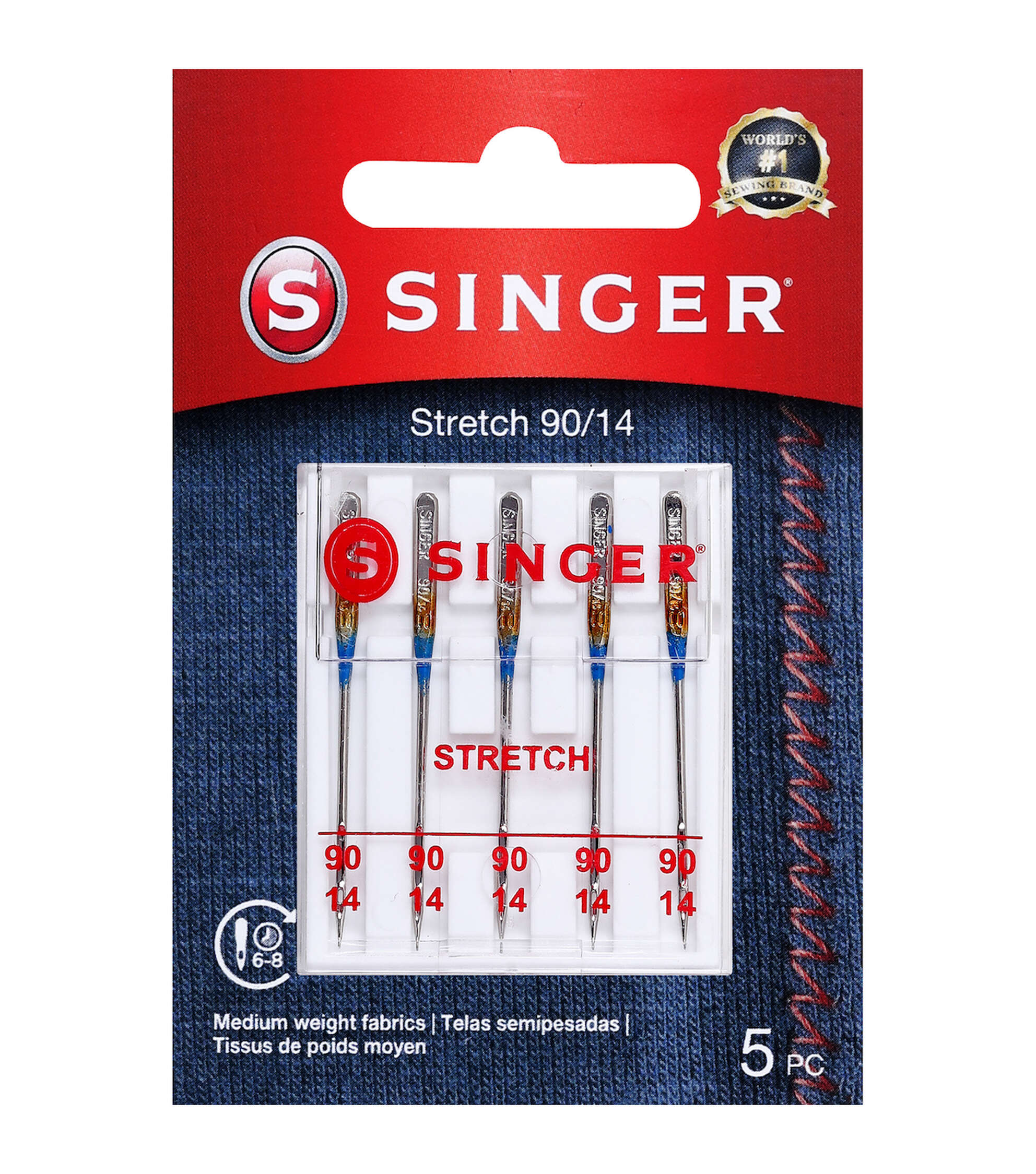 Use the Singer Universal Stretch Sewing Machine Needles to prevent skipped stitches when working on spandex, lycra and suedes. This pack contains five size 90/14 needles that are often used on extremely stretchy clothing such as swimsuits and gym wear. They come in a compact case with sizing marked on the cover.
