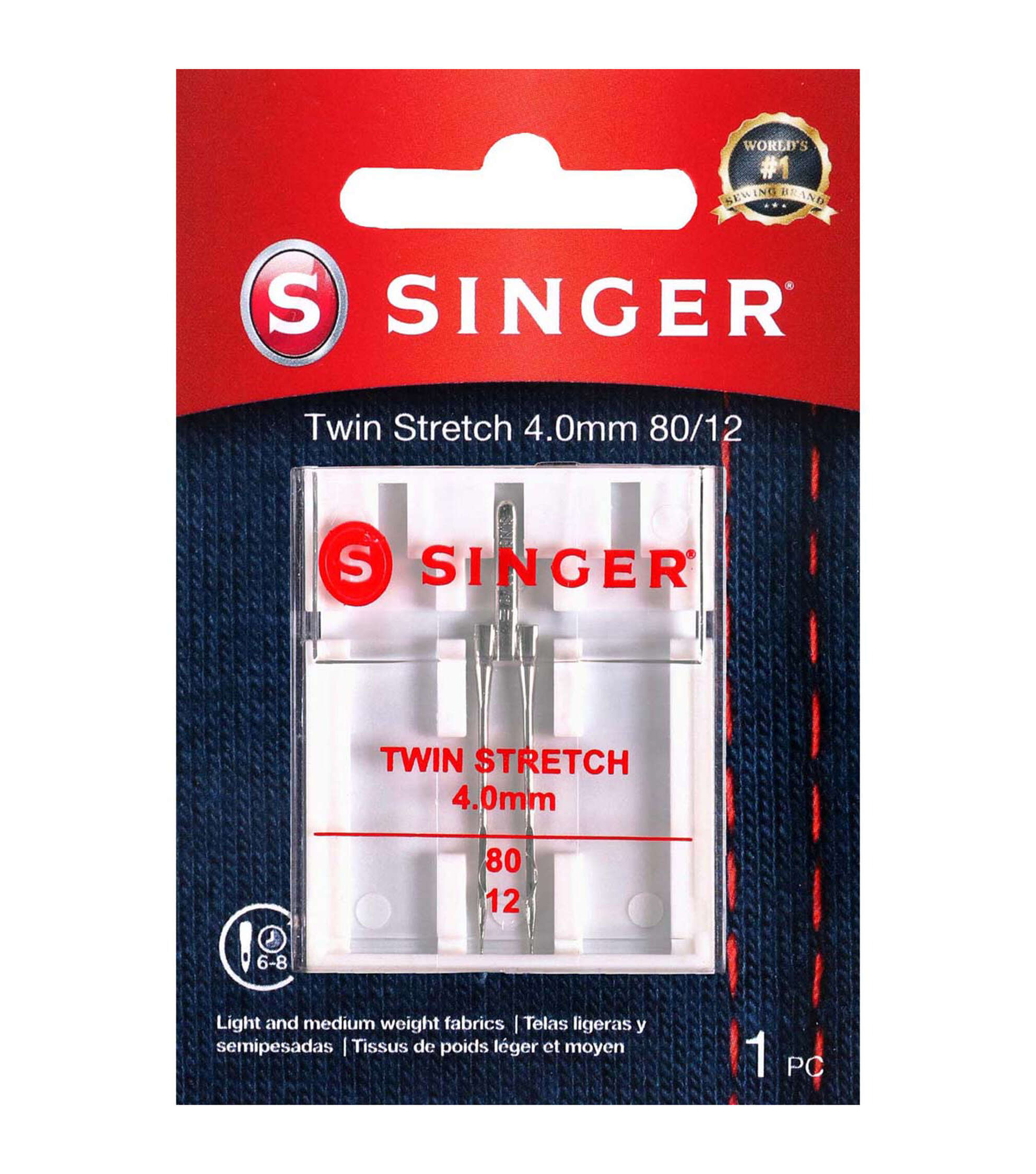 The Singer Universal Twin Stretch Sewing Machine Needle offers a smooth sewing experience while creating two rows of stitches simultaneously. It is designed to prevent skipped stitches when working with spandex, lycra and suede and shredding or breaking the threads. This pack includes one twin machine needle of size 80/11.