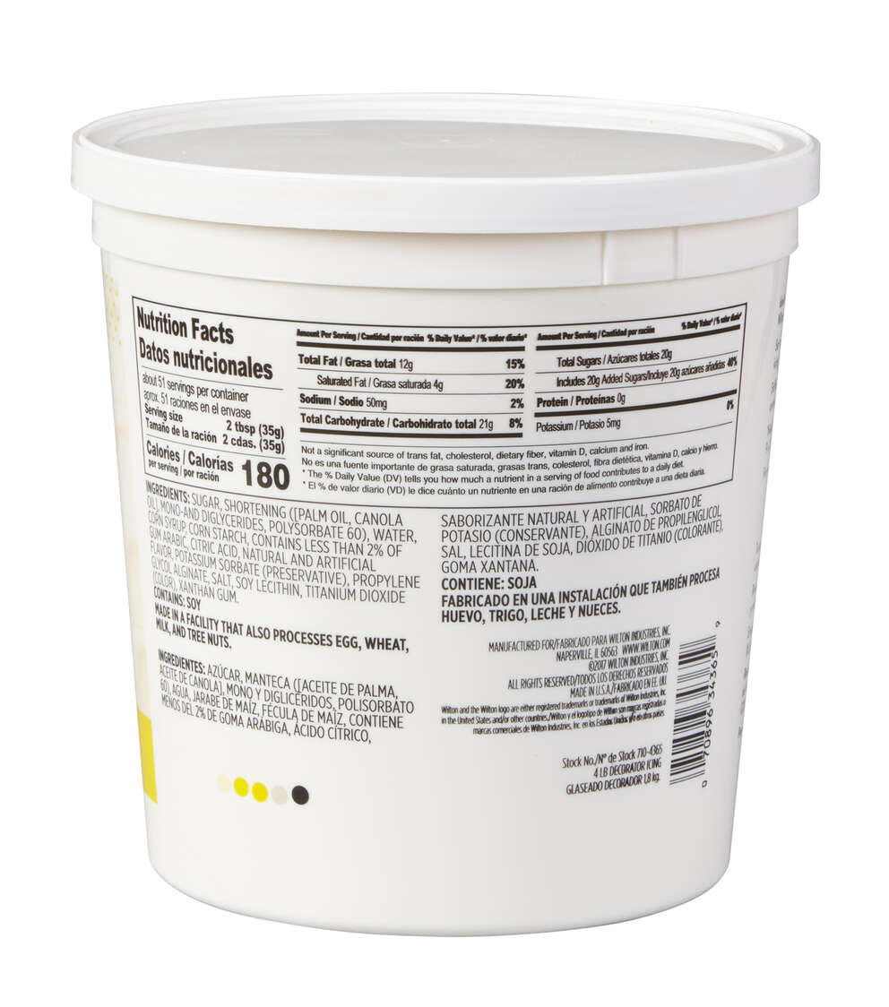 Wilton makes the only ready-to-use icing that is the perfect consistency for decorating. The pure white color is best for creating true vivid colors using Wilton Icing Colors. Ideal thin-to-medium consistency for use in Wilton Method Cake Decorating Classes in a convenient easy-carry tub. Great for spreading on cakes, making borders, messages and more. Contains 10 cups enough to decorate ten 8 or 9 in. round cake layers. Rich and creamy, with a delicious homemade taste. Certified Kosher.